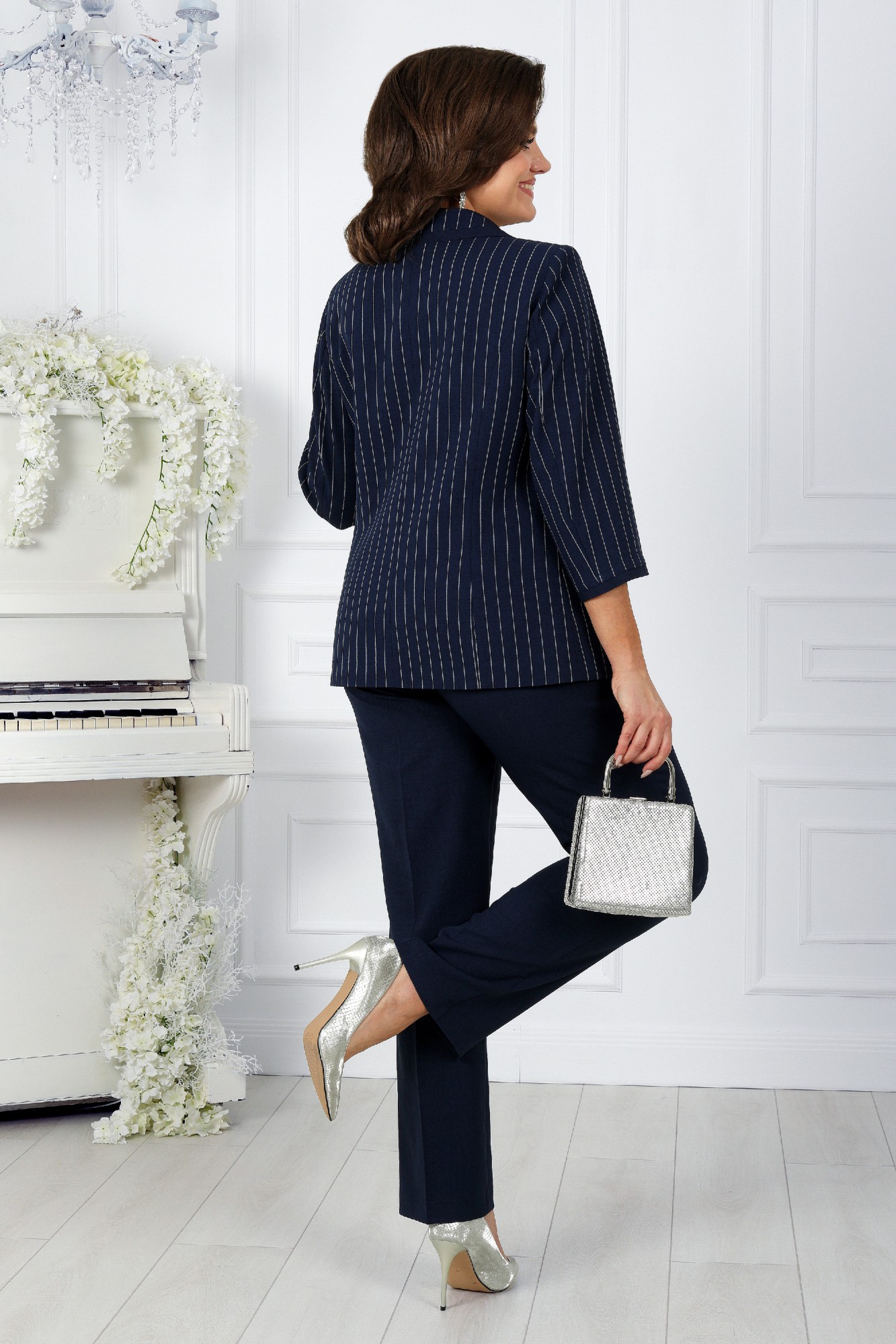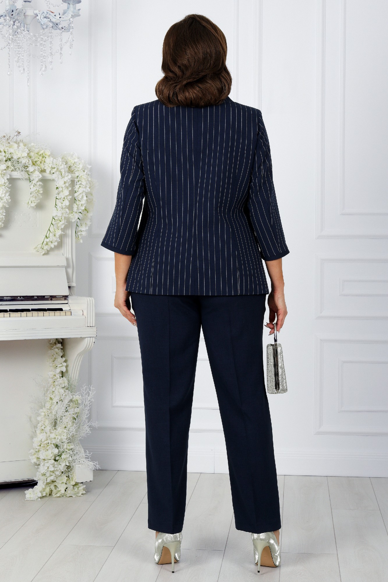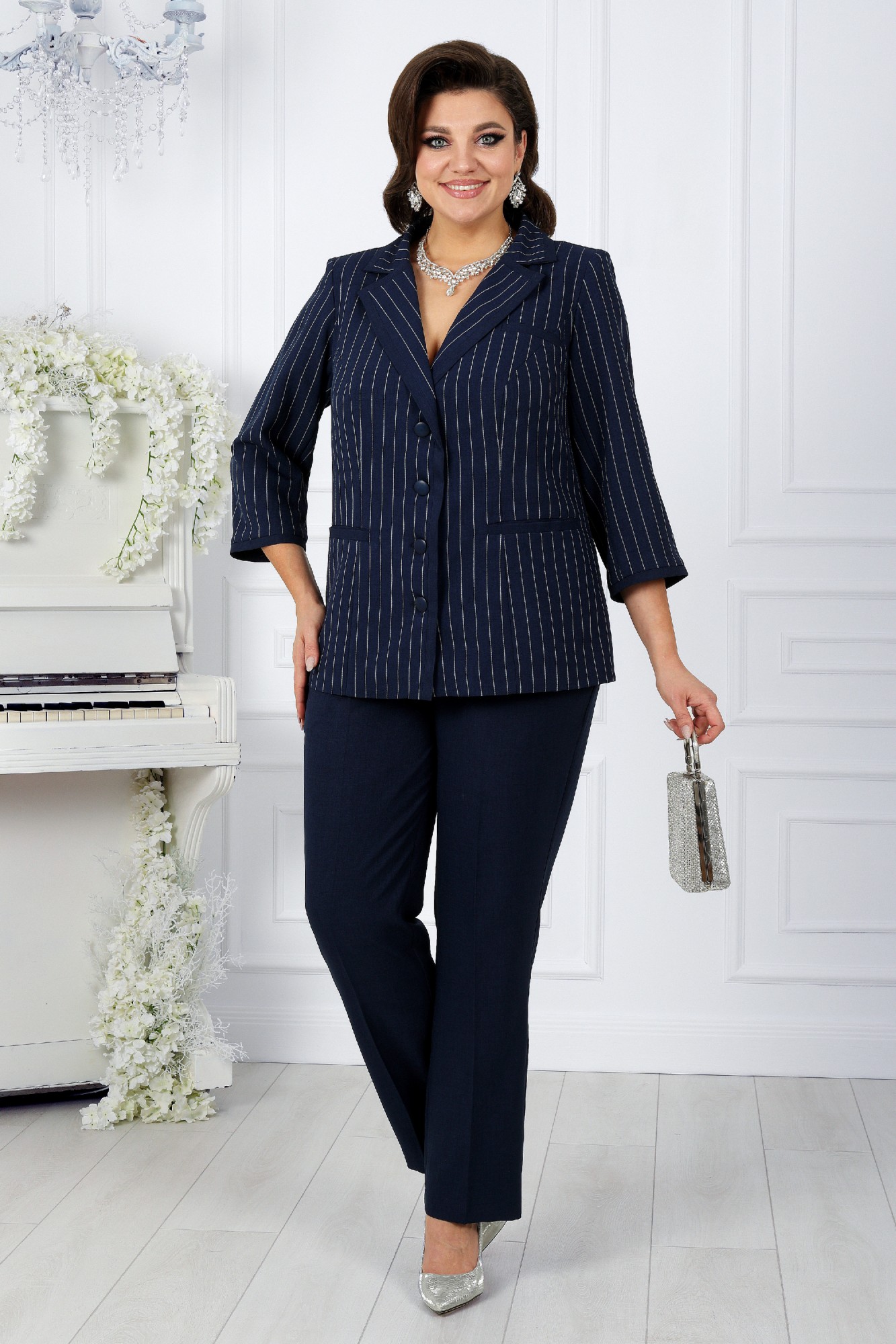Представляем вашему вниманию брючный костюм от NINELE - идеальный выбор для стильных и уверенных женщин больших размеров. Сочетание однотонной ткани и полоски на жакете создает великолепный эффект, формируя правильный силуэт фигуры для женщин больших размеров и придавая образу торжественность. Декоративные вставки из однотонной ткани в стиле Шанель добавляют образу изысканности и классического шарма. Этот костюм станет незаменимым элементом гардероба каждой женщины, ведь он универсален: подходит как для офиса, так и для торжественных мероприятий.
