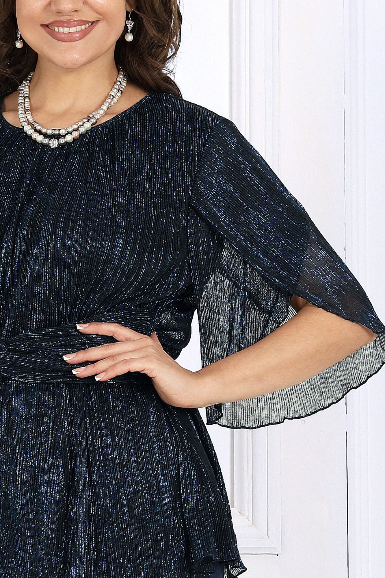 Этот праздничный костюм двойка для полных женщин — воплощение современного понимания нарядной элегантности: лёгкий, удобный, стильный и бесконечно женственный. Блузка выполнена из изысканной сетки-гофре с люрексом, которая мягко переливается при каждом движении, создавая благородное сияние. Внутренняя трикотажная подкладка обеспечивает комфорт и делает посадку идеальной даже для полных женщин. Фигурный крой и драпированный пояс с перекрутом формируют женственный силуэт — акцентируют талию, визуально вытягивая фигуру и делая её стройнее. Рукава особого фасона с разрезом добавляют легкости и движения образу, придавая наряду современное звучание и ощущение воздушности. Брюки из костюмной ткани идеально дополняют верх, создавая лаконичную вертикаль, которая делает образ ещё более пропорциональным. Этот костюм станет вашим универсальным решением: праздничный вечер, деловая встреча, торжественный ужин или новогодний приём — он уместен везде. Блузка с благородным мерцанием делает образ утончённым и эффектным, придавая нотку торжественности без излишнего блеска. Комплект брючный 2-х предметный, состоящий из блузки и брюк. Блузка женская, приталенного силуэта, выполнена из сетки-гофре с нитью «люрекс». Модель на трикотажной подкладке, без застежки и плечевых накладок. Перед дополнен задрапированным поясом с перекрутом, концы которого входят в боковые швы. Для лучшего прилегания по линии талии спинки предусмотрена кулиса с протянутой внутрь эластичной лентой. Горловина округлая, окантована узкой косой бейкой из основного материала. Рукав короткий, расширенный, с фигурным низом, переходящим в разрез, края которого по окату скреплены на запах. Брюки классические, длинные, с посадкой на талии, выполнены из костюмно- плательной ткани. Модель со стрелками. Передние и задние половинки брюк с талиевыми вытачками, направленными от пояса вниз. Спереди обработаны наклонные боковые карманы и центральная застёжка на тесьму-«молнию». Притачной пояс застегивается на 1 петлю и 1 пуговицу; для лучшего прилегания по линии талии в притачном поясе предусмотрена эластичная лента, вставленная по спинке.