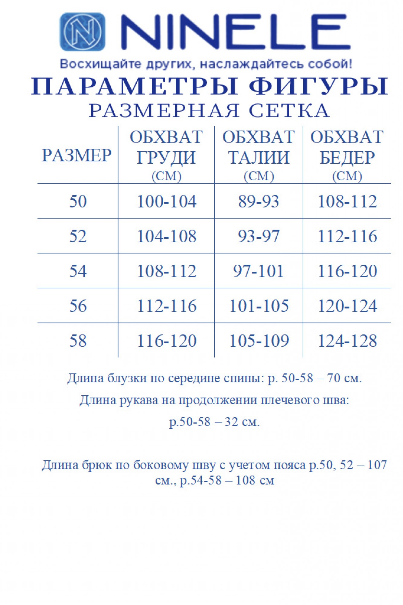 Длина брюк по боковому (с поясом) – 107 см (50-52 р-р), 108 см (54-58 р-р).