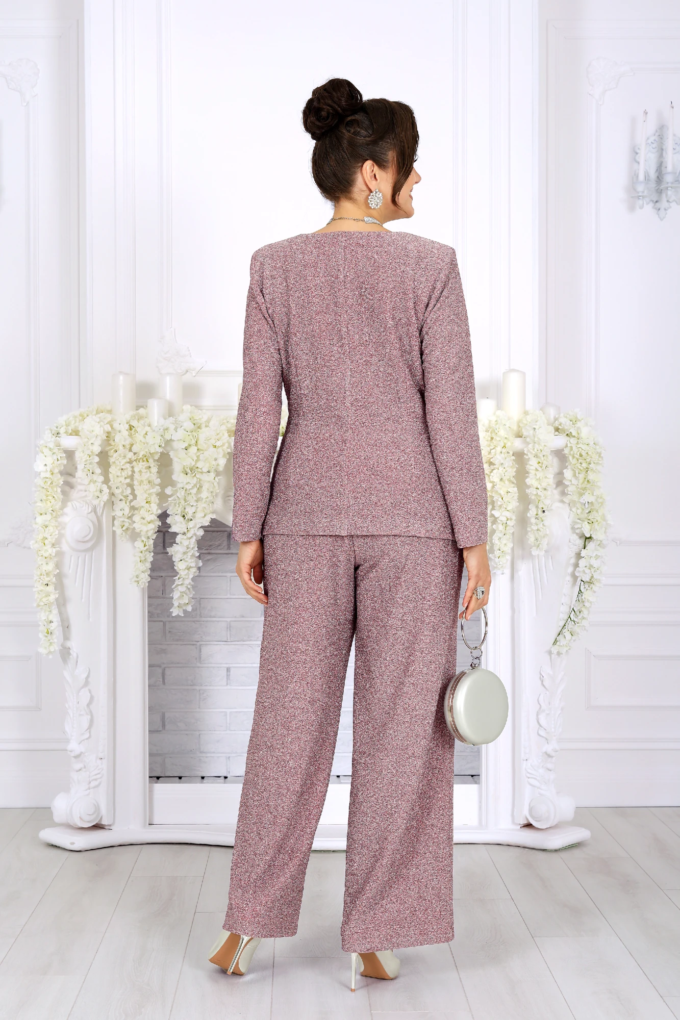 Это не просто наряд — это ваша уверенность, статус и блеск, который будет сопровождать каждый ваш шаг. В этом костюме каждая деталь продумана так, чтобы создавать ощущение безупречного стиля и лёгкой роскоши. Мягкое мерцание люрекса делает образ выразительным и дорогим, а утончённый крой подчёркивает женственность и гармонию силуэта. Блузка с асимметричной деталью по линии талии — это модный акцент, который визуально формирует стройный силуэт и придаёт образу дизайнерскую изысканность. Нежная линия декольте в обрамлении округлой горловины элегантно подчёркивает женственность. Брюки прямого силуэта с комфортной посадкой — символ утончённой простоты и свободы. Эластичный пояс обеспечивает удобство, а мерцающая фактура ткани делает их достойным элементом вечернего гардероба. Такой костюм создан для особых случаев: новогодних вечеров, корпоратива, праздничного ужина или выхода в свет, но при этом он настолько универсален, что легко впишется и в деловой стиль. Комплект брючный 2-х предметный, состоящий из блузки и брюк. Блузка полуприлегающего силуэта, выполнена из трикотажного полотна с фактурной лицевой стороной «люрекс». Модель без подкладки, с плечевыми накладками. Спинка с таллиевыми вытачками и средним швом. По линии талии в левой части переда – горизонтальный подрез с односторонними складками и отлетной деталью в шве. По линии талии в правой части переда обработан цельнокроеный пояс, край которого крепится в левом боковом шве. Горловина округлая, углубленная спереди. Рукав длинный, втачной. Длина блузки – 62 см. Длина рукава – 57 см. Брюки длинные, с посадкой на талии, выполнены из трикотажного полотна с фактурной лицевой стороной «люрекс». Модель без стрелок, без застежки. Спереди обработаны наклонные боковые карманы. Для лучшего прилегания по линии талии в притачном поясе предусмотрена эластичная лента, вставленная по всей длине. Длина брюк по боковому (с поясом) – 106 см (50-52 р-р), 107 см (54-58 р-р).