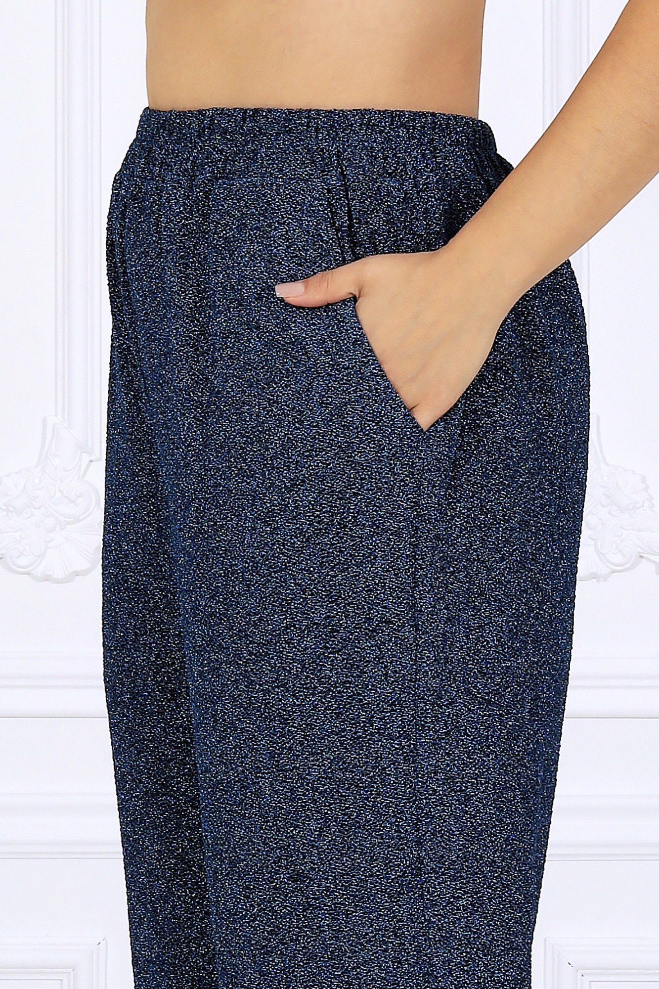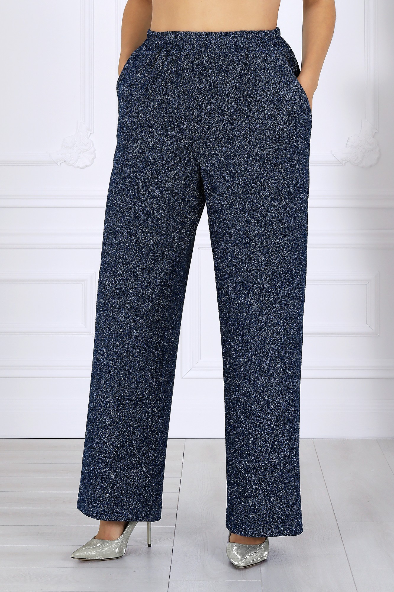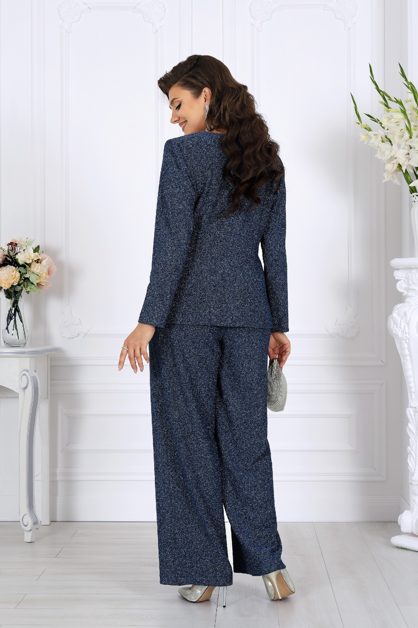Это не просто наряд — это ваша уверенность, статус и блеск, который будет сопровождать каждый ваш шаг. В этом костюме каждая деталь продумана так, чтобы создавать ощущение безупречного стиля и лёгкой роскоши. Мягкое мерцание люрекса делает образ выразительным и дорогим, а утончённый крой подчёркивает женственность и гармонию силуэта. Блузка с асимметричной деталью по линии талии — это модный акцент, который визуально формирует стройный силуэт и придаёт образу дизайнерскую изысканность. Нежная линия декольте в обрамлении округлой горловины элегантно подчёркивает женственность. Брюки прямого силуэта с комфортной посадкой — символ утончённой простоты и свободы. Эластичный пояс обеспечивает удобство, а мерцающая фактура ткани делает их достойным элементом вечернего гардероба. Такой костюм создан для особых случаев: новогодних вечеров, корпоратива, праздничного ужина или выхода в свет, но при этом он настолько универсален, что легко впишется и в деловой стиль. Комплект брючный 2-х предметный, состоящий из блузки и брюк. Блузка полуприлегающего силуэта, выполнена из трикотажного полотна с фактурной лицевой стороной «люрекс». Модель без подкладки, с плечевыми накладками. Спинка с таллиевыми вытачками и средним швом. По линии талии в левой части переда – горизонтальный подрез с односторонними складками и отлетной деталью в шве. По линии талии в правой части переда обработан цельнокроеный пояс, край которого крепится в левом боковом шве. Горловина округлая, углубленная спереди. Рукав длинный, втачной. Длина блузки – 62 см. Длина рукава – 57 см. Брюки длинные, с посадкой на талии, выполнены из трикотажного полотна с фактурной лицевой стороной «люрекс». Модель без стрелок, без застежки. Спереди обработаны наклонные боковые карманы. Для лучшего прилегания по линии талии в притачном поясе предусмотрена эластичная лента, вставленная по всей длине. Длина брюк по боковому (с поясом) – 106 см (50-52 р-р), 107 см (54-58 р-р).