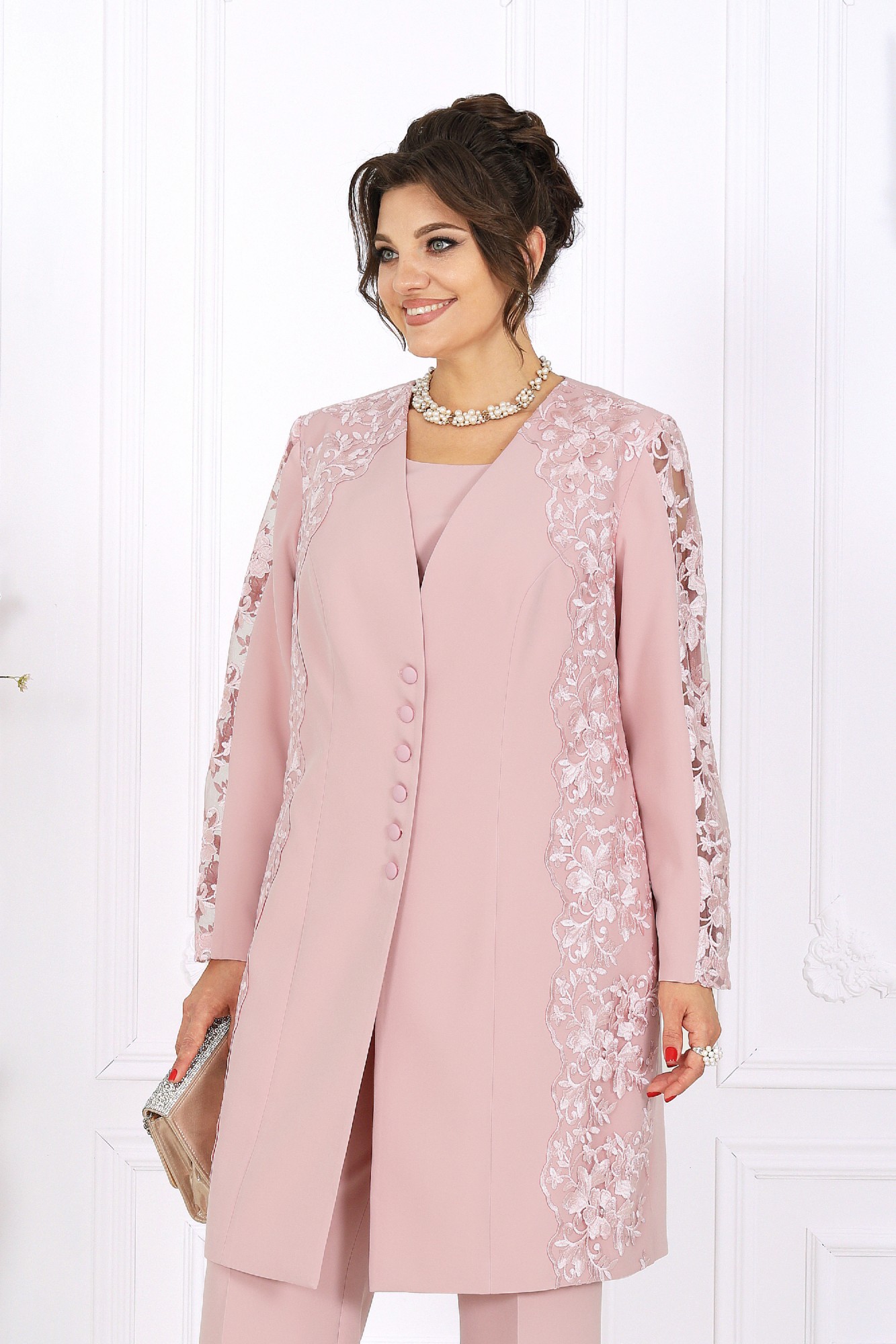 Этот костюм-тройка универсален и вне времени: он одинаково уместен на торжестве, в офисе или на важной встрече. В нём вы будете выглядеть элегантно и уверенно, будь то вечер в театре, семейное событие или праздник, где хочется блистать, сохранив безупречный вкус. Мягкий полуприлегающий силуэт формирует идеальные пропорции, а продуманные линии визуально вытягивают фигуру, создавая ощущение лёгкости и стройности. Выбирая этот наряд, вы выбираете гармонию — между комфортом и красотой, строгостью и женственностью, классикой и современностью. Это не просто костюм — это отражение вашего внутреннего достоинства и стиля. Комплект брючный 3-х предметный, состоящий из кардигана, блузки и брюк. Кардиган полуприлегающего силуэта, выполнен из костюмно-плательной ткани и гипюра. Модель без воротника и плечевых накладок. Перед на подкладке, с рельефными швами, направленными от проймы до низа, и центральной застежкой на 6 прорезных петель и 6 пуговиц. В области горловины, плеча и боковой части переда настрочены декоративные элементы из гипюра с фестонами по краю. Спинка со средним швом и рельефами, направленными от проймы до низа. Горловина округлая по спинке, спереди V-образная, углубленная. Рукав длинный, втачной, со вставкой из гипюра в верхней части. Блузка полуприлегающего силуэта, выполнена из костюмно-плательной ткани. Модель без подкладки, воротника, рукавов и плечевых накладок. Перед с нагрудными вытачками. Спинка с таллиевыми вытачками и средним швом, в верхней части которого обработана застежка на потайную тесьму-«молнию» (50 см). Горловина округлая, углубленная спереди. Брюки классические, длинные, с посадкой на талии, выполнены из костюмно- плательной ткани. Модель со стрелками. Передние и задние половинки брюк с таллиевыми вытачками, направленными от пояса вниз. Спереди обработаны наклонные боковые карманы и центральная застёжка на тесьму-«молнию». Притачной пояс застегивается на 1 петлю и 1 пуговицу; для лучшего прилегания по линии талии в притачном поясе предусмотрена эластичная лента, вставленная по спинке.