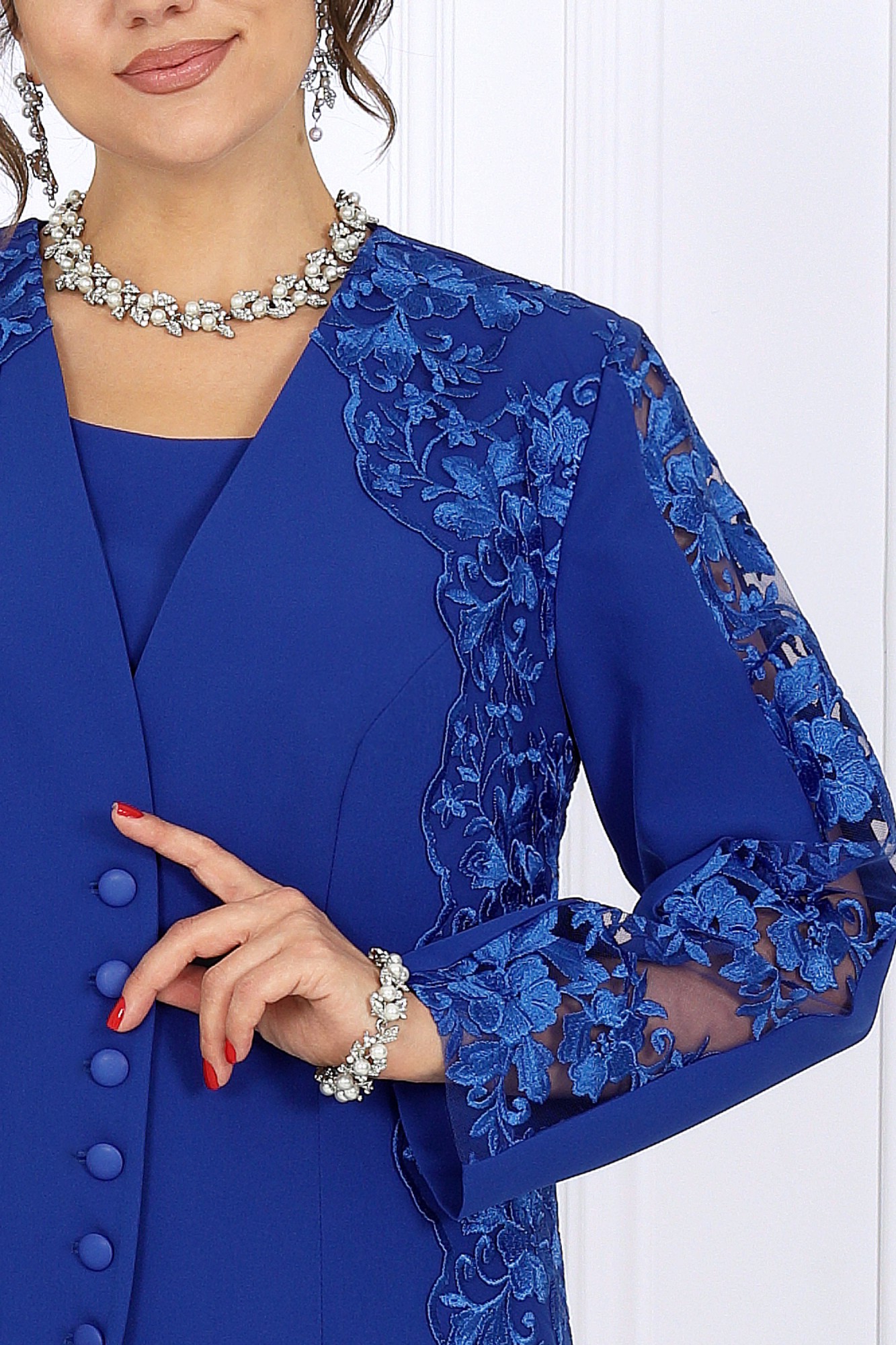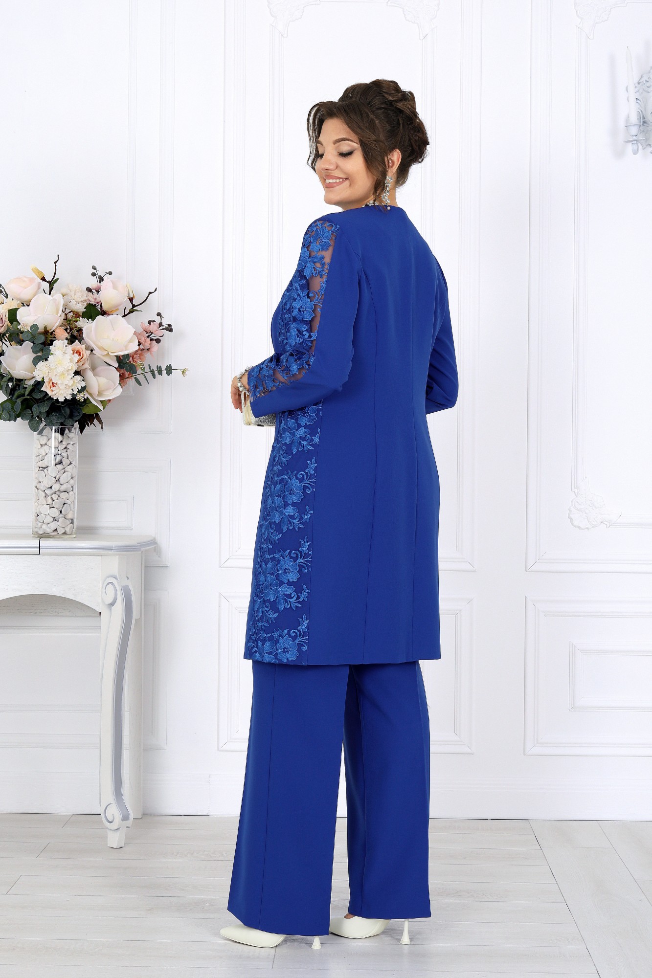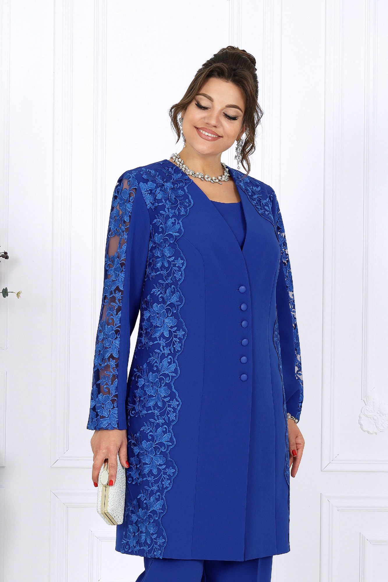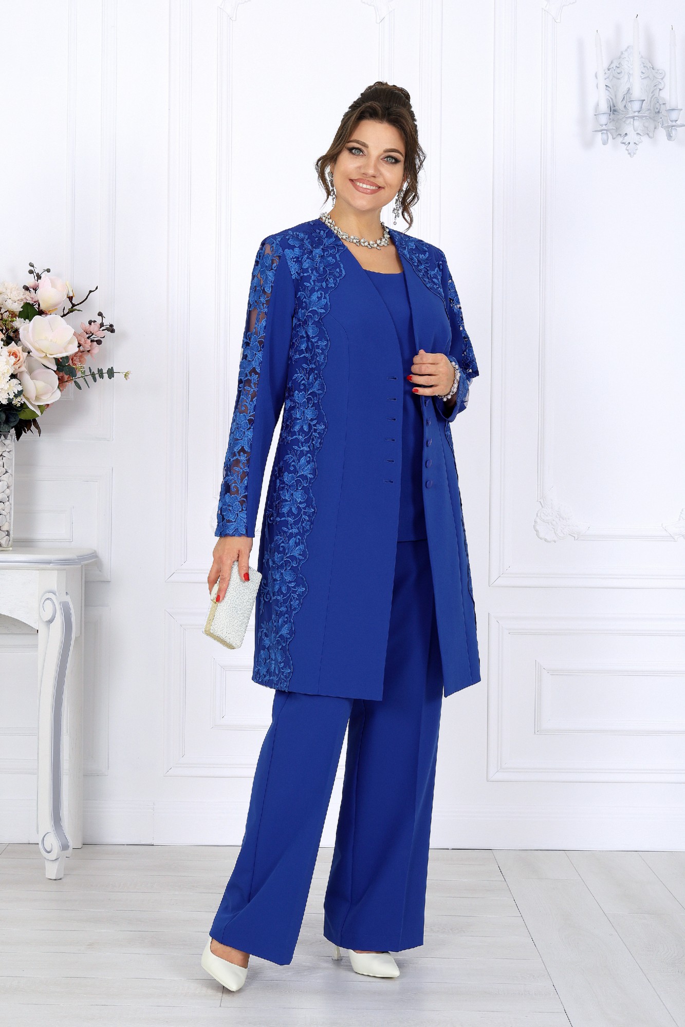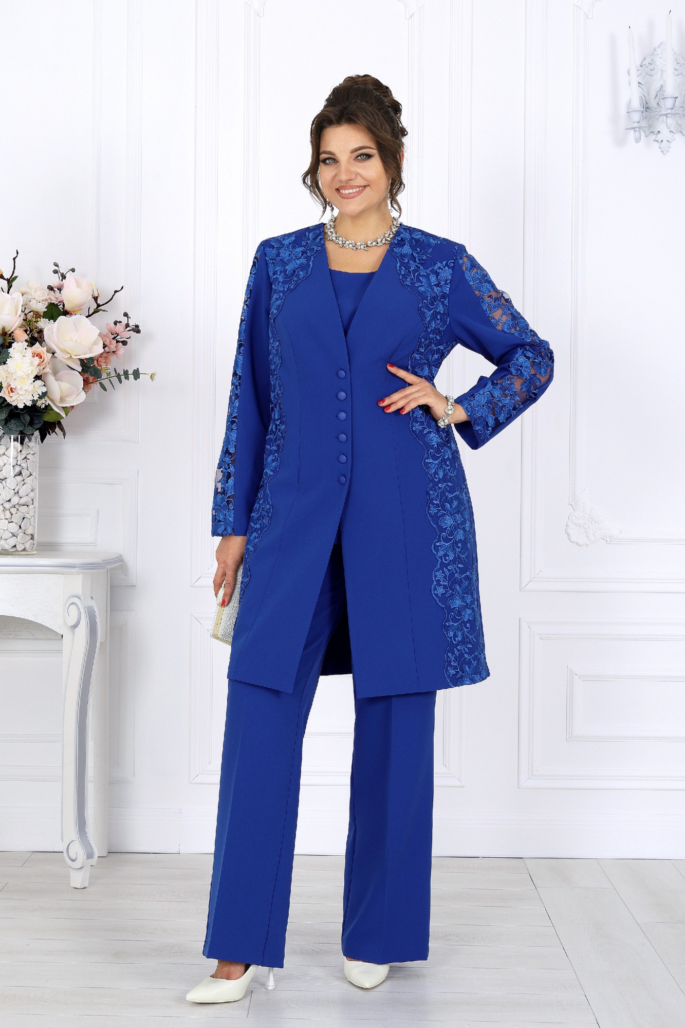 Этот костюм-тройка универсален и вне времени: он одинаково уместен на торжестве, в офисе или на важной встрече. В нём вы будете выглядеть элегантно и уверенно, будь то вечер в театре, семейное событие или праздник, где хочется блистать, сохранив безупречный вкус. Мягкий полуприлегающий силуэт формирует идеальные пропорции, а продуманные линии визуально вытягивают фигуру, создавая ощущение лёгкости и стройности. Выбирая этот наряд, вы выбираете гармонию — между комфортом и красотой, строгостью и женственностью, классикой и современностью. Это не просто костюм — это отражение вашего внутреннего достоинства и стиля. Комплект брючный 3-х предметный, состоящий из кардигана, блузки и брюк. Кардиган полуприлегающего силуэта, выполнен из костюмно-плательной ткани и гипюра. Модель без воротника и плечевых накладок. Перед на подкладке, с рельефными швами, направленными от проймы до низа, и центральной застежкой на 6 прорезных петель и 6 пуговиц. В области горловины, плеча и боковой части переда настрочены декоративные элементы из гипюра с фестонами по краю. Спинка со средним швом и рельефами, направленными от проймы до низа. Горловина округлая по спинке, спереди V-образная, углубленная. Рукав длинный, втачной, со вставкой из гипюра в верхней части. Блузка полуприлегающего силуэта, выполнена из костюмно-плательной ткани. Модель без подкладки, воротника, рукавов и плечевых накладок. Перед с нагрудными вытачками. Спинка с таллиевыми вытачками и средним швом, в верхней части которого обработана застежка на потайную тесьму-«молнию» (50 см). Горловина округлая, углубленная спереди. Брюки классические, длинные, с посадкой на талии, выполнены из костюмно- плательной ткани. Модель со стрелками. Передние и задние половинки брюк с таллиевыми вытачками, направленными от пояса вниз. Спереди обработаны наклонные боковые карманы и центральная застёжка на тесьму-«молнию». Притачной пояс застегивается на 1 петлю и 1 пуговицу; для лучшего прилегания по линии талии в притачном поясе предусмотрена эластичная лента, вставленная по спинке.