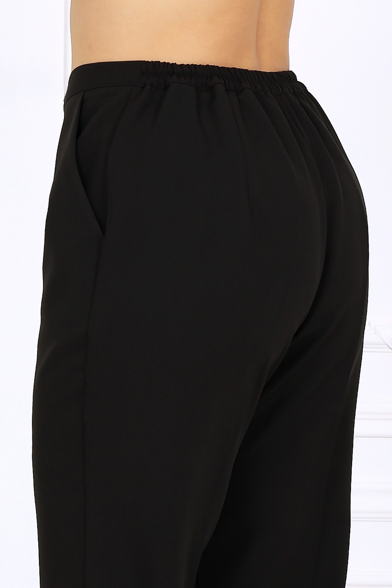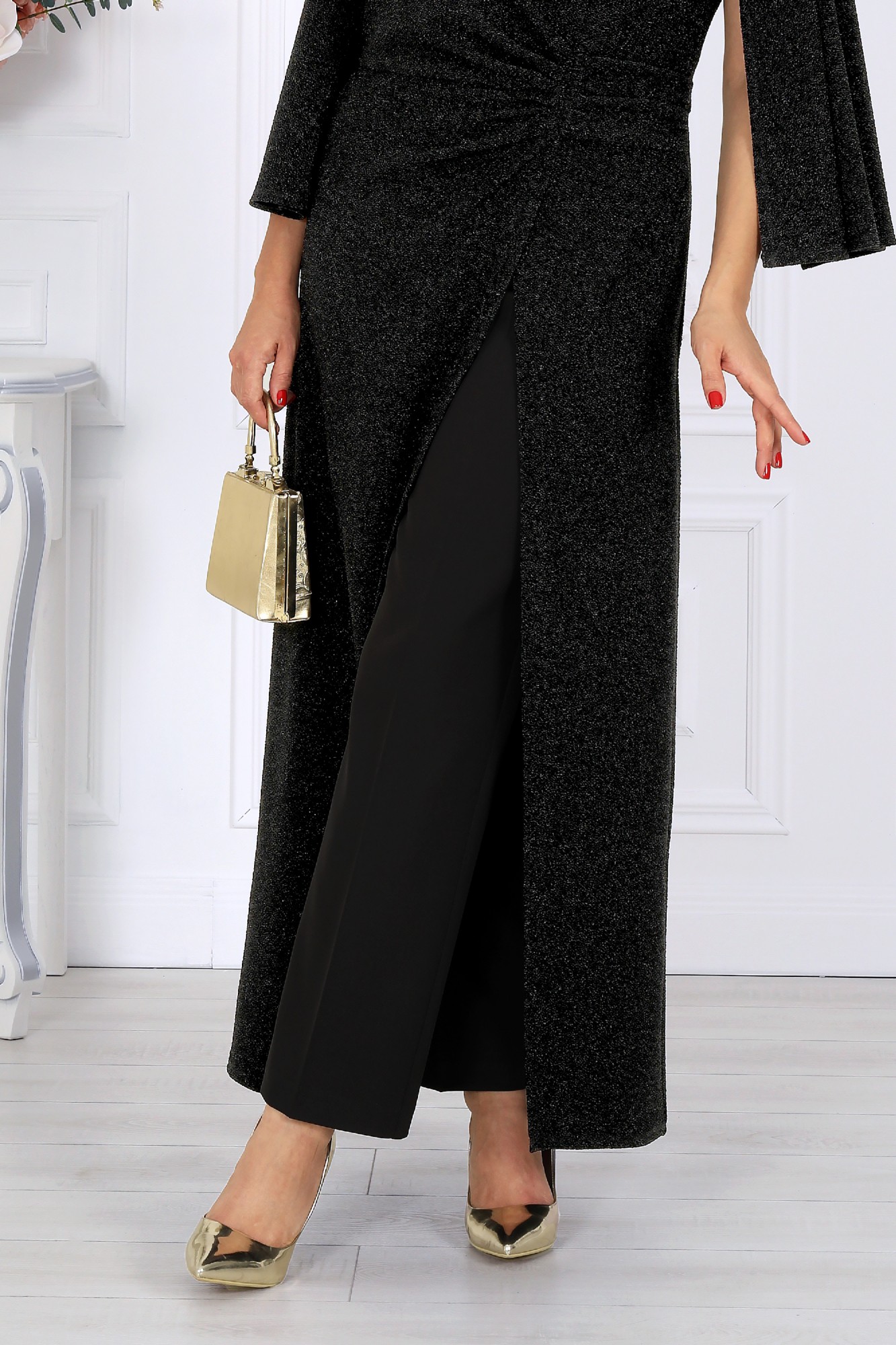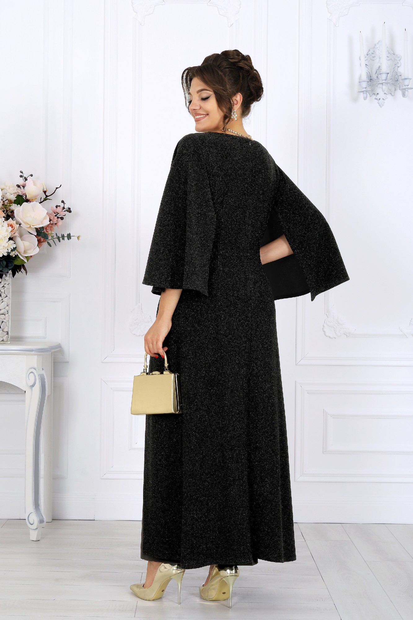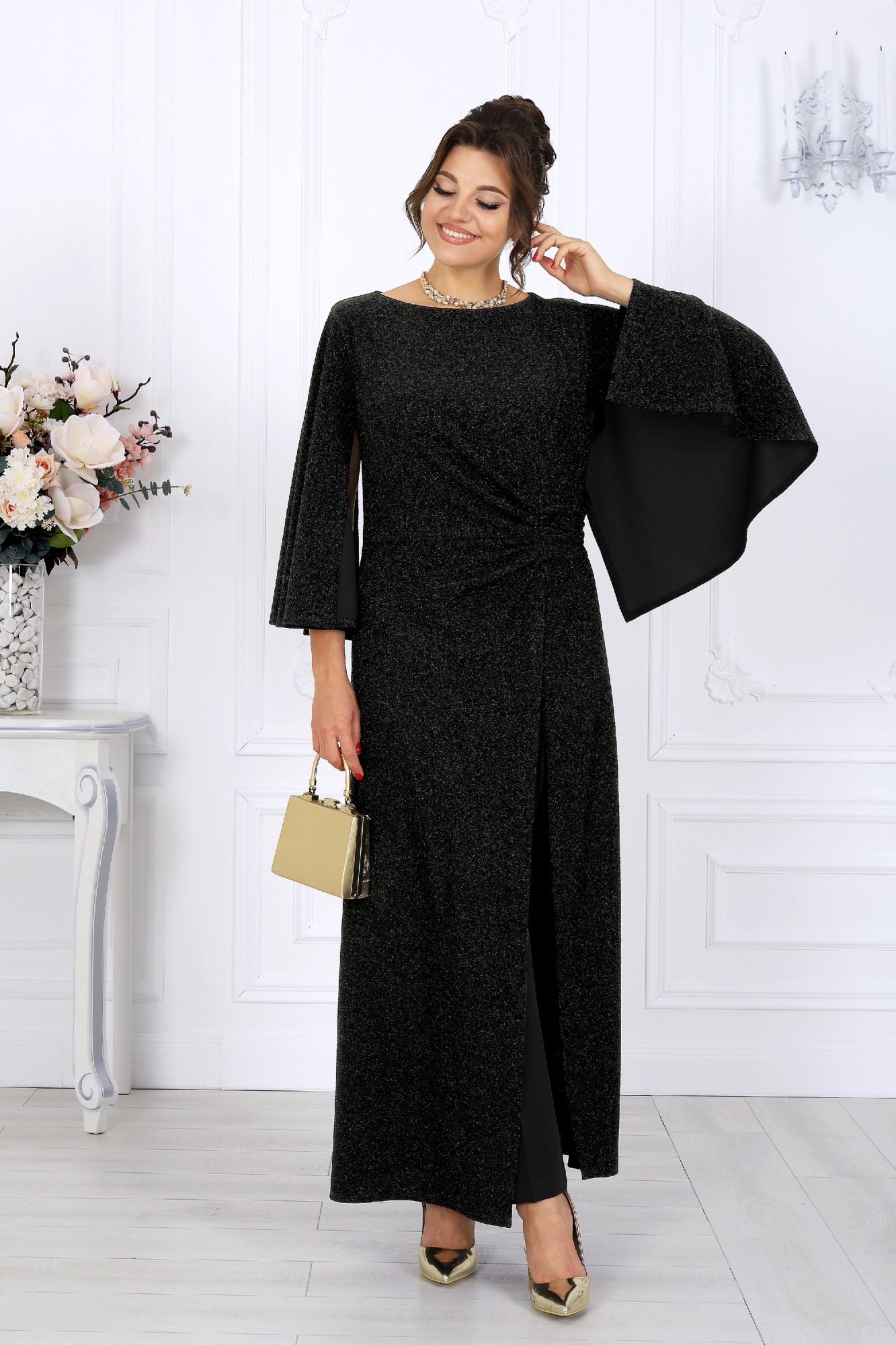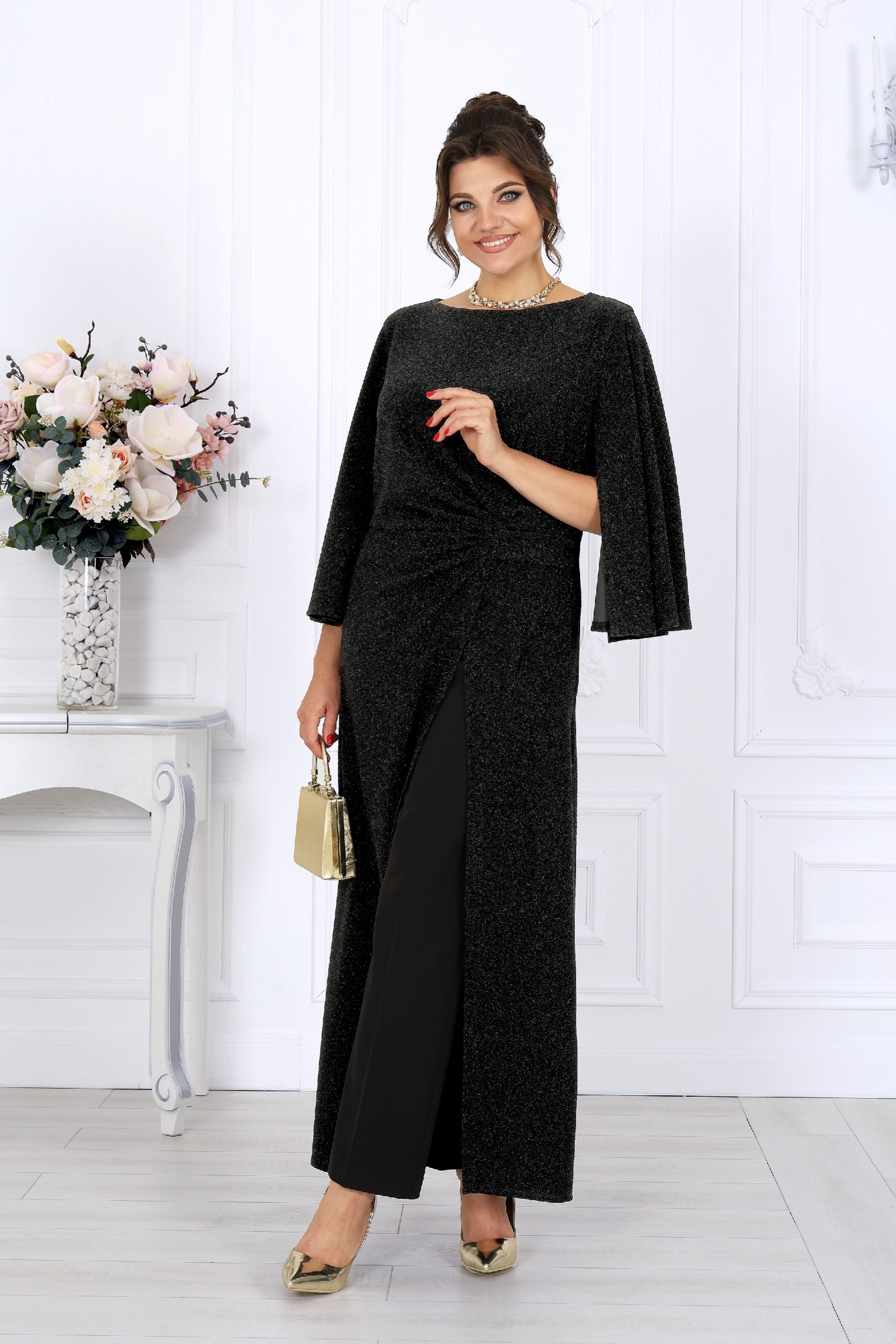 Этот элегантный костюм-двойка создан для женщин, которые ценят комфорт и изысканность в равной мере. Он словно приглашает сиять — мягкий блеск люрекса переливается в свете вечерних огней, создавая атмосферу праздника даже в обычный день. Туника свободно струится по фигуре, легко скрывая всё лишнее и подчеркивая достоинства. Драпировка по линии талии формирует красивый силуэт «песочных часов», а асимметричный запах добавляет образу динамики и утончённости. Эффектные рукава придают наряду торжественность, сохраняя при этом абсолютную лёгкость движений. Каждая деталь продумана до мелочей — от мягкой подкладки, обеспечивающей комфорт, до аккуратной потайной застёжки, сохраняющей чистоту линий. Этот наряд универсален: он уместен на праздничном приёме, корпоративе или ужине в ресторане, а также станет идеальным выбором для торжественных семейных событий. В нём комфортно, уверенно и красиво — именно так выглядит настоящая женственность в современном прочтении. Комплект брючный 2-х предметный, состоящий из туники и брюк. Туника полуприлегающего силуэта с расширением к низу, выполнена из трикотажного полотна с фактурной лицевой стороной «люрекс». Модель отрезная по линии талии; верхняя часть переда и спинки (лиф) на трикотажной подкладке. Лиф переда с одним рельефным швом, направленным от левой проймы; нижняя часть переда состоит из двух деталей, скрепленных на запах. По линии талии, вдоль рельефа, перед задрапирован сборкой и односторонними складками. На спинке обработаны таллиевые вытачки и средний шов с застежкой на потайную тесьму-«молнию» (50 см). Вырез горловины спинки и переда формы «лодочка». Рукав без шва, с отлетными краями; крепится к пройме только в верхней части. Брюки классические, длинные, с посадкой на талии, выполнены из костюмно- плательной ткани. Модель со стрелками. Передние и задние половинки брюк с таллиевыми вытачками, направленными от пояса вниз. Спереди обработаны наклонные боковые карманы и центральная застёжка на тесьму-«молнию». Притачной пояс застегивается на 1 петлю и 1 пуговицу; для лучшего прилегания по линии талии в притачном поясе предусмотрена эластичная лента, вставленная по спинке.