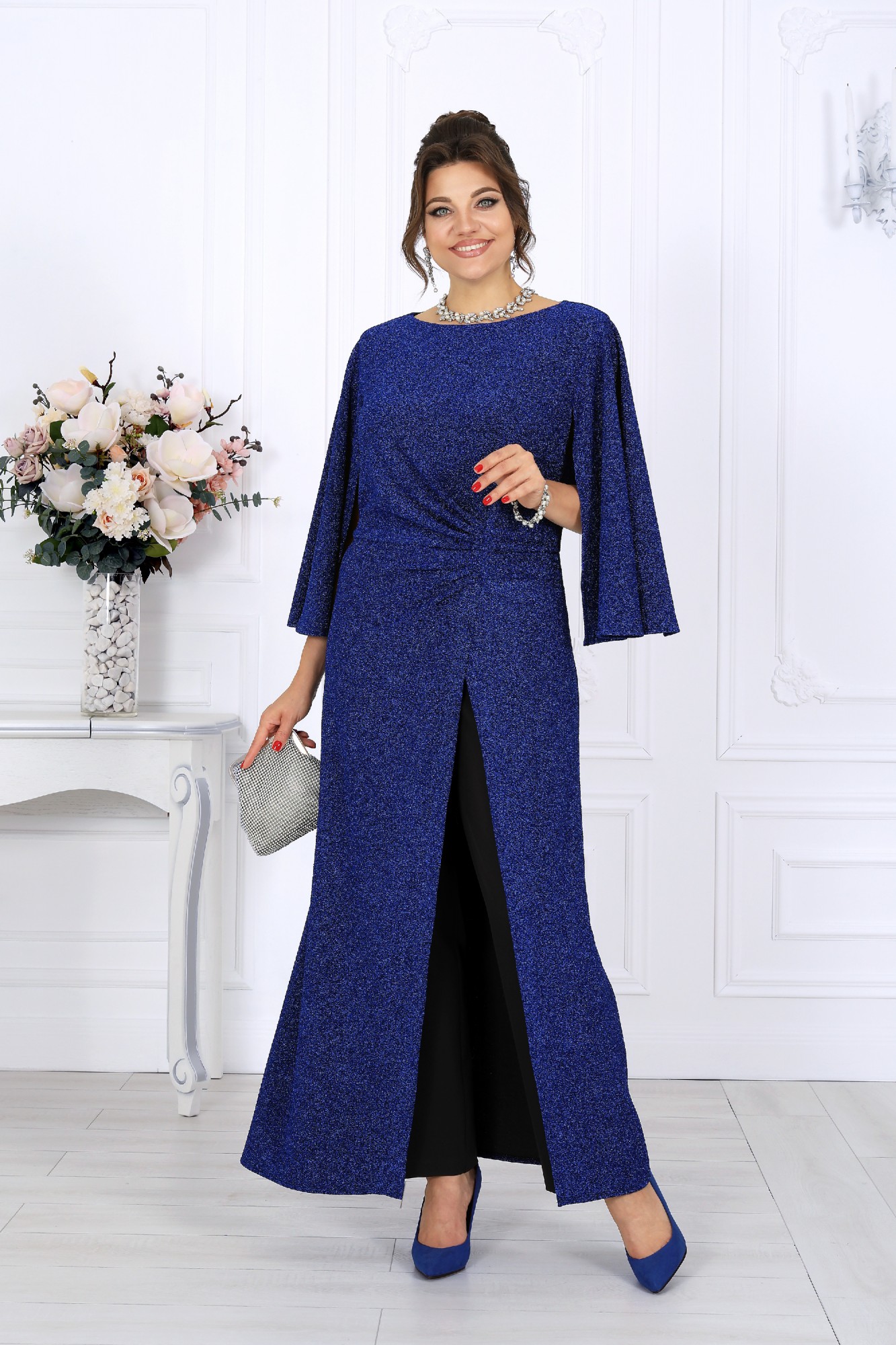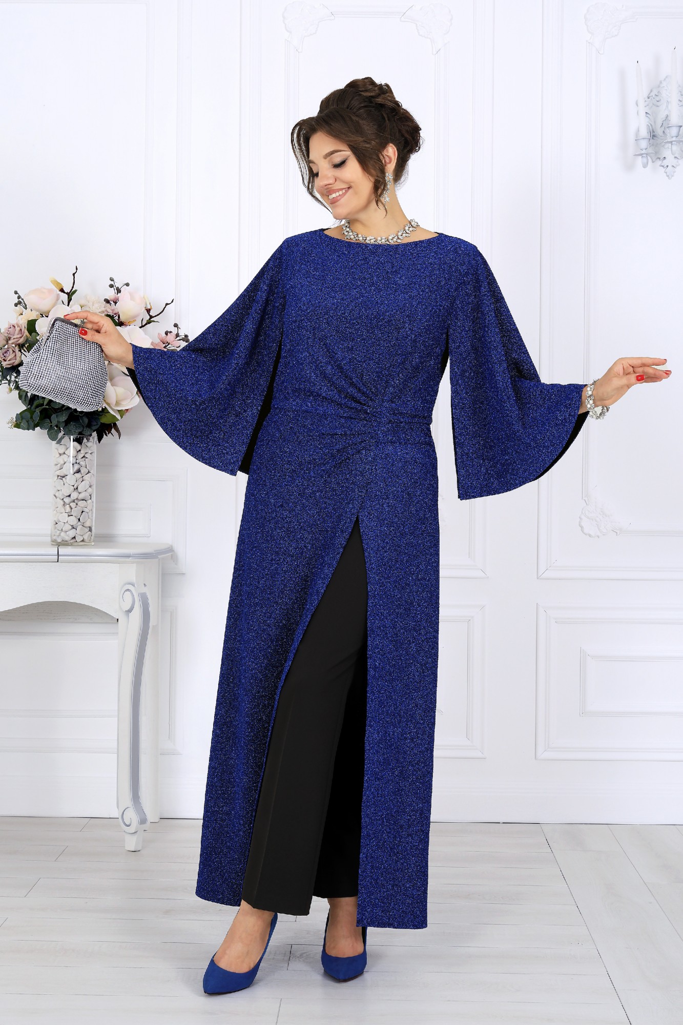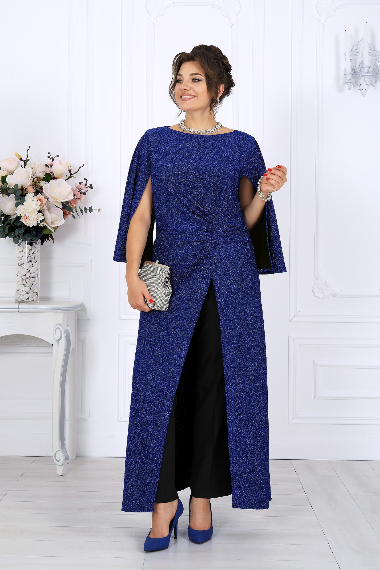 Этот элегантный костюм-двойка создан для женщин, которые ценят комфорт и изысканность в равной мере. Он словно приглашает сиять — мягкий блеск люрекса переливается в свете вечерних огней, создавая атмосферу праздника даже в обычный день. Туника свободно струится по фигуре, легко скрывая всё лишнее и подчеркивая достоинства. Драпировка по линии талии формирует красивый силуэт «песочных часов», а асимметричный запах добавляет образу динамики и утончённости. Эффектные рукава придают наряду торжественность, сохраняя при этом абсолютную лёгкость движений. Каждая деталь продумана до мелочей — от мягкой подкладки, обеспечивающей комфорт, до аккуратной потайной застёжки, сохраняющей чистоту линий. Этот наряд универсален: он уместен на праздничном приёме, корпоративе или ужине в ресторане, а также станет идеальным выбором для торжественных семейных событий. В нём комфортно, уверенно и красиво — именно так выглядит настоящая женственность в современном прочтении. Комплект брючный 2-х предметный, состоящий из туники и брюк. Туника полуприлегающего силуэта с расширением к низу, выполнена из трикотажного полотна с фактурной лицевой стороной «люрекс». Модель отрезная по линии талии; верхняя часть переда и спинки (лиф) на трикотажной подкладке. Лиф переда с одним рельефным швом, направленным от левой проймы; нижняя часть переда состоит из двух деталей, скрепленных на запах. По линии талии, вдоль рельефа, перед задрапирован сборкой и односторонними складками. На спинке обработаны таллиевые вытачки и средний шов с застежкой на потайную тесьму-«молнию» (50 см). Вырез горловины спинки и переда формы «лодочка». Рукав без шва, с отлетными краями; крепится к пройме только в верхней части. Брюки классические, длинные, с посадкой на талии, выполнены из костюмно- плательной ткани. Модель со стрелками. Передние и задние половинки брюк с таллиевыми вытачками, направленными от пояса вниз. Спереди обработаны наклонные боковые карманы и центральная застёжка на тесьму-«молнию». Притачной пояс застегивается на 1 петлю и 1 пуговицу; для лучшего прилегания по линии талии в притачном поясе предусмотрена эластичная лента, вставленная по спинке.