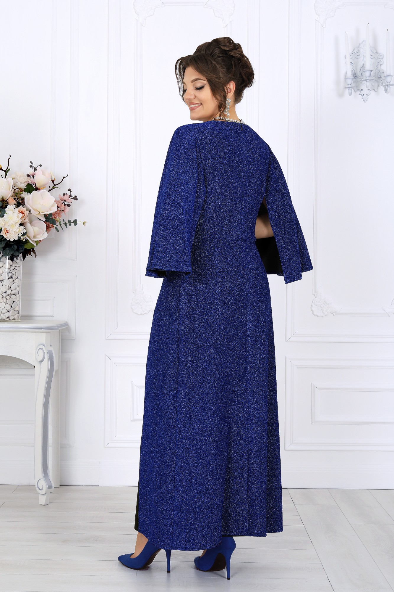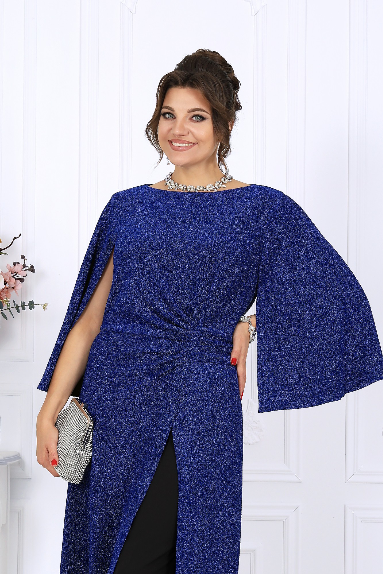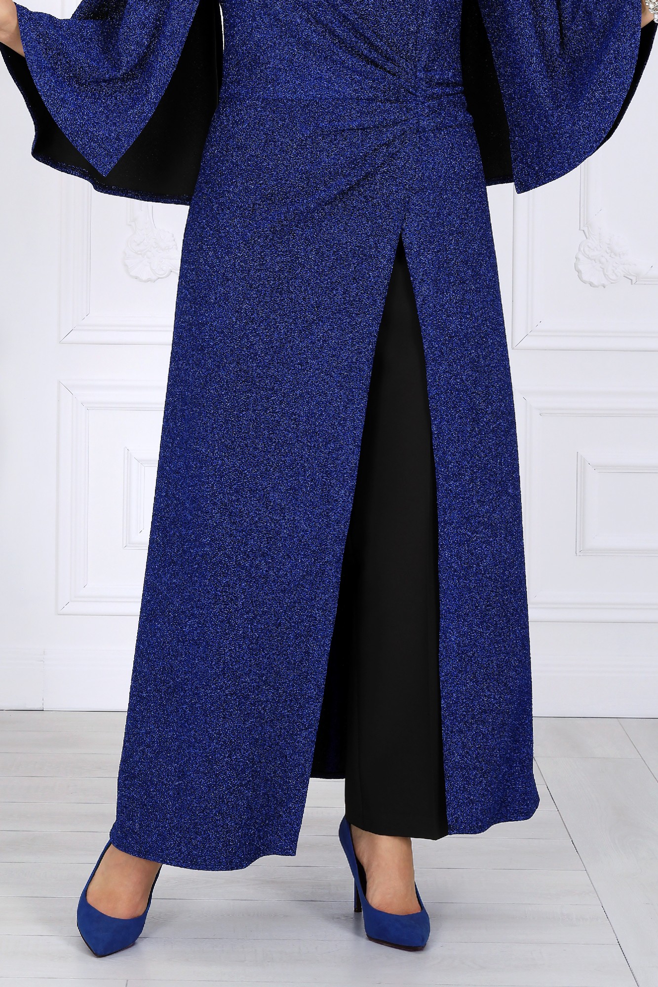 Этот элегантный костюм-двойка создан для женщин, которые ценят комфорт и изысканность в равной мере. Он словно приглашает сиять — мягкий блеск люрекса переливается в свете вечерних огней, создавая атмосферу праздника даже в обычный день. Туника свободно струится по фигуре, легко скрывая всё лишнее и подчеркивая достоинства. Драпировка по линии талии формирует красивый силуэт «песочных часов», а асимметричный запах добавляет образу динамики и утончённости. Эффектные рукава придают наряду торжественность, сохраняя при этом абсолютную лёгкость движений. Каждая деталь продумана до мелочей — от мягкой подкладки, обеспечивающей комфорт, до аккуратной потайной застёжки, сохраняющей чистоту линий. Этот наряд универсален: он уместен на праздничном приёме, корпоративе или ужине в ресторане, а также станет идеальным выбором для торжественных семейных событий. В нём комфортно, уверенно и красиво — именно так выглядит настоящая женственность в современном прочтении. Комплект брючный 2-х предметный, состоящий из туники и брюк. Туника полуприлегающего силуэта с расширением к низу, выполнена из трикотажного полотна с фактурной лицевой стороной «люрекс». Модель отрезная по линии талии; верхняя часть переда и спинки (лиф) на трикотажной подкладке. Лиф переда с одним рельефным швом, направленным от левой проймы; нижняя часть переда состоит из двух деталей, скрепленных на запах. По линии талии, вдоль рельефа, перед задрапирован сборкой и односторонними складками. На спинке обработаны таллиевые вытачки и средний шов с застежкой на потайную тесьму-«молнию» (50 см). Вырез горловины спинки и переда формы «лодочка». Рукав без шва, с отлетными краями; крепится к пройме только в верхней части. Брюки классические, длинные, с посадкой на талии, выполнены из костюмно- плательной ткани. Модель со стрелками. Передние и задние половинки брюк с таллиевыми вытачками, направленными от пояса вниз. Спереди обработаны наклонные боковые карманы и центральная застёжка на тесьму-«молнию». Притачной пояс застегивается на 1 петлю и 1 пуговицу; для лучшего прилегания по линии талии в притачном поясе предусмотрена эластичная лента, вставленная по спинке.