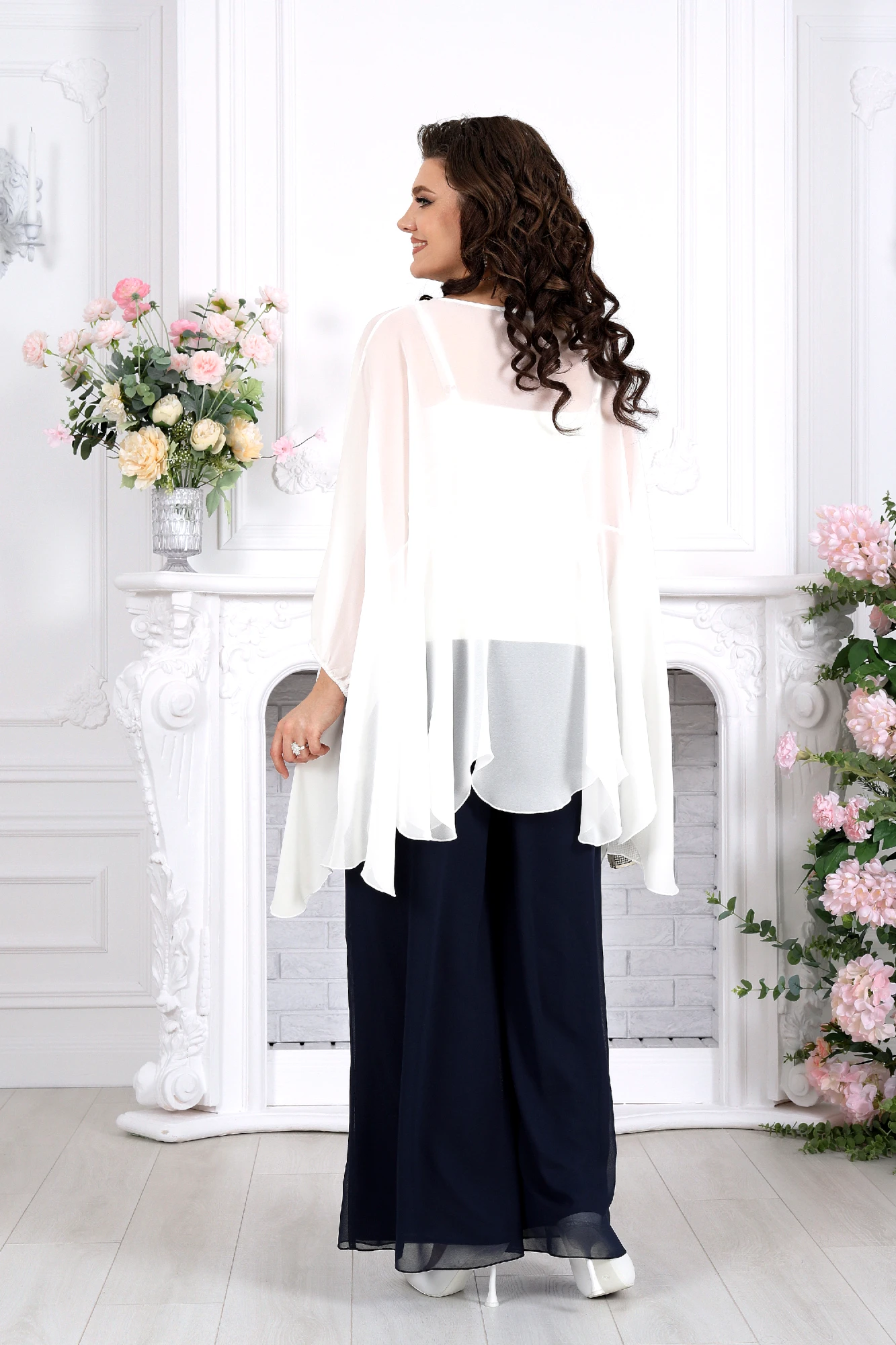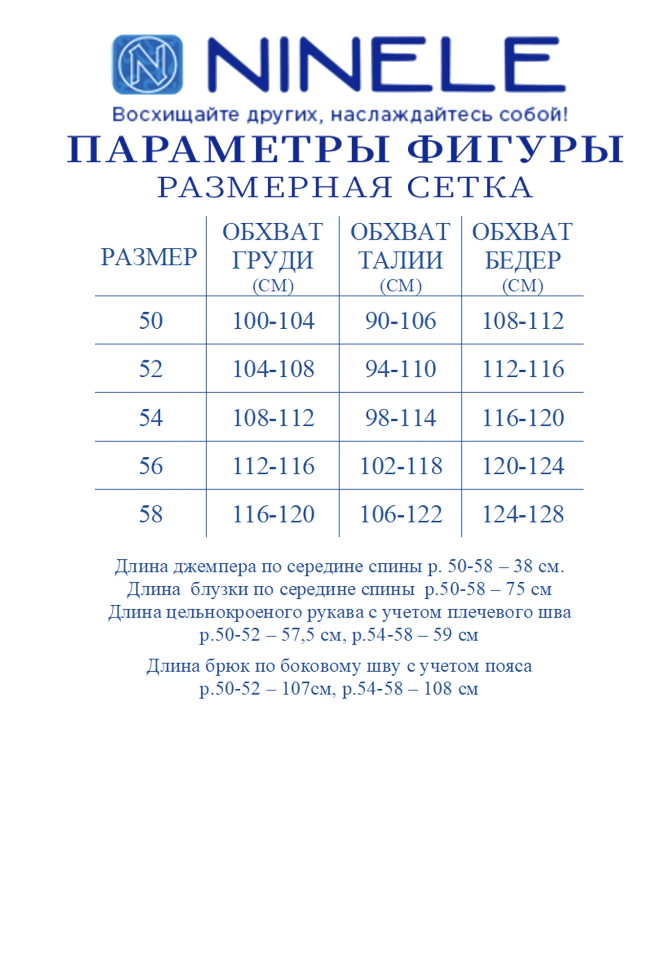 Брючный костюм 3 в 1 — легкость, которая преображает. Этот костюм — про особую эстетику: мягкие линии, воздушные ткани и ощущение свободы в каждом движении. Он создан для женщин, которые ценят комфорт, но не готовы отказываться от эффектного внешнего вида. Полупрозрачная туника словно окутывает силуэт легкой вуалью, добавляя образу загадочности и утонченности. Внутренний топ формирует аккуратную основу, а струящиеся брюки завершают ансамбль, создавая вытянутый, элегантный силуэт. Это тот случай, когда наряд выглядит дорого и сложносочинённо, но ощущается легко и непринужденно. Легкие, воздушные материалы делают комплект идеальным для весенне-летнего сезона. Он не утяжеляет образ, красиво движется при ходьбе и дарит ощущение свободы и уверенности. Комплект брючный 3-х предметный, состоящий из туники, блузки и брюк. Туника оверсайз свободного силуэта, отрезная по линии груди. Рукав цельнокроеный, по низу собран на узкую резинку. Круглый вырез горловины переда и спинки окантован. Низ туники фигурный, обработан швом «флэш». Длина туники –75,0 см (50-58 р-р); длина цельнокроенного рукава с учетом плечевого шва – 57,5 см (50-52 р-р), 59,0 см (54-58 р-р). Блузка-топ прилегающего силуэта, выполнена из вискозного трикотажного полотна. Модель без застежки, без рукавов, на регулируемых по длине узких бретелях. Верхний край переда окантован. Для лучшего прилегания изделия, в подгибку верхнего края спинки протянута эластичная лента. Длина топа (по спинке) – 38,0 см (50-58 р-р). Брюки широкие выполнены из ткани шифон на трикотажной подкладке по всей длине. Модель без стрелок и без застежки. Спереди обработаны наклонные боковые карманы. Для лучшего прилегания по линии талии в притачном поясе предусмотрена эластичная лента, вставленная по всей длине пояса. Длина брюк по боковому (с поясом) -107 см (50-52 р-р), 108 см (54-58 р-р).