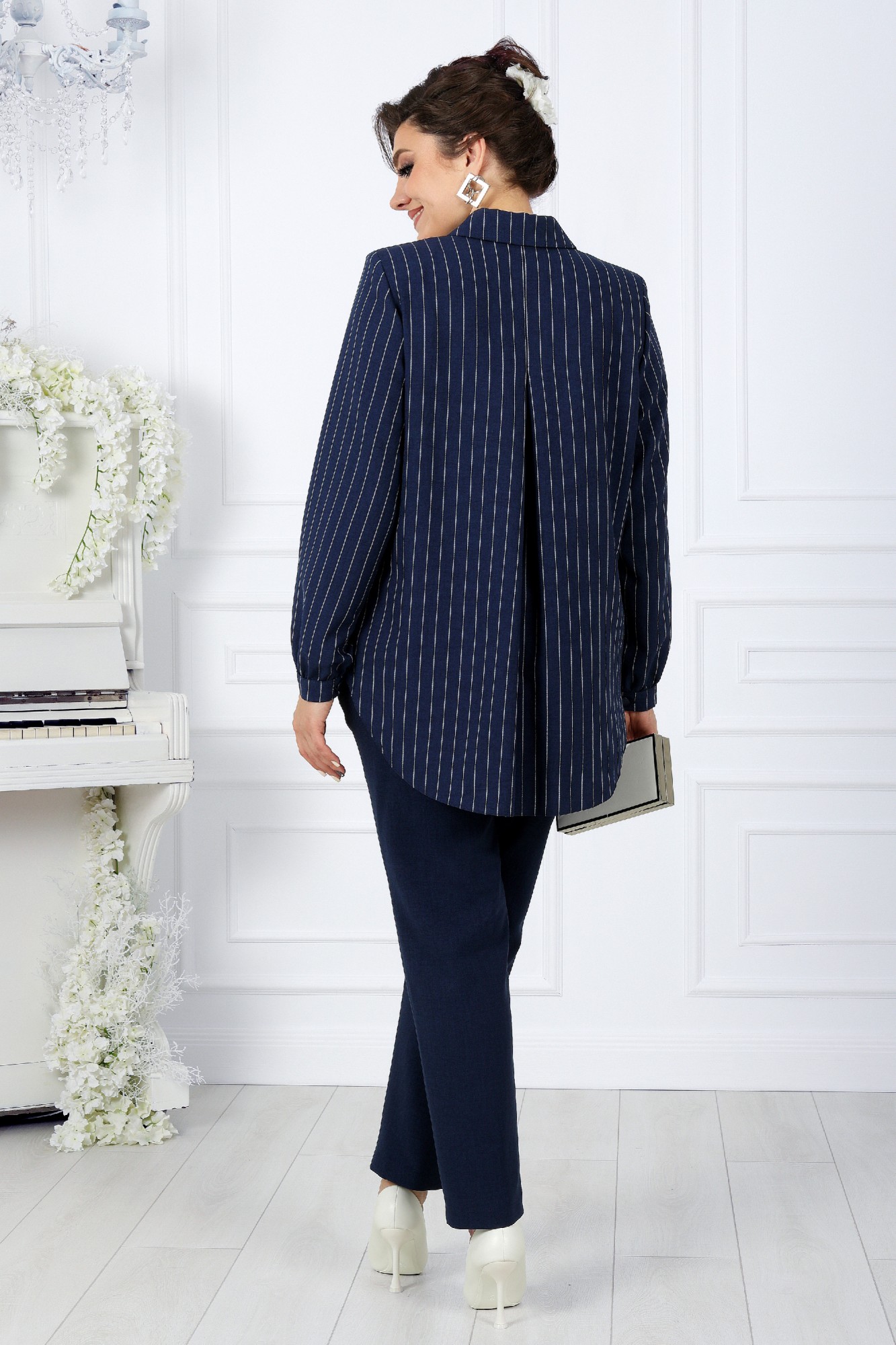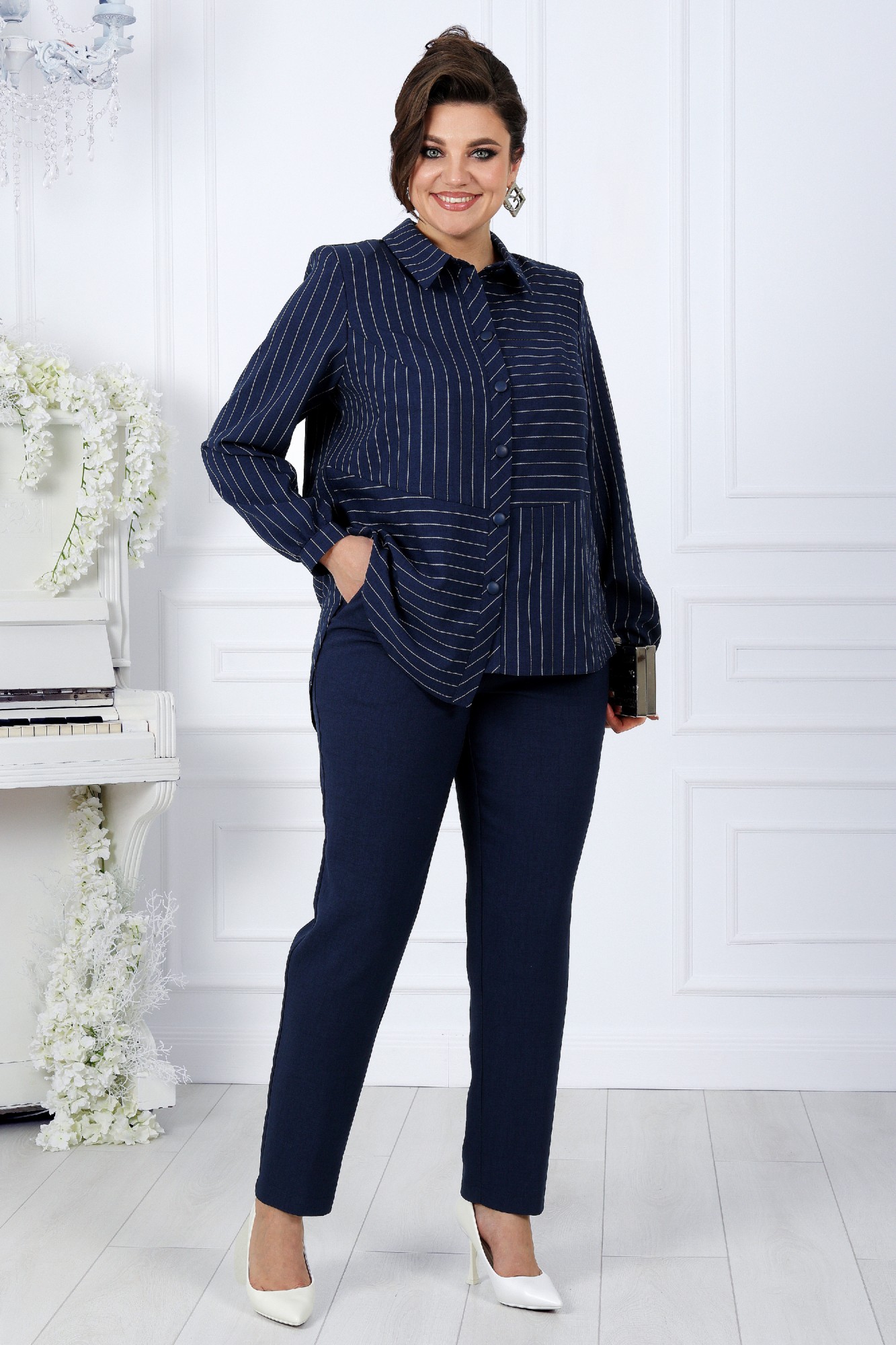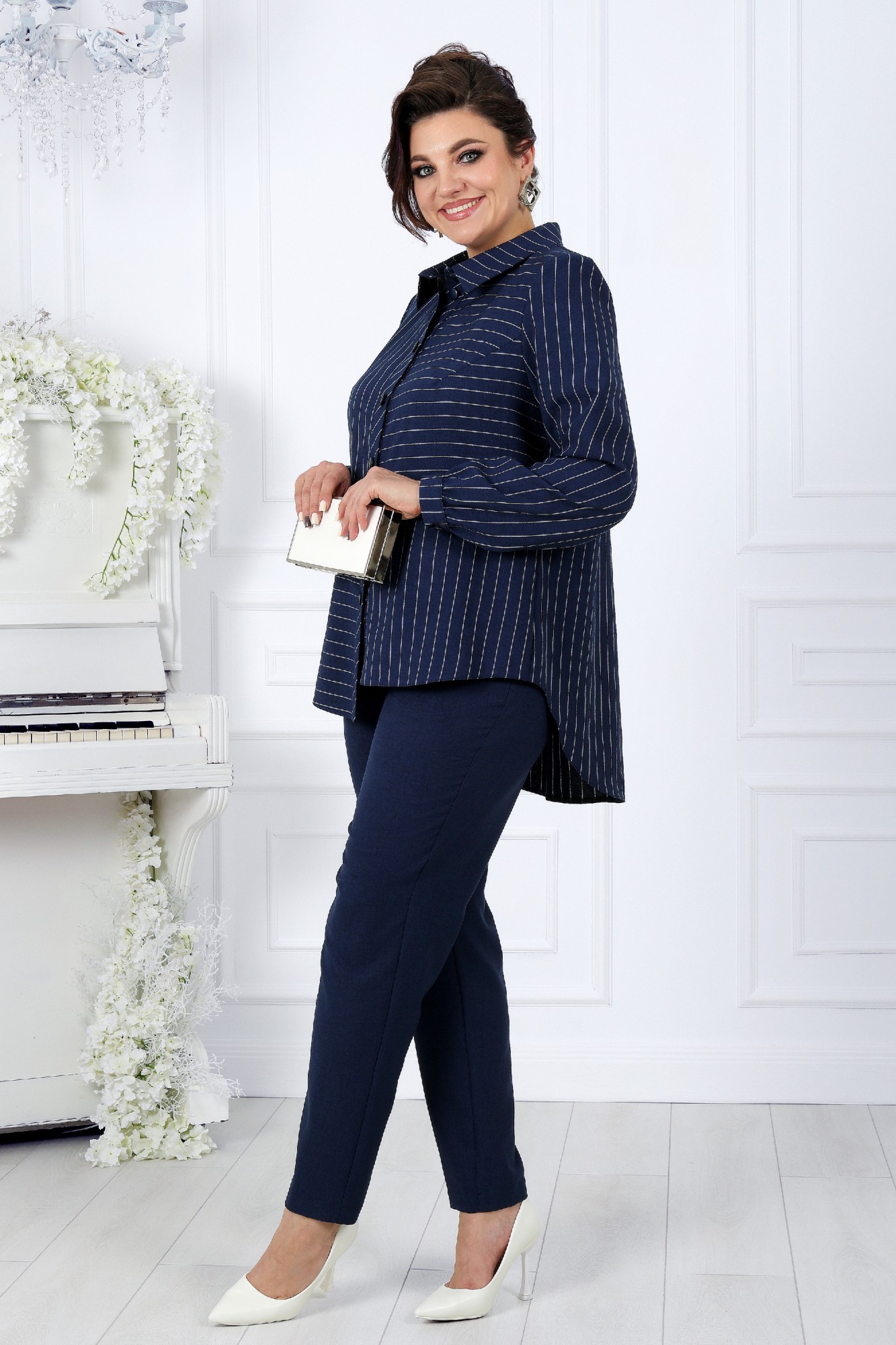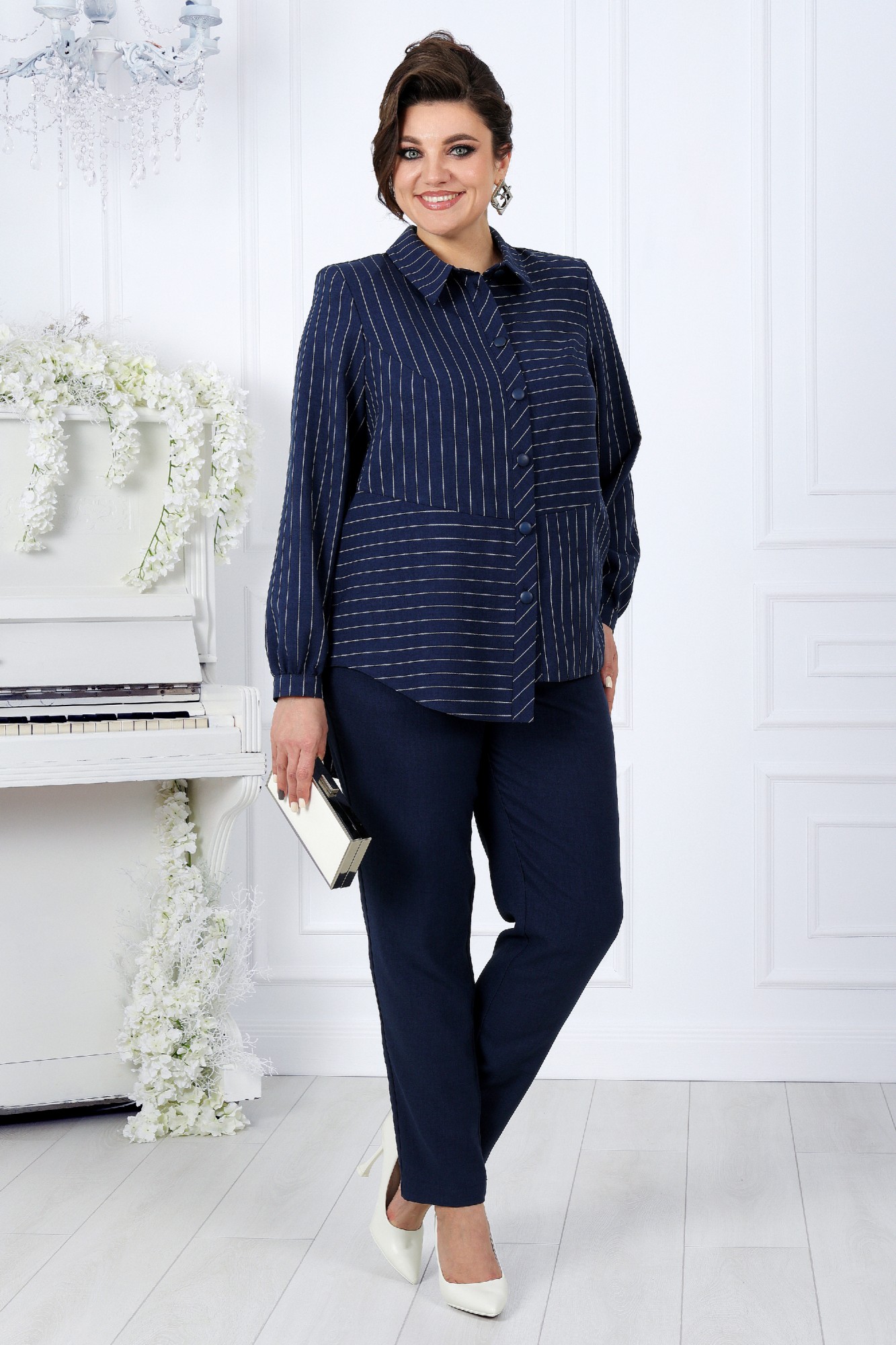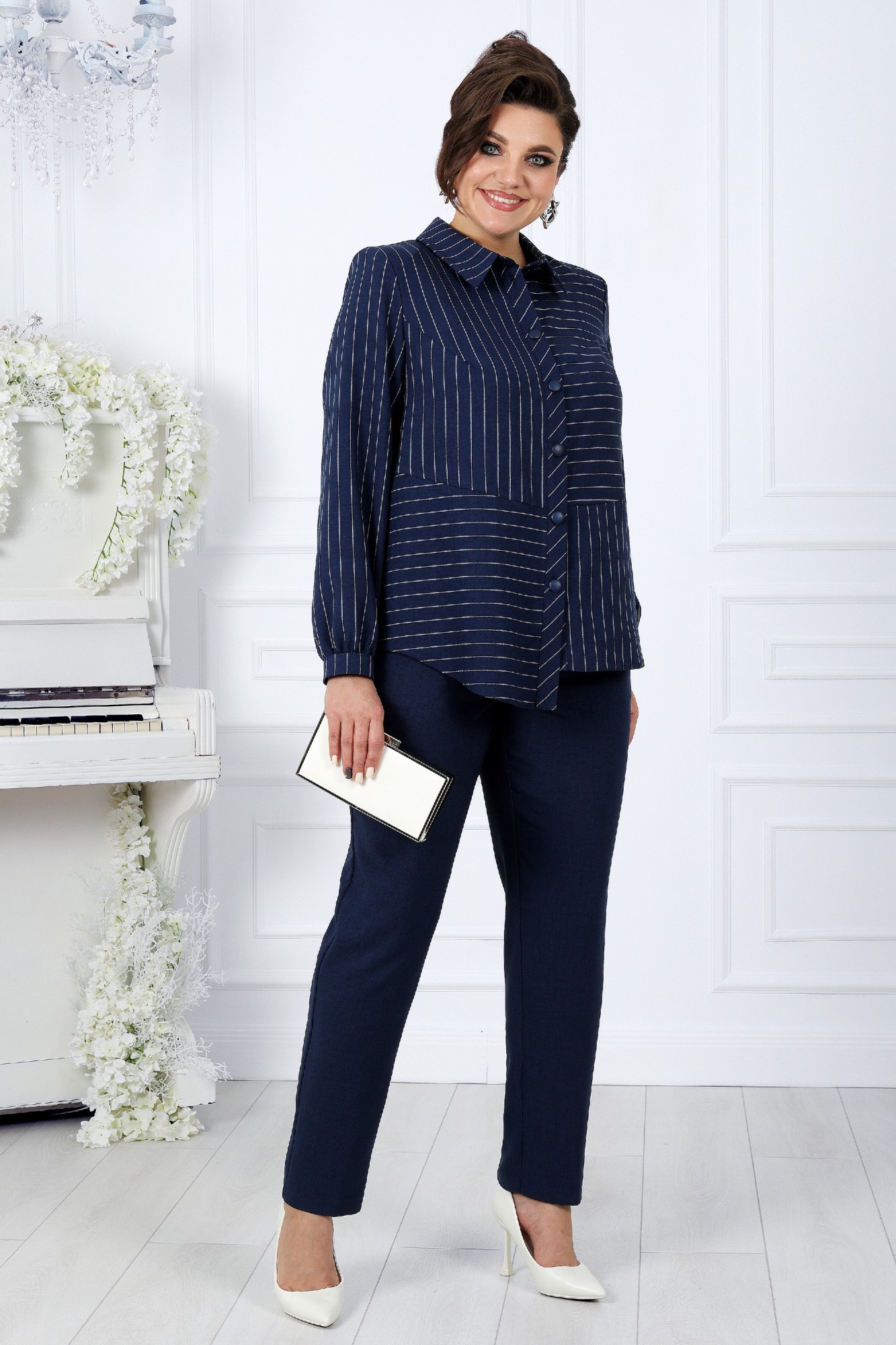 Комплект брючный 2-х предметный, состоящий из блузки, выполненной из ткани полоска лен-вишер и брюк из однотонного льна-вишера.