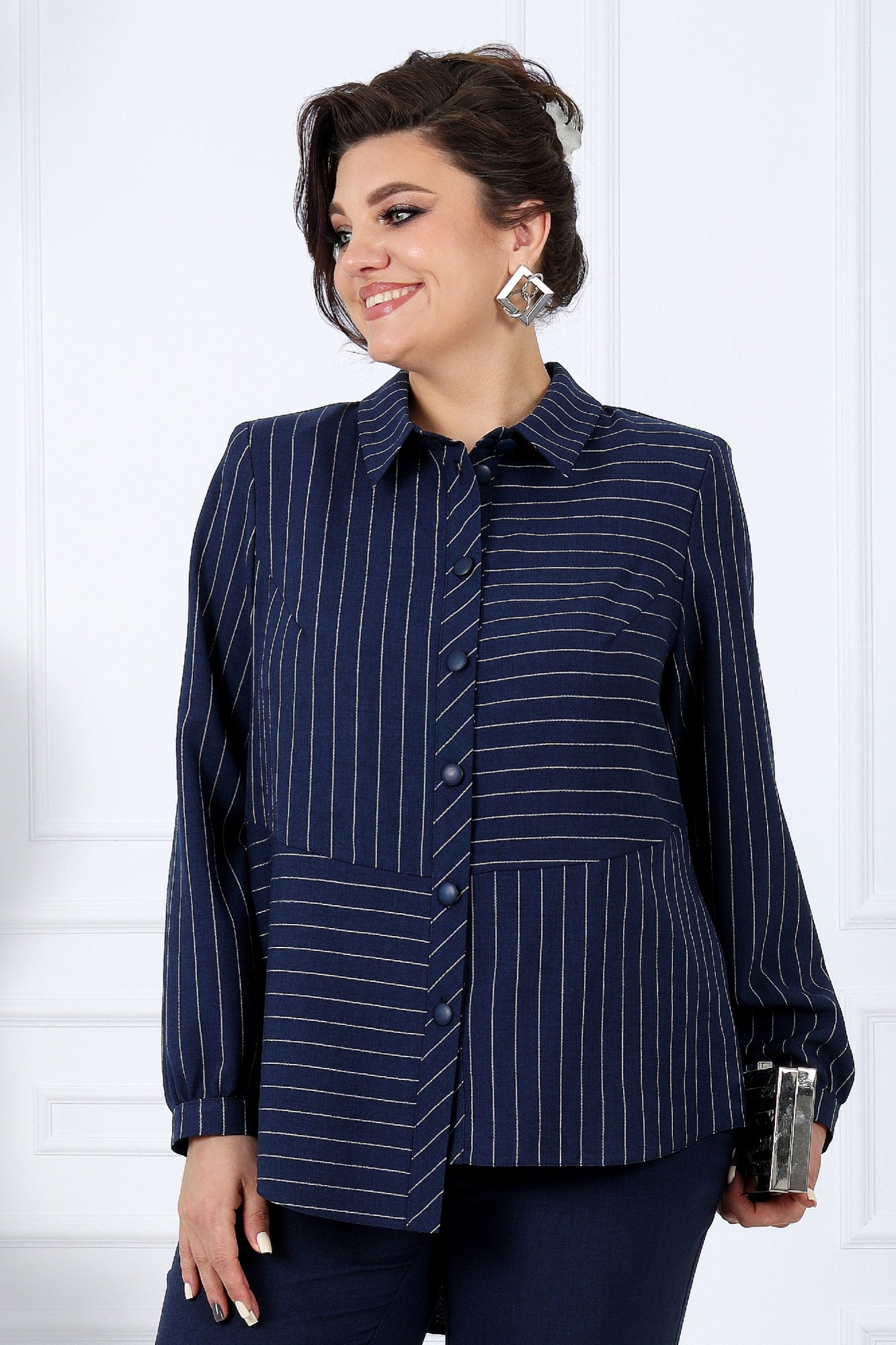 Блузка полуприлегающего силуэта, с центральной бортовой застежкой с отрезными планками на 7 петель и 7 пуговиц, со стояче-отложным воротником с отрезной стойкой.