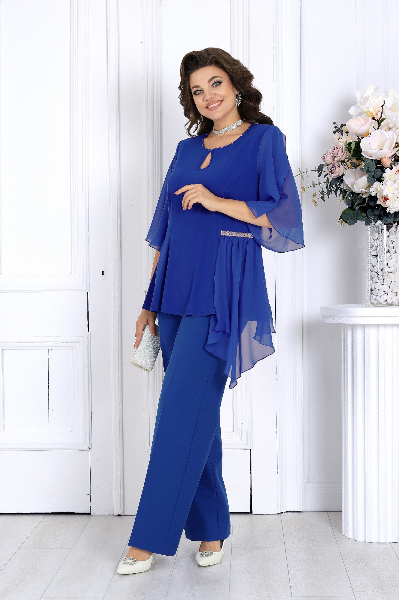 Этот костюм сочетает в себе женственность, комфорт и безупречный крой, подчеркивающий фигуру и скрывающий возможные нюансы. Воздушная блузка выполнена из мягкого трикотажа «масло» и дополнена асимметричной шифоновой деталью, создающей красивый драпирующийся силуэт. Украшение в виде страз и изящный вырез «капля» добавляют образу благородного блеска и утонченности. Легкий рукав формы «крылышко» дарит ощущение свободы и легкости движений. Классические брюки со стрелками идеально садятся по фигуре благодаря эластичной вставке в поясе и мягкой посадке на талии. Этот костюм отлично подходит для женщин с пышными формами — подчеркивает достоинства, визуально вытягивает силуэт и делает образ торжественным и уверенным. Идеален для новогодних праздников, юбилеев, вечеринок и торжеств. Комфортный и нарядный — он станет вашей любимой праздничной двойкой! Комплект брючный 2-х предметный, состоящий из блузки и брюк. Блузка полуприлегающего силуэта, выполнена из трикотажного полотна «масло». Модель без воротника и застежки. На переде и спинке обработаны рельефные швы, направленные от проймы до низа. На левой боковой части переда – горизонтальный подрез с отлетной деталью из шифона. Шов подреза декорирован тесьмой со стразами. Горловина круглой формы, окантована косой бейкой из основного полотна; спереди декорирована стразами и дополнена вырезом «капля». Рукав короткий, формы «крылышко на запах», со скругленными срезами; выполнен из шифона. Брюки классические, длинные, с посадкой на талии, выполнены из костюмно- плательной ткани. Модель со стрелками. Передние и задние половинки брюк с таллиевыми вытачками, направленными от пояса вниз. Спереди обработаны наклонные боковые карманы и центральная застёжка на тесьму-«молнию». Притачной пояс застегивается на 1 петлю и 1 пуговицу; для лучшего прилегания по линии талии в притачном поясе предусмотрена эластичная лента, вставленная по спинке.