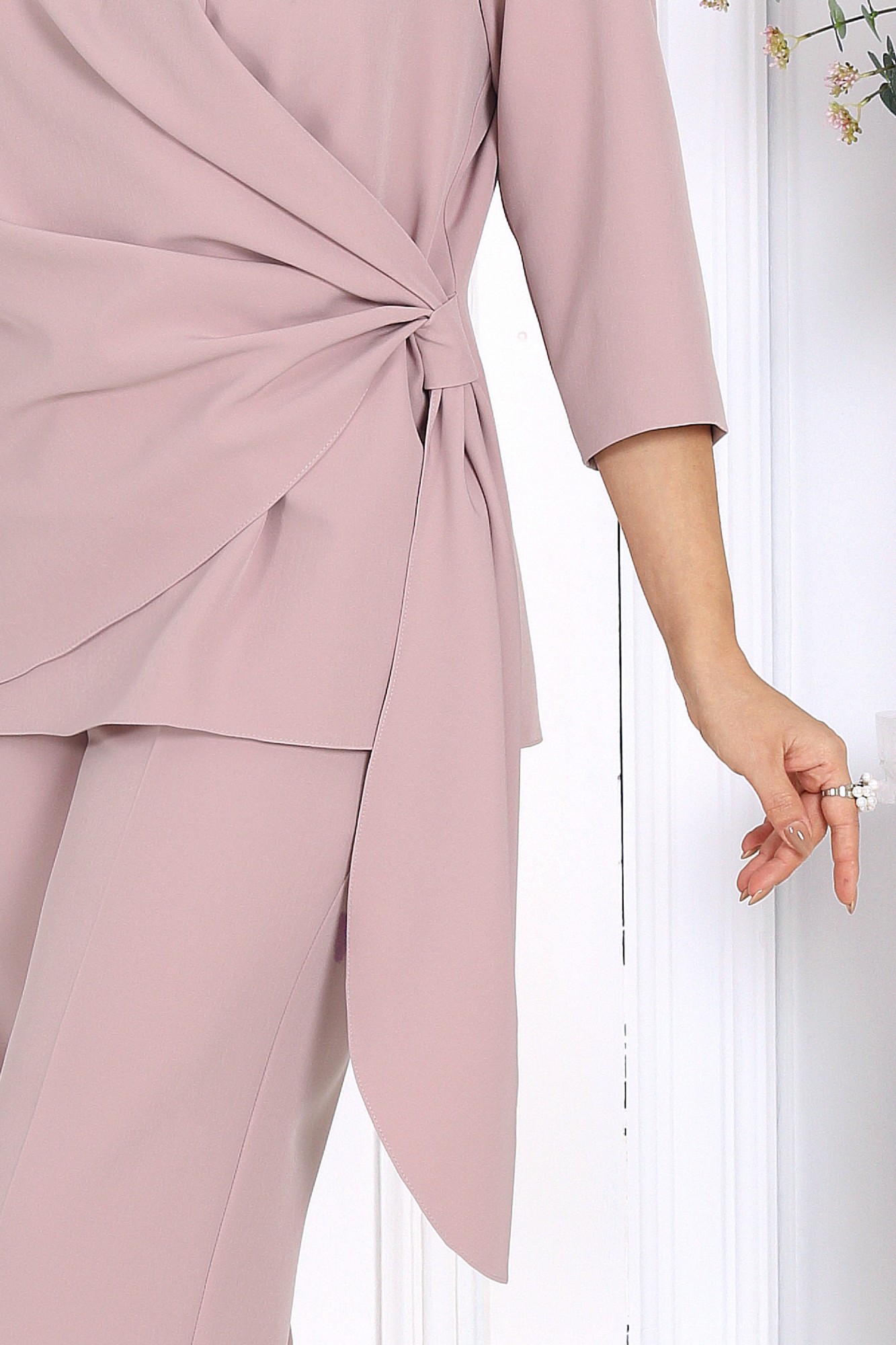 Брючный костюм — идеальный выбор для торжества. Элегантная вечерняя блузка на запах и брюки со стрелками создают утончённый силуэт и визуально стройнят. Модель выполнена из качественной костюмной ткани, украшена кружевом в области декольте. Подойдёт как нарядный костюм на праздник, новогодний вечер, юбилей, встречу гостей или официальный ужин. Комплект брючный 2-х предметный, состоящий из блузки и брюк. Блузка полуприлегающего силуэта, выполнена из костюмно-плательной ткани. Модель без застежки, с плечевыми накладками. Перед состоит из двух деталей, скрепленных между собой на запах: левая деталь переда входит в правый боковой шов, правая деталь – протянута в шлевку левого бокового шва. Спинка с таллиевыми вытачками и горловиной округлой формы. Горловина переда декорирована аппликацией из кружева. Рукав втачной, трехчетвертной. Брюки классические, длинные, с посадкой на талии, выполнены из костюмно- плательной ткани. Модель со стрелками. Передние и задние половинки брюк с таллиевыми вытачками, направленными от пояса вниз. Спереди обработаны наклонные боковые карманы и центральная застёжка на тесьму-«молнию». Притачной пояс застегивается на 1 петлю и 1 пуговицу; для лучшего прилегания по линии талии в притачном поясе предусмотрена эластичная лента, вставленная по спинке.