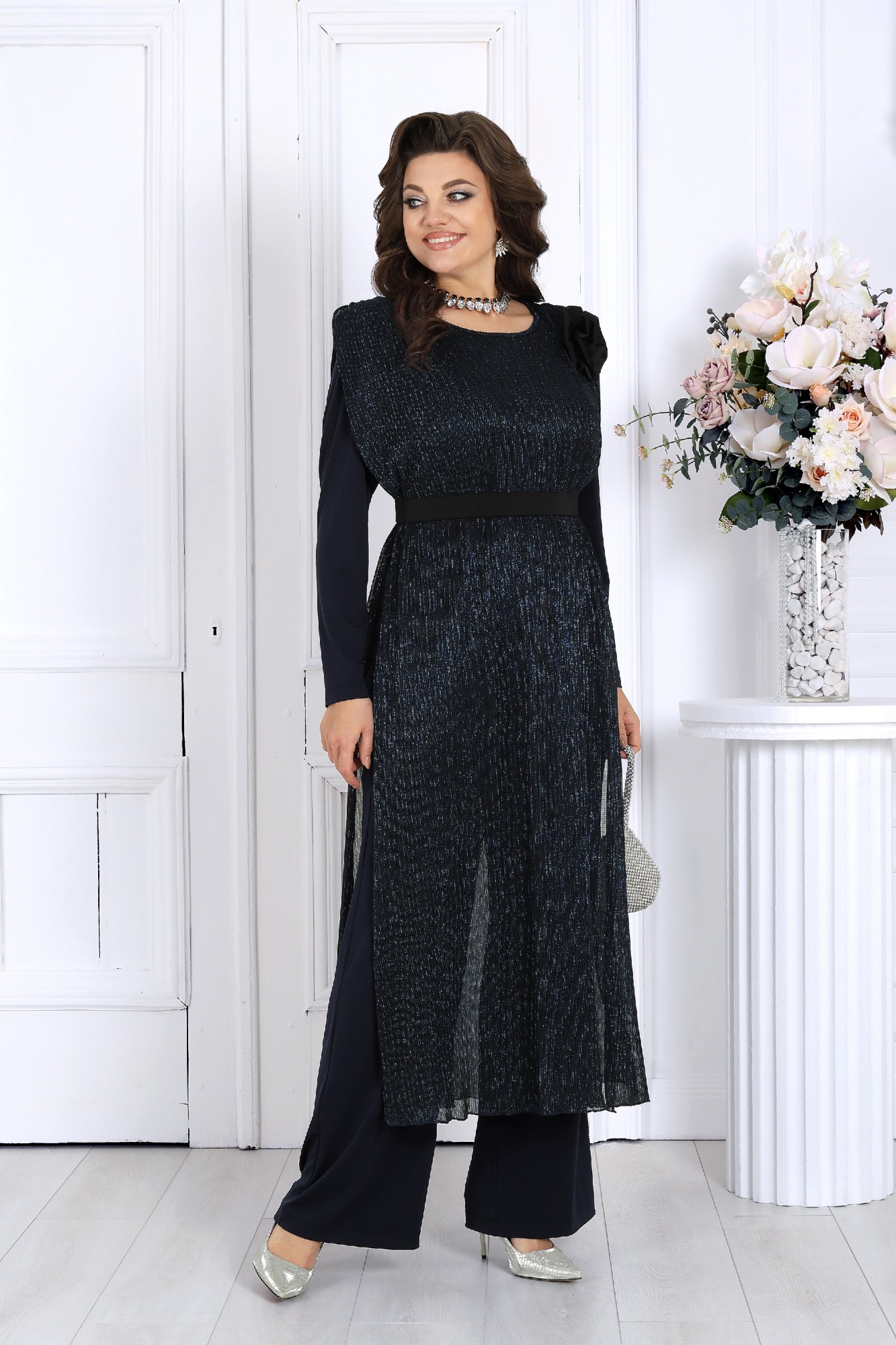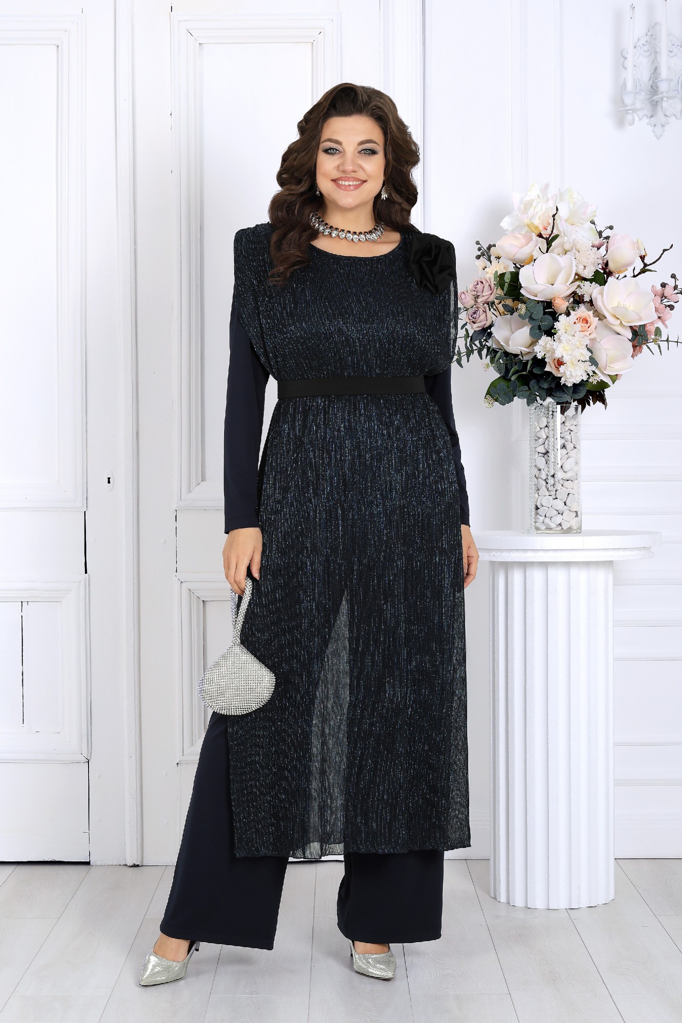 Вечерний брючный костюм для женщин, созданный специально для торжественных случаев и праздничных вечеров. Модель сочетает комфорт и роскошь, подчеркивая фигуру и скрывая возможные нюансы. Блестящая туника с люрексом струится по силуэту, создавая эффект легкости и изысканности. В комплект входит пояс, акцентирующий талию, и декоративный цветок, добавляющий женственности и шарма. Брюки из мягкого трикотажа «масло» прекрасно сидят и не сковывают движений — идеальный выбор для активных, уверенных в себе женщин.Такой костюм уместен на корпоратив, вечер, семейное торжество, Новый год или просто в ресторан. Комфортный, стильный, универсальный — он станет вашей любимой нарядной вещью, которая всегда уместна. Комплект брючный 2-х предметный, состоящий из туники и брюк. Туника прямого силуэта, комбинированная. Модель представляет собой укороченную нижнюю блузку с рукавами, выполненную из трикотажного полотна «масло» и дополненную двумя длинными отлетными деталями, выполненными из сетки-гофре с нитью «люрекс». Отлетные детали скреплены с нижней блузкой по горловине и плечевым швам. Горловина округлой формы, углубленная спереди; обработана узкой косой бейкой из сетки-гофре. Рукав длинный, втачной. Туника дополнена поясом с застежкой на 1 пуговицу и съемным «цветком», выполненными из сатина. Брюки классические, длинные, с посадкой на талии, выполнены из трикотажного полотна «масло». Модель без стрелок, без застежки. Спереди обработаны наклонные боковые карманы. Для лучшего прилегания по линии талии в притачном поясе предусмотрена эластичная лента, вставленная по всей длине.