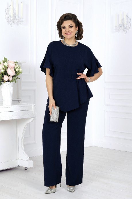 Костюм идеально подойдёт для офиса, деловых встреч, летних мероприятий и даже вечерних торжеств. Благодаря продуманному крою и мягкому крэш-полотну, костюм не только подчеркивает фигуру, но и создаёт правильный силуэт, визуально вытягивая и стройня силуэт. Комплект брючный 2-х предметный, состоящий из блузки и брюк. Блузка полуприлегающего силуэта, выполнена из крэш-полотна. Модель с цельнокроеным рукавом и асимметричным низом, оформленным углами по середине переда и спинки. В левой части переда обработан прямоугольный подрез, переходящий на спинку и сосборенный по линии талии на узкую эластичную ленту. Горловина округлой формы, окантована косой бейкой из основной ткани. Низ короткого рукава оформлен фигурным воланом. Длина блузки – 74 см (48-56 р-р); длина рукава (от горловины) – 36 см (48 р.), 37 см (50 р.), 38 см (52 р.), 39 см (54 р.), 40 см (56 р.). Брюки классические, длинные, с посадкой на талии, выполнены из крэш-полотна. Модель без стрелок. Передние и задние половинки брюк с таллиевыми вытачками, направленными от пояса вниз. Спереди обработаны наклонные боковые карманы и центральная застёжка на тесьму-«молнию». Притачной пояс застегивается на 1 петлю и 1 пуговицу; для лучшего прилегания по линии талии в притачном поясе предусмотрена эластичная лента, вставленная по спинке. Длина брюк по боковому (с поясом) -- 108 см.