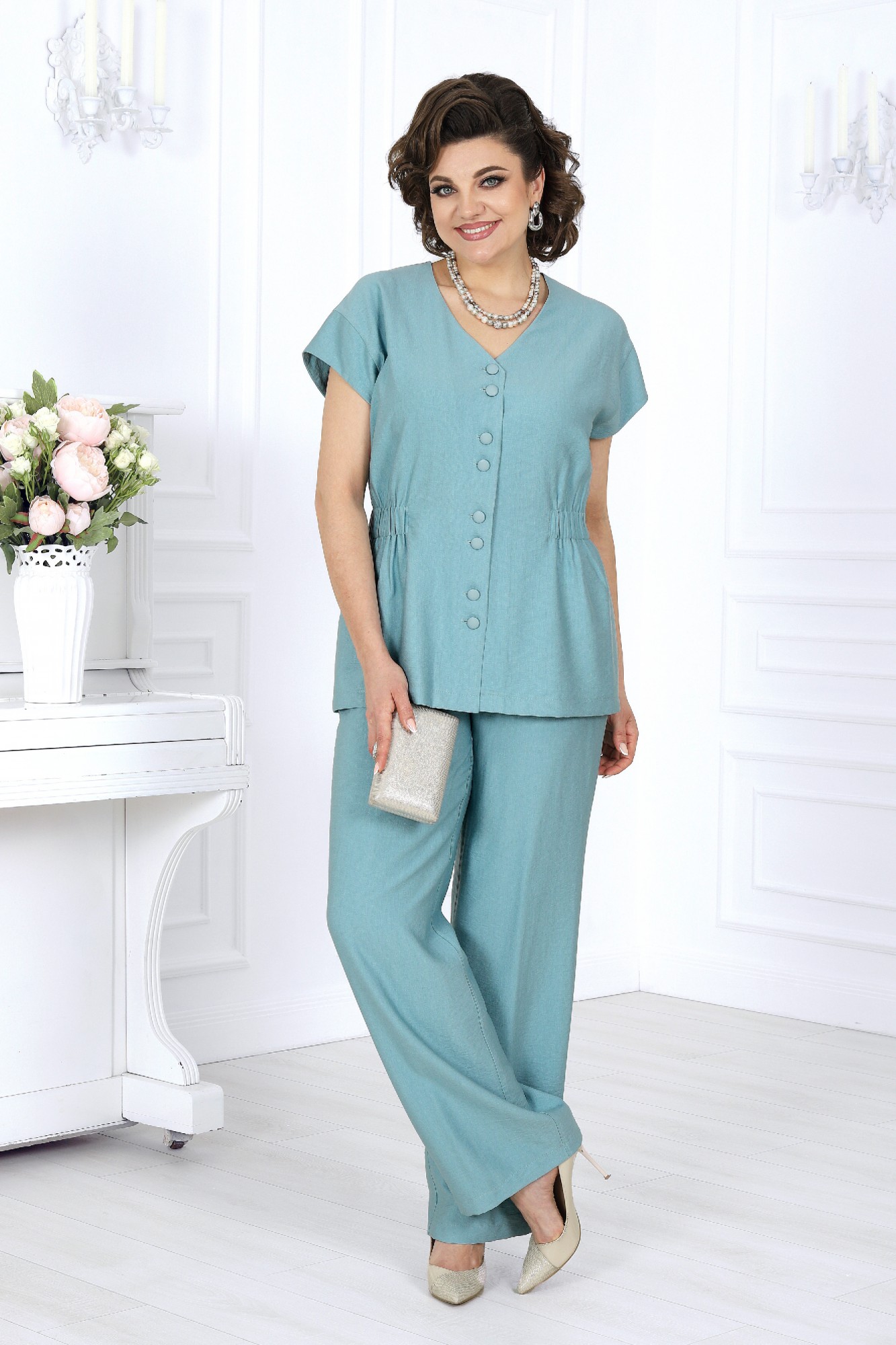 Брючный костюм из вискозы – элегантность, созданная для комфорта. Стильный костюм двойка, состоящий из приталенной блузки и классических брюк, — идеальное решение для делового гардероба, офисных будней и летних мероприятий. Модель выполнена из мягкого вискозного полотна, которое приятно к телу и дарит ощущение легкости и свободы движений жарким летом. Универсальный фасон — легко адаптируется под праздничный и деловой стиль, подходит для женщин с пышными формами, визуально вытягивает силуэт и делает фигуру стройнее, идеален для офиса, торжественных событий и повседневной носки. Комплект брючный 2-х предметный, состоящий из блузки и брюк. Блузка приталенного силуэта, выполнена из вискозного полотна. Модель со спущенной линией плеча, без воротника, без рукавов и плечевых накладок. По линии талии спинки и частично переда с изнанки настрочена кулиса с широкой эластичной лентой внутри. Перед с застежкой на 8 петель и 8 пуговиц, расположенных по 4 пары через равные расстояния. Горловина по спинке округлая, спереди V-образная. Квадратная пройма оформлена обтачной фигурной планкой. Длина блузки – 65 см. Брюки классические, длинные, с посадкой на талии, выполнены из вискозного полотна. Модель без стрелок. Задние половинки брюк с таллиевыми вытачками, направленными от пояса вниз; на передних – по 2 односторонние складки. Спереди обработаны наклонные боковые карманы и центральная застёжка на тесьму-«молнию». Притачной пояс застегивается на 1 петлю и 1 пуговицу; для лучшего прилегания по линии талии в притачном поясе предусмотрена эластичная лента, вставленная по спинке. Длина брюк по боковому (с поясом) – 108 см.
