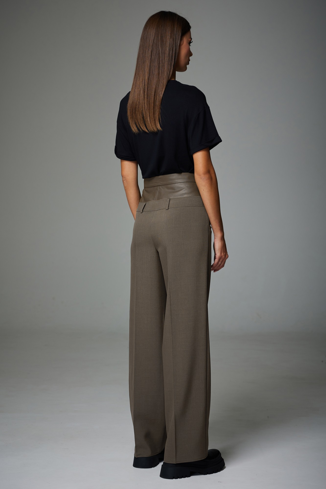 Комплект, состоящий из жакета и брюк, втачного покроя, свободного силуэта. Выполнен из двух видов ткани. Жакет прямого силуэта, на подкладке. Воротник пиджачного типа. Центрально-бортовая застежка на две пуговицы. Рукав двухшовный. Спинка со средним швом, карманы функциональные, прорезные в рамку с клапаном. Борта слегка закруглены. Брюки комбинированные из двух видов тканей, прямой формы, в области талии и бедер облегающие. В брюках заутюжены стрелки. Кокетка передней и задней половинки выполнены в тон основной ткани, пояс выполнен из экокожи. На передних половинках выполнены застежка на петли и пуговицы на гульфик. Нижний пояс в брюках выполнен из основной ткани, на поясе расположены шлевки. В боковых швах расположены карманы закругленной формы.