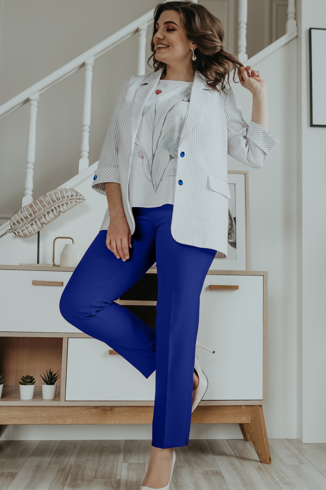 Стильный комплект, состоящий из жакета, брюк и блузки. Жакет полуприлегающего силуэта из ткани в полоску, в составе которой лен, с застежкой на две пуговицы, полочка обработана х/б подкладкой. По переду жакета обработаны карманы в рамку с клапанами. Рукав 7/8 с манжетами и декоративными пуговицами. Брюки чуть заужены к низу, на поясе, с застежкой на пуговицу и тесьму-молнию, разрезы в боковых швах. Блуза с принтом и коротким рукавом.