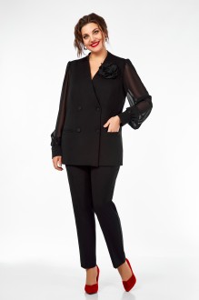 Костюм женский: жакет, жилет, брюки. Жакет на подкладке, полуприлегающего силуэта с центральной бортовой застежкой на петли и пуговицы, с отрезным бочком . По переду прорезные карманы в рамку, спинка со средним швом и вытачками. Рукав втачной двухшовный со шлицами-обманками на петли и пуговицы. Жилет на подкладке полуприлегающего силуэта с V-образным вырезом и центральной застежкой на пуговицы. Перед с отрезными бочками и имитацией карманов с листочками, низ фигурный. Спинка со средним швом. Брюки расширены к низу, на притачном поясе и боковыми карманами, застежка брюк на тесьму молнию и пуговицу, по спинке пояс на резинке.