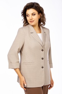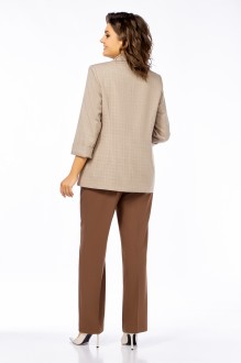 Комплект выполнен из двух тканей. Жакет в клетку, брюки однотон. Жакет полуприлегающего силуэта, с застежкой на три пуговицы. Воротник с лацканами, по переду карманы с листочкой, рельефные швы. Спинка со средним швом. Жакет на подкладке. Рукав длиной три четверти с цельнокроеной манжетой. Брюки прямого кроя со стрелками. Брюки на поясе по спинке резинка, застежка на молнию и петлю-пуговицу.