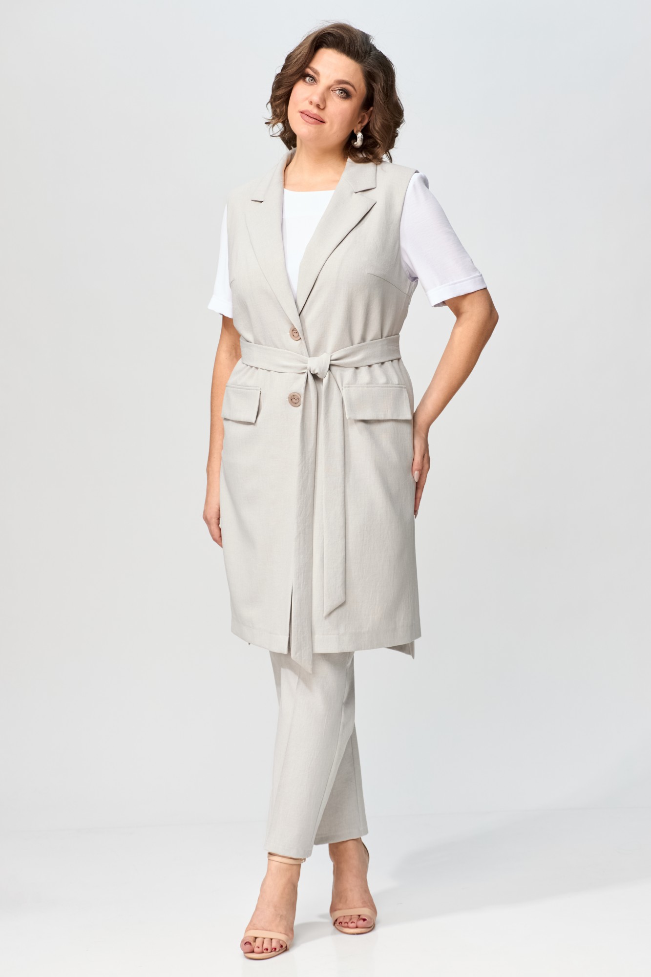 Брюки, жилет – полиэстер 55%, вискоза 42%, спандекс 3%; Блуза – вискоза 68%, эластан 29%, полиэстер 3%