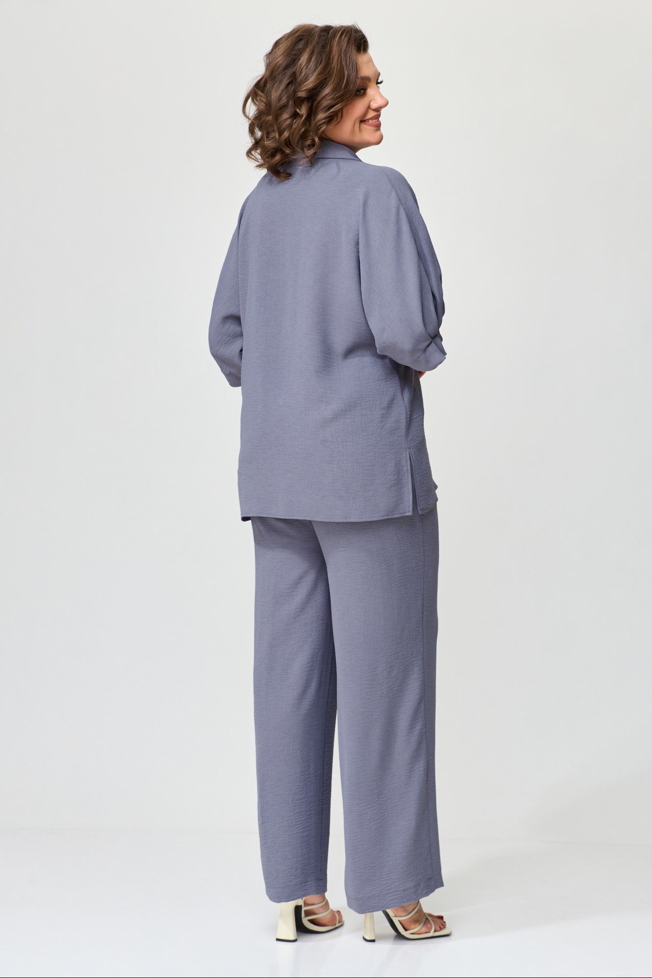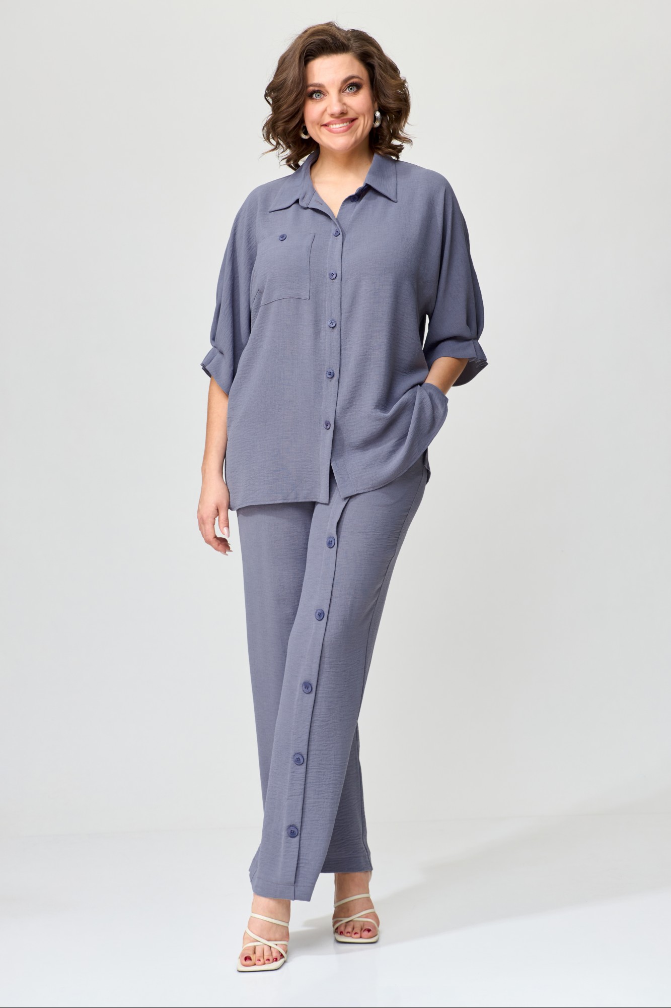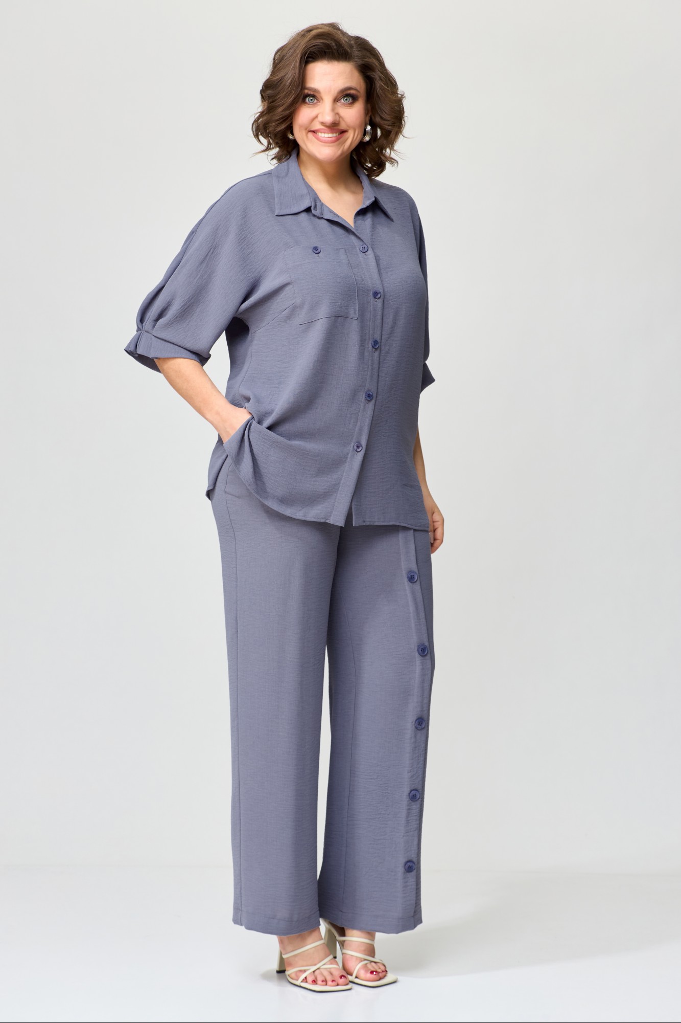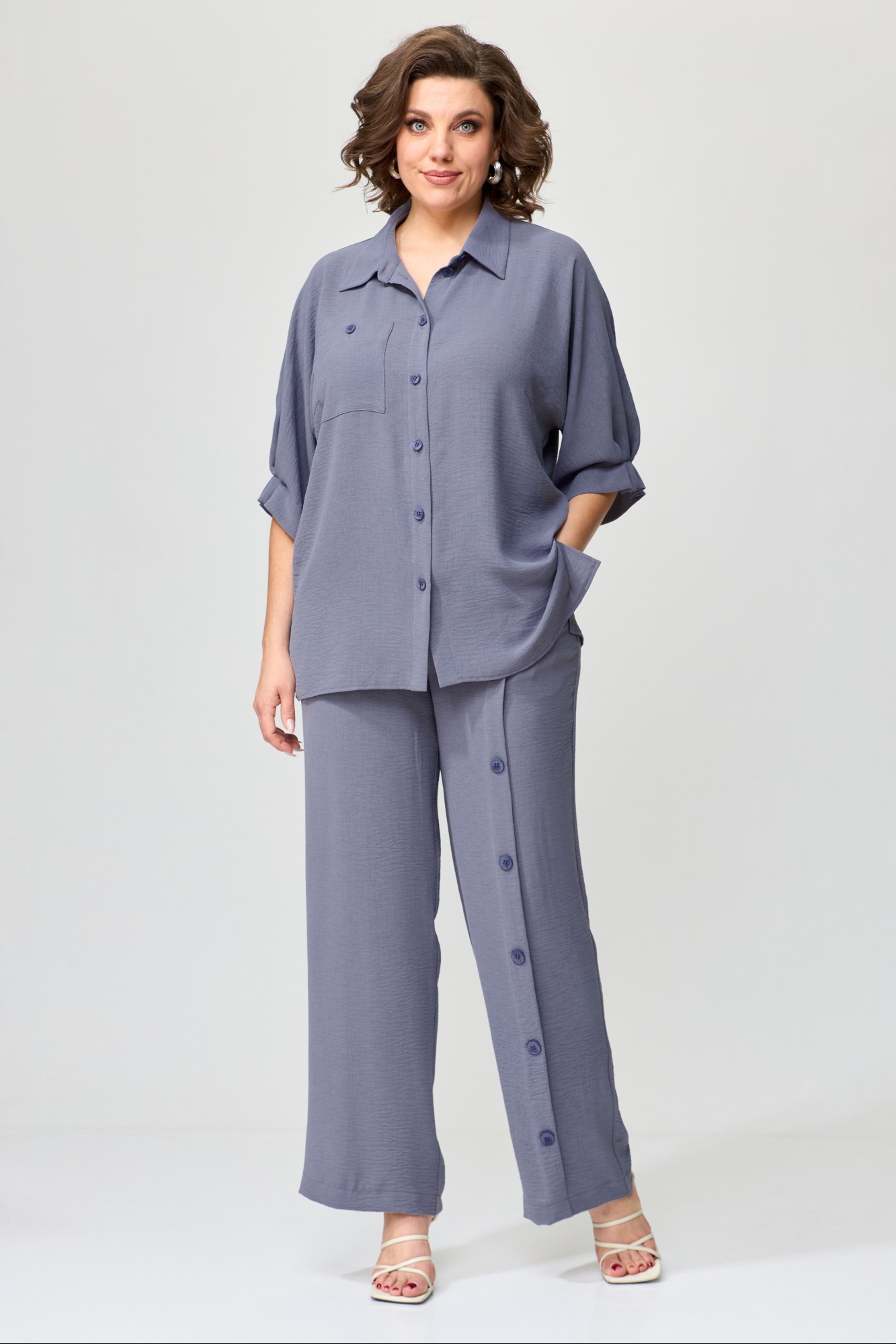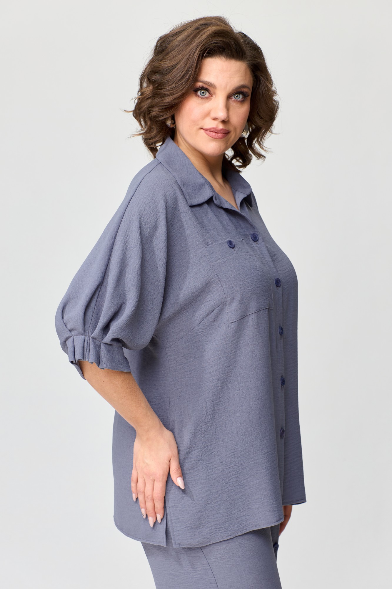 Комплект женский свободной формы, прямого силуэта. Покроя спущенное плечо. Блуза с центрально-бортовой застежкой на петли-пуговицы. Горловина оформлена стояче-отложным воротником с отрезной стойкой. Рукава цельнокроеные длиной до локтя. На переде расположены нагрудные вытачки и накладной карман. В боковых швах расположены разрезы. Спинка цельная. Брюки прямые. Верхний срез обработан поясом по спинке на резинке. На левой половине переда по центру расположены декоративные складки фиксирующиеся пуговицами. В боковых швах расположены карманы.