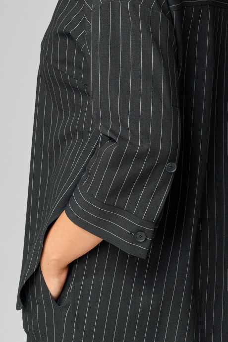 Комплект женский, состоящий из блузы и брюк. Блуза свободной формы, покроя спущенное плечо с центрально-бортовой застежкой на петли и пуговицы (цельнокроеная планка). Рукав ¾ с манжетой по низу. В локтевой части рукава расположена складка, застроченная отделочной строчкой и зафиксированная пуговицей. Горловина оформлена стояче-отложным воротником с отрезной стойкой. На переде расположена горизонтально направленная кокетка, в шве притачивания обработаны карманы, вход в карманы фиксируется петлей с пуговицей. На переде расположены нагрудные вытачки, идущие из бокового шва. Спинка с горизонтальной кокеткой. В нижней части спинки расположена встречная складка. Низ блузы закругленной формы, перед короче спинки. Брюки прямые. Верхний срез обработан поясом с резинкой по спинке до начала карманов, боковых, наклонных, расположенных на передних половинках. В брюках заутюжены стрелки. Комплект выполнен из ткани с дизайном полоска.