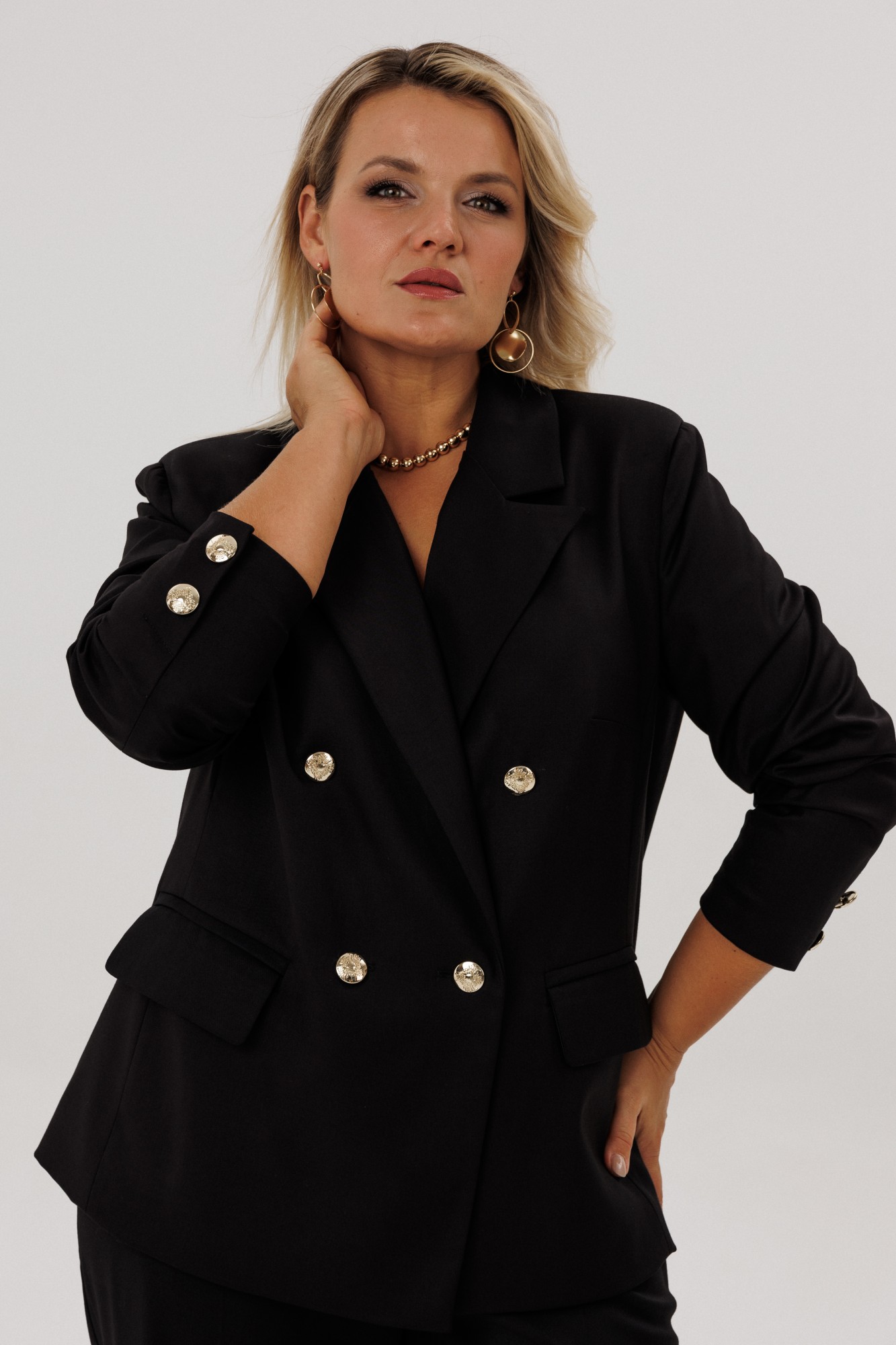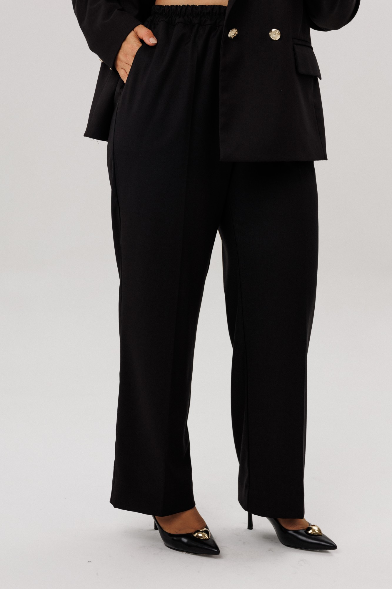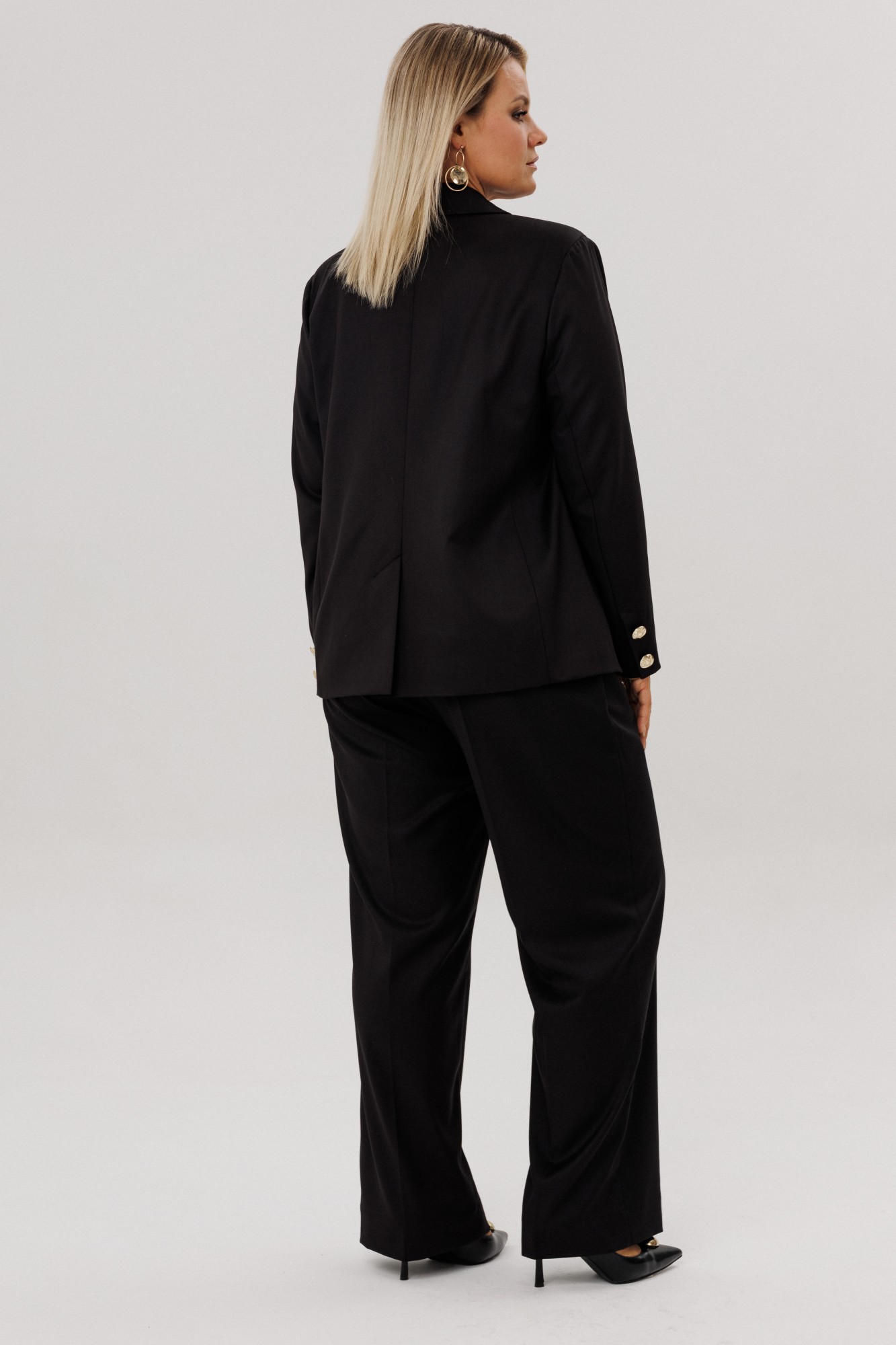 Элегантный классический черный костюм обрадует Вас посадкой и качеством пошива. Состоит из жакета и брюк. Классический приталенный двубортный жакет с пиджачным воротником на подкладке прямого кроя, имеет удобные функциональные карманы с клапанами, что добавляет практичности. Прекрасным решением в костюме являются позолоченные пуговицы на застежке и рукавах. Прямые брюки с высокой посадкой, на резинке. Для удобства и функциональности в боковых швах карманы- «хулиганы». Оригинальный костюм oversize – идеальное решение для современной женщины, он хорошо садится по фигуре, не мнётся, удобен для повседневной носки и прекрасно выглядит! Ткань хорошо тянется и это позволяет вам комфортно себя чувствовать. Этот костюм – готовый ансамбль не только для офиса, но и для особого мероприятия.