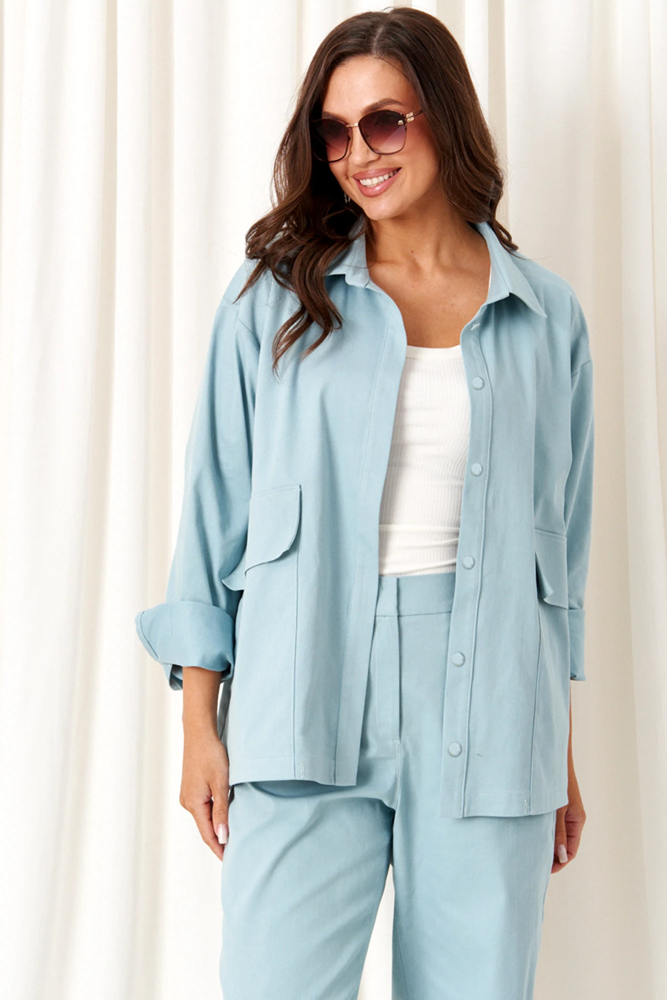 Стильный женский костюм из смесовой джинсовой ткани с высоким содержанием хлопка. Костюм состоит из жакета и брюк, создающих гармоничный образ. Жакет прямого силуэта с центральной бортовой застежкой на обметанные петли и джинсовые пуговицы привлекает внимание своим изысканным стилем. Передняя часть жакета дополнена накладным карманом с клапаном, а спинка оформлена потайной вставленной резинкой, позволяющей регулировать облегание и обеспечивать удобство в носке. Горловина обработана рубашечным воротником, а линия плеча опущена, что добавляет модели легкости. Длинные втачные рукава заканчиваются манжетами с застежкой на обметанную петлю и джинсовую пуговицу, что придает жакету завершенный вид. Брюки имеют слегка зауженный силуэт и верхний срез, обработанный притачным поясом с вставкой на резинке в боковой части для дополнительного комфорта. Застежка на обметанную петлю и джинсовую пуговицу обеспечивает надежную фиксацию. Передняя часть брюк украшена вытачкой по низу и карманом с подкройным бочком, а задняя половинка имеет отрезную кокетку и талиевую вытачку, что подчеркивает фигуру. Два накладных кармана с вытачкой добавляют функциональности и стиля. Брюки оснащены вставленными в пояс шлевками для ремня. Костюм выполнен в нежном голубом оттенке, который добавляет свежести и яркости в ваш гардероб, делая его идеальным выбором для различных повседневных и деловых мероприятий.