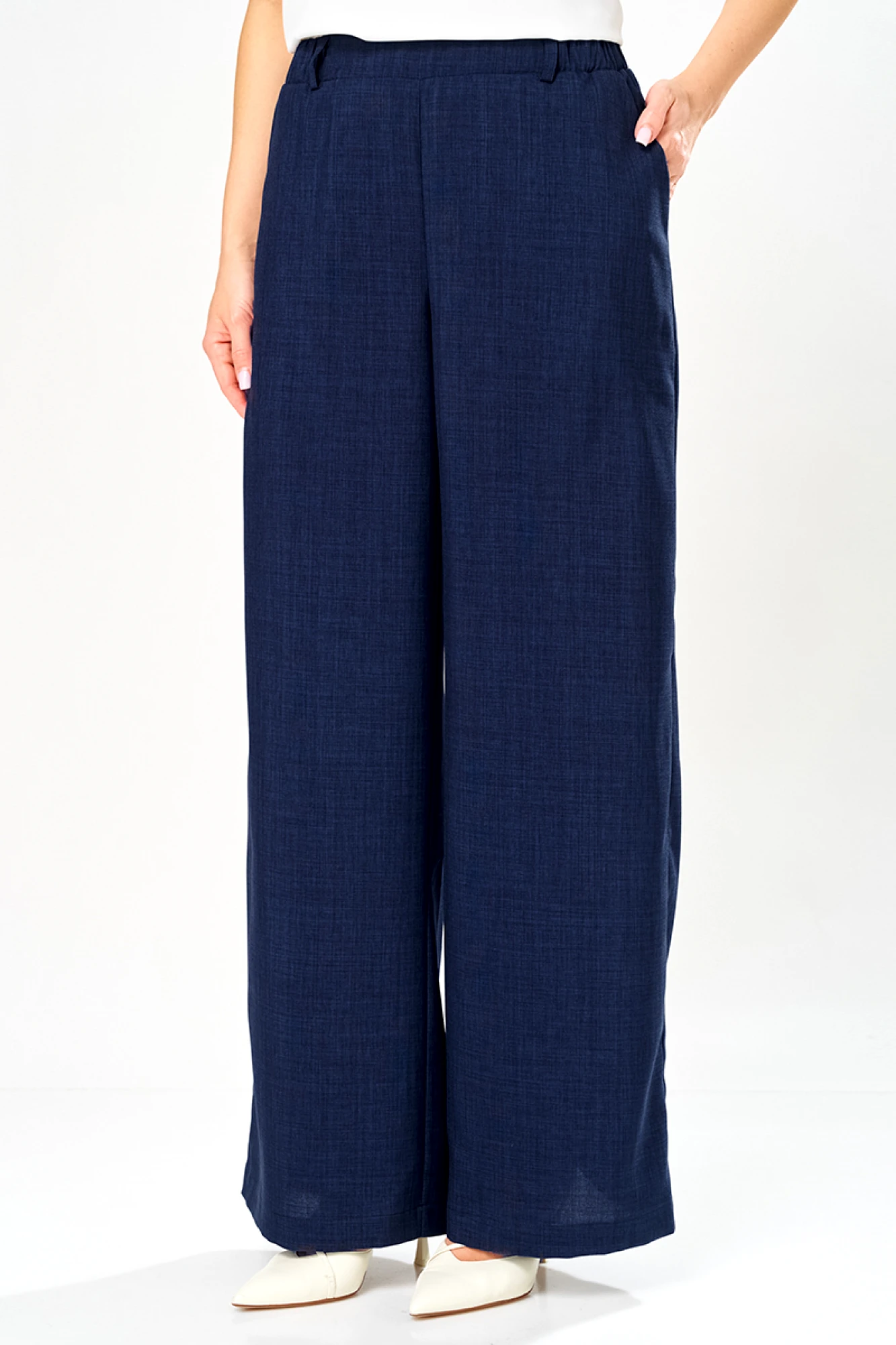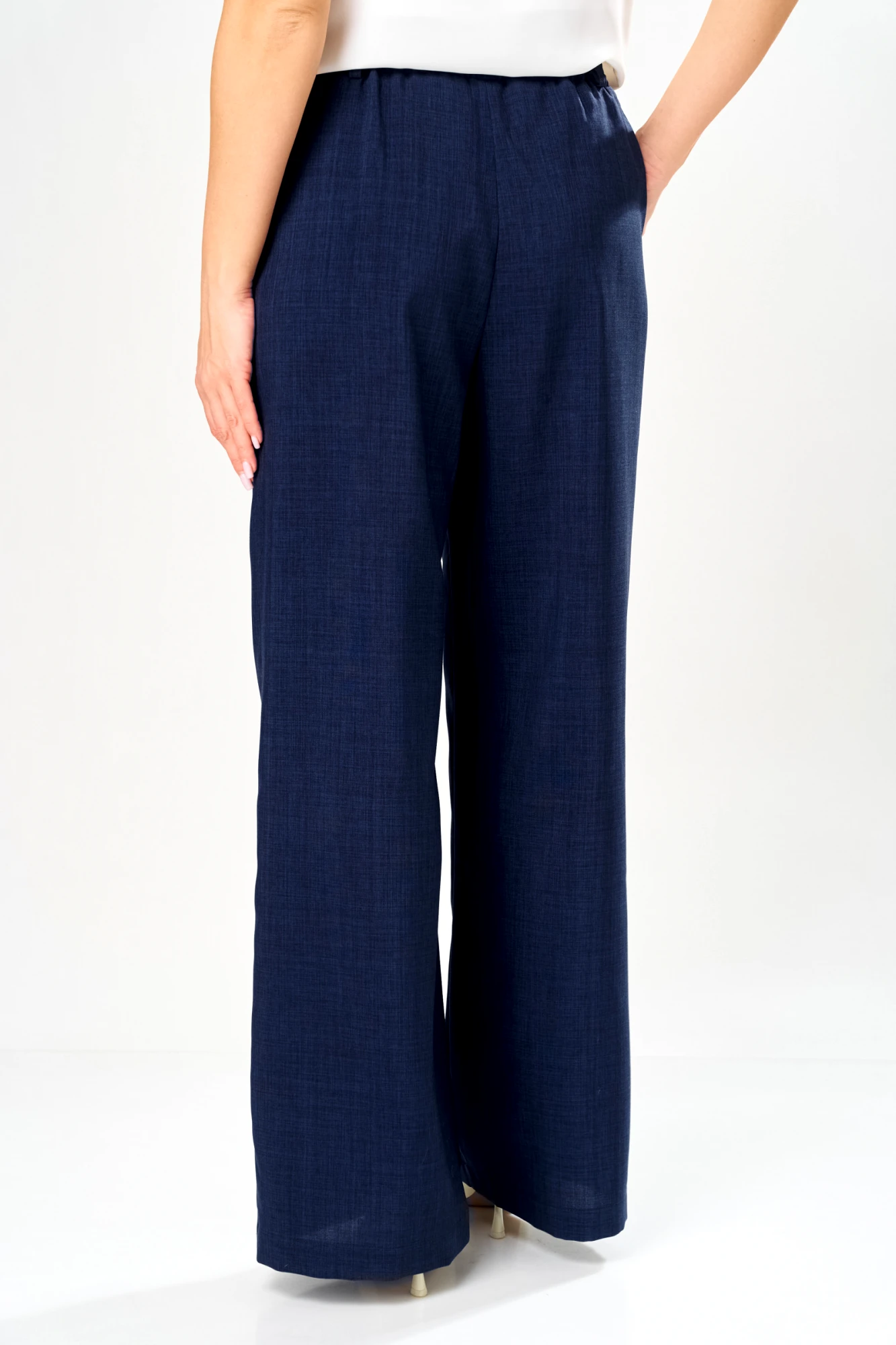 Этот женский костюм выполнен из смесовой ткани с добавлением хлопка, что обеспечивает комфорт и долговечность. Он включает в себя жакет и брюки, гармонично сочетающиеся по стилю и цвету. Жакет полуприлегающего силуэта в бело-синем оттенке с полосатым узором. Застежка в жакете двубортная на обметанные петли и обтяжные пуговицы, которые создают аккуратный и завершенный вид. На переде расположены два прорезных кармана в рамку с двумя обтачками и клапаном, и вставками из синей ткани, добавляющими интересный акцент. Спинка жакета украшена двумя средним швом. Жакет имеет бочок. Воротник выполнен в пиджачном стиле, что делает модель более строгой и классической. Рукава втачные длинные что придает образу деловой нотки и комфорт при носке. Жакет на хлопковой подкладке. Брюки прямые из смесовой ткани с добавлением льна. Верхний срез брюк обработан притачным поясом с вставкой на резинке в боковой и задней части, обеспечивая хорошую посадку и комфорт. В боковом шве имеются карманы с подкройным бочком. Это стильный и элегантный костюм бело-синего оттенка, идеально подходящий для деловых встреч и повседневных мероприятий, сочетающий в себе классические линии и современный дизайн.