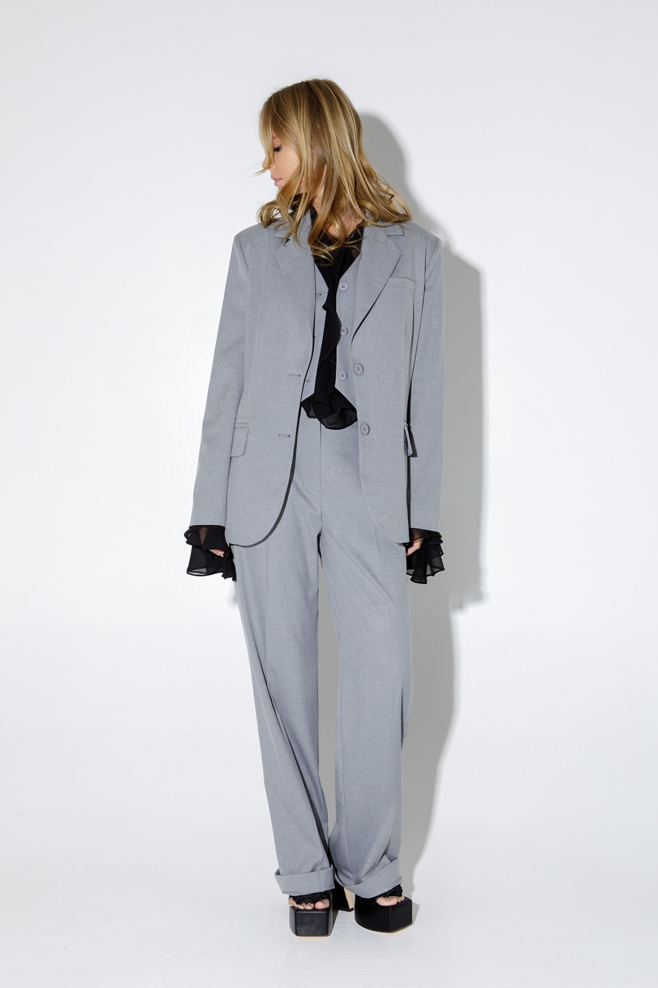 Костюм-двойка из оверсайз жакета и прямых широких брюк со стрелками из текстильной ткани. Детали: жакет прямого силуэта, расширенная линия плеч, пиджачный воротник, перед с прорезными функциональными карманами, однобортная застежка на петли и пуговицы, спинка со средним швом и шлицей, рукава втачные двухшовные, жакет на подкладке. Брюки с высокой посадкой на притачном поясе со шлевками, пояс прямой без резинки, застежка на молнию и пуговицу, боковые карманы, передние половины с заутюженными стрелками и двумя небольшими складками. Задние части брюк с вытачками и заутюженными стрелками.