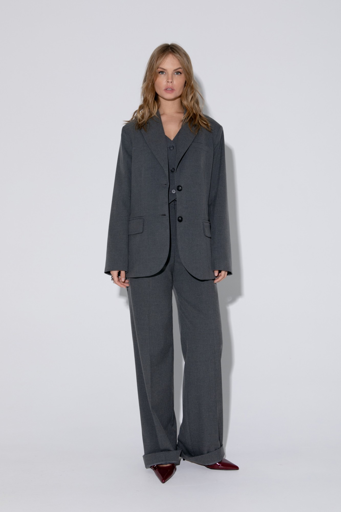 Костюм-тройка из оверсайз жакета, укороченного жилета и прямых широких брюк со стрелками из текстильной ткани. Детали: жакет прямого силуэта, расширенная линия плеч, пиджачный воротник, перед с прорезными функциональными карманами, однобортная застежка на петли и пуговицы, спинка со средним швом и шлицей, рукава втачные двухшовные, жакет на подкладке. Жилет прямого силуэта с фигурным низом, талиевые вытачки, застежка на петли и пуговицы, функциональные карманы, на подкладке. Брюки с высокой посадкой на притачном поясе со шлевками, пояс прямой без резинки, застежка на молнию и пуговицу, боковые карманы, передние половины с заутюженными стрелками и двумя небольшими складками. Задние части брюк с вытачками и заутюженными стрелками.