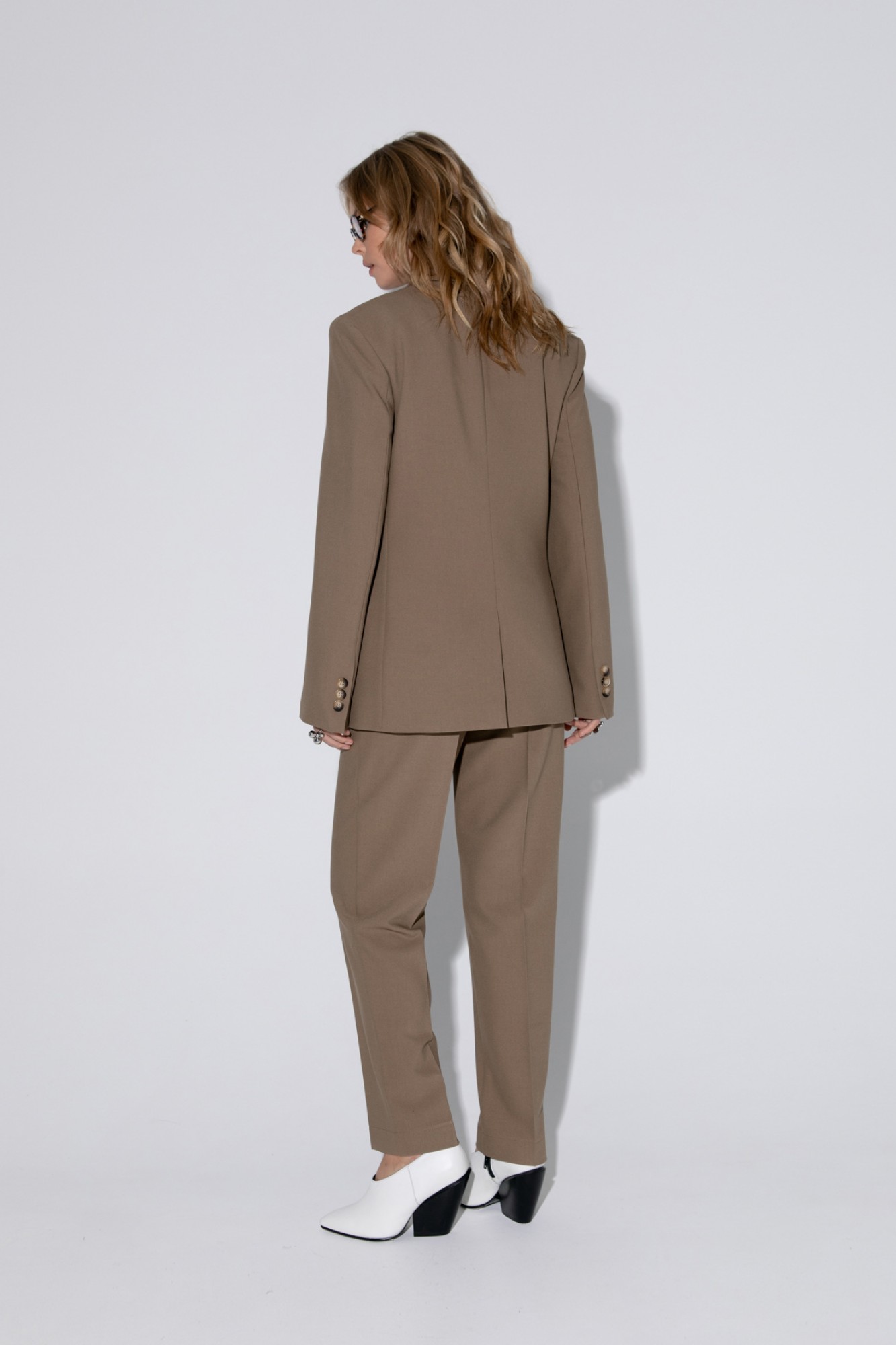 Костюм-двойка из свободного двубортного жакета и классических-брюк из текстильной ткани.