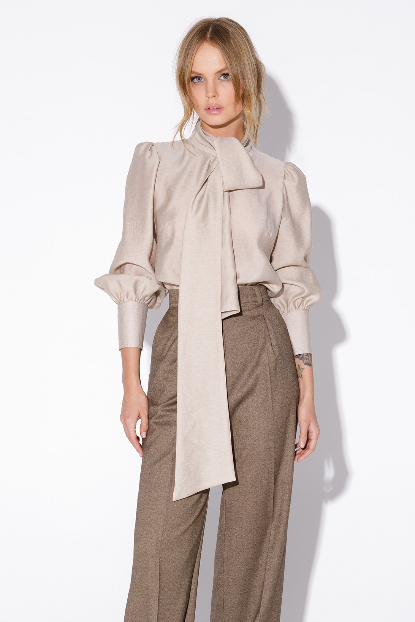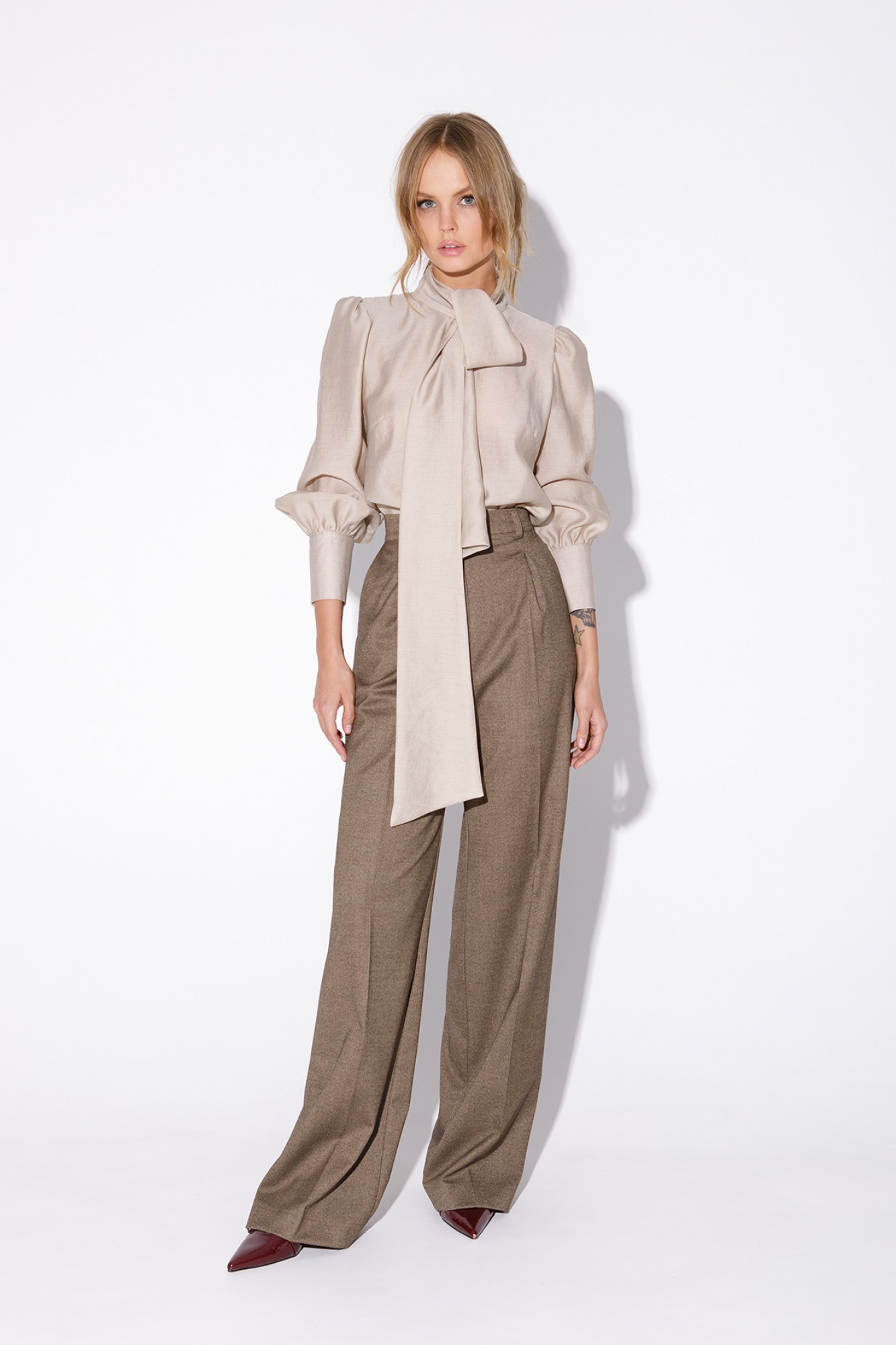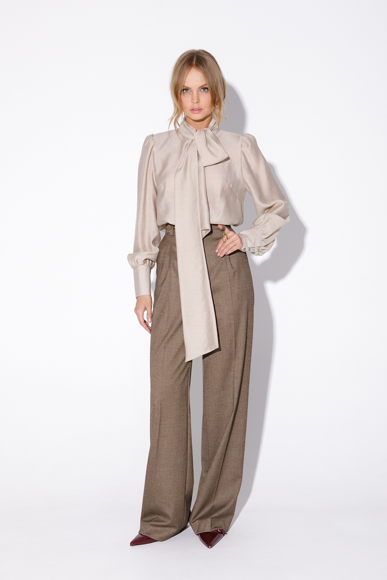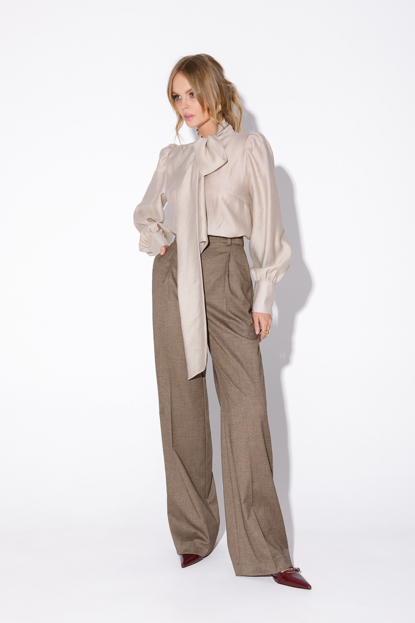 Текстильный комплект-двойка из полупрозрачной вискозной блузы и широких прямых брюк с рисунком «ёлочка». Детали: прямой силуэт, нагрудные вытачки, рукава длинные объемные со сборкой и высокими притачными манжетами с застежкой на навесные петли и декоративные пуговицы, блуза без застежки. Брюки с притачным поясом со шлевками, передние половины с небольшими застроченными мягкими складками и заутюженными стрелками, застежка на молнию и пуговицу, боковые карманы. Задние части брюк с вытачками и заутюженными стрелками. Пояс брюк прямой, без резинки.
