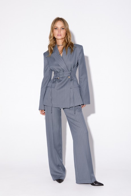 Костюм-двойка из жакета со шнуровкой с расширенной линией плеч и широких прямых брюк со стрелками из текстильной ткани в полоску. Детали: жакет полуприлегающего силуэта, рельефы, пиджачный воротник, застежка на две петли и пуговицы, функциональные карманы, жакет на подкладке. Жакет также можно зашнуровать по бокам. Брюки с притачным поясом со шлевками, передние половины с небольшими застроченными мягкими складками и заутюженными стрелками, застежка на молнию и пуговицу, боковые карманы. Задние части брюк с вытачками и заутюженными стрелками. Пояс брюк прямой, без резинки.