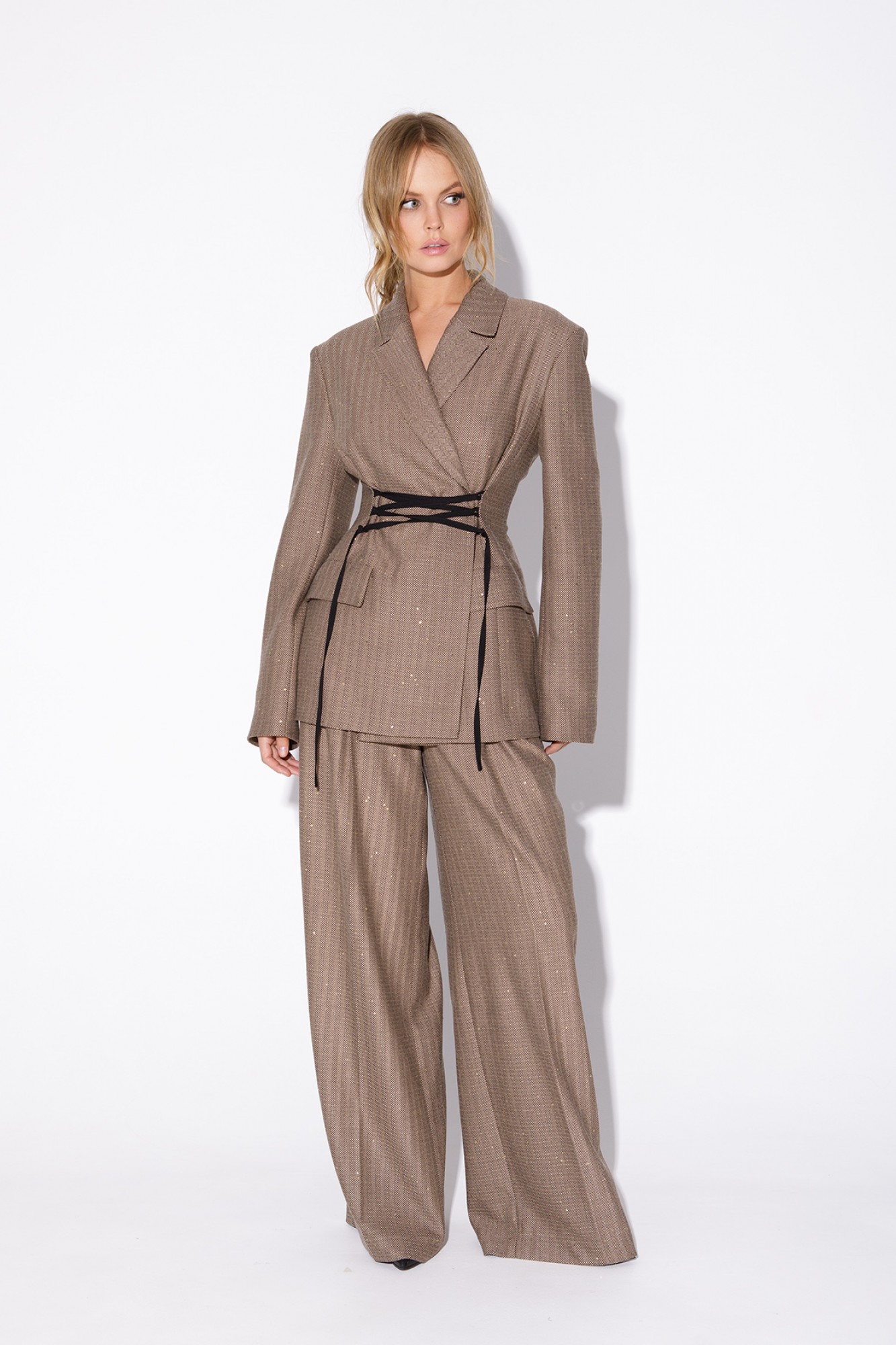 Костюм-двойка из жакета с контрастной шнуровкой и широких брюк-палаццо из текстильной ткани с пайетками. Детали: жакет полуприлегающего силуэта, рельефы, пиджачный воротник, застежка на две петли и пуговицы, функциональные карманы, жакет на подкладке. Жакет также можно зашнуровать по бокам. Брюки с притачным поясом со шлевками, складки у пояса, застежка на молнию и пуговицу, боковые карманы. Задние части брюк с вытачками и имитацией карманов.