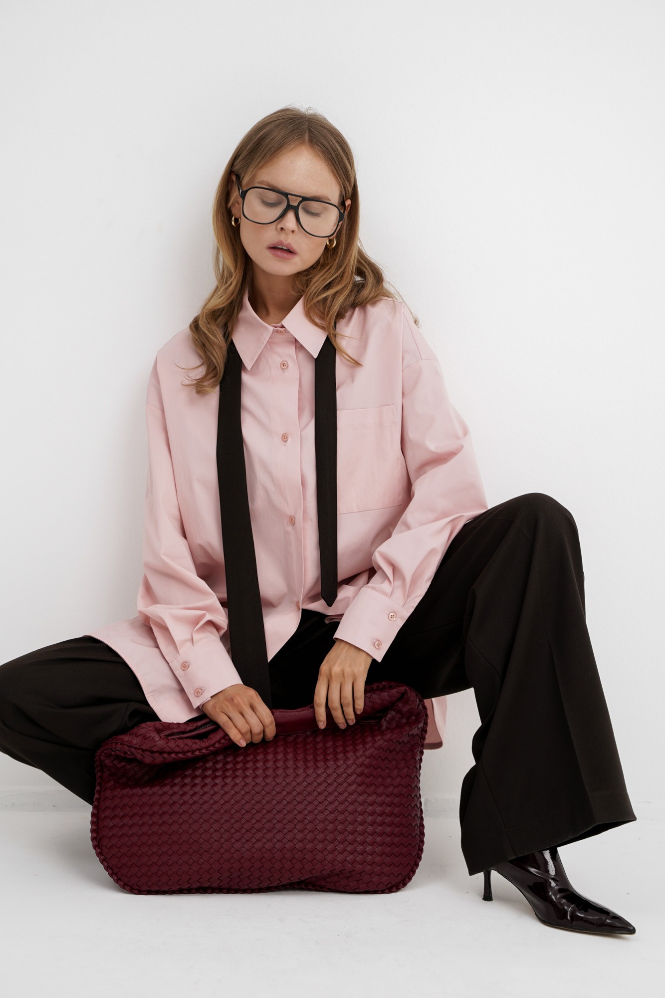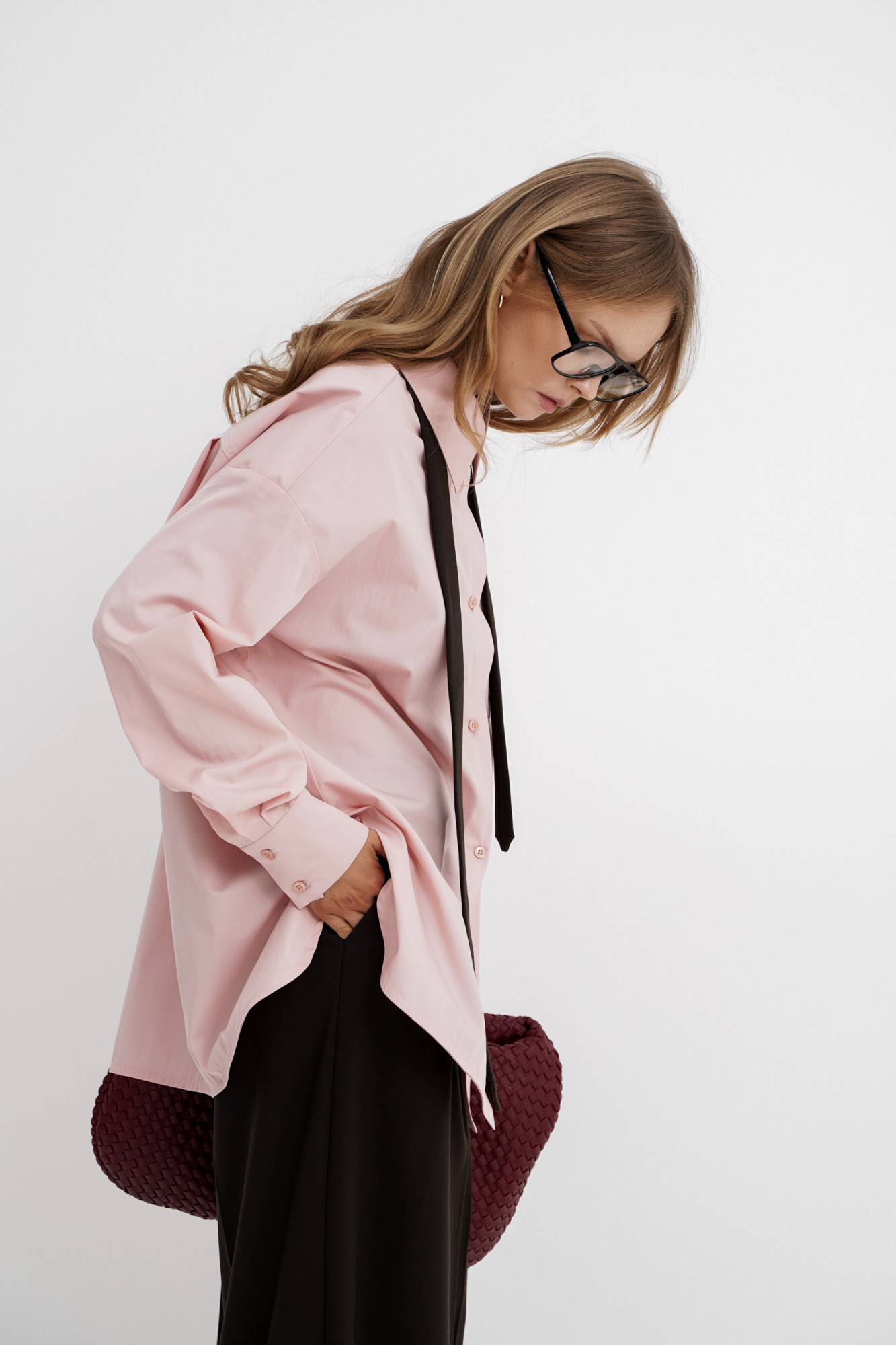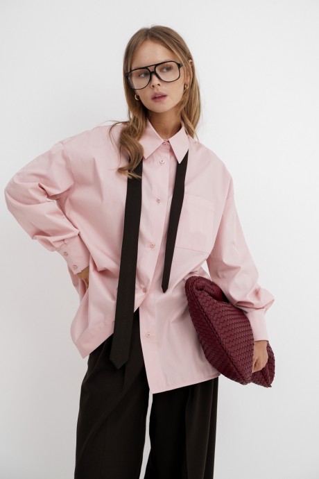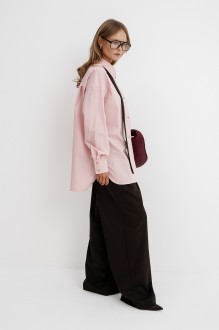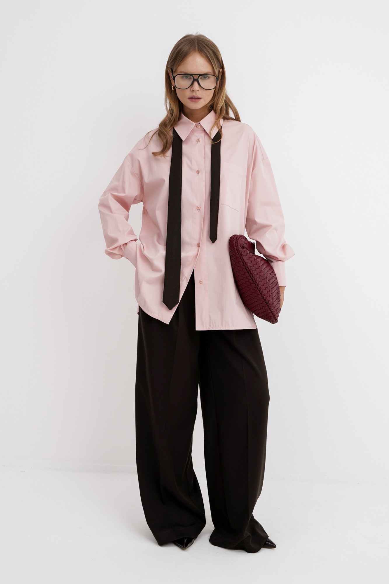 Комплект-двойка из хлопковый оверсайз рубашки с галстуком и брюк-палаццо со складками. Детали: рубашка прямого силуэта, спущенная линия плеча, застежка на петли и пуговицы, длинные рукава с притачными манжетами, фигурный низ. Широкие брюки-палаццо с небольшими складками у пояса и заутюженными стрелками, притачной пояс со шлевками, застежка на молнию и пуговицу, боковые карманы. Задние части брюк с вытачками и имитацией карманов. Галстук в комплекте.