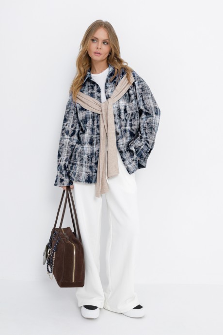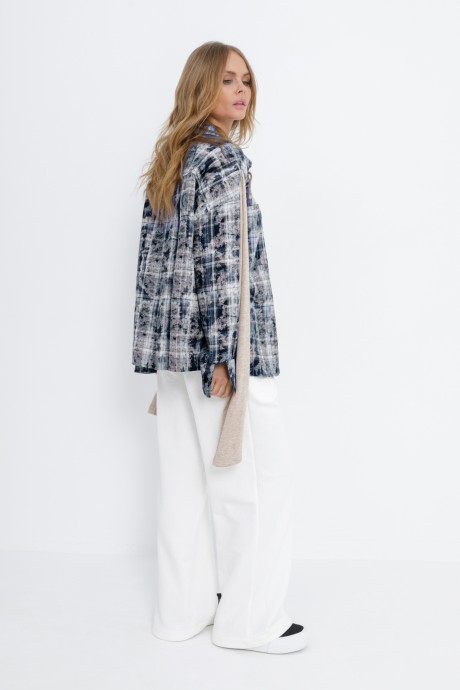 Комплект-двойка из текстильной рубашки в клетку с эффектом потертости и свободных трикотажных брюк. Детали: рубашка прямого силуэта, спущенная линия плеча, накладные карманы, застежка на петли и пуговицы, удлиненные рукава с притачными манжетами, имитация рукавов из трикотажа. Брюки с высокой посадкой, эластичный пояс с резинкой, боковые карманы, без застежки.
