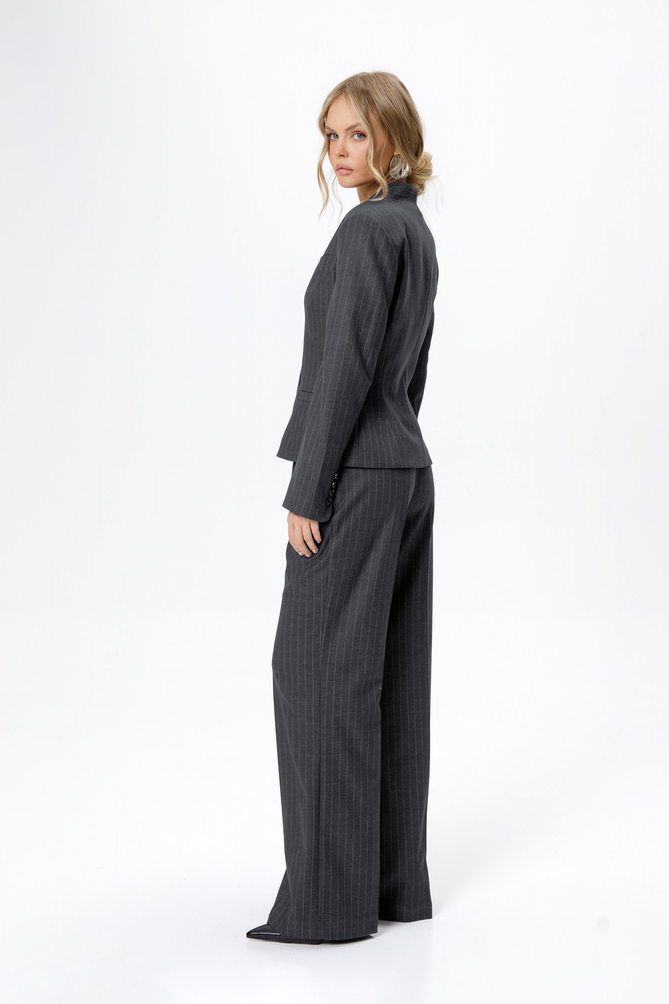 Костюм-двойка из приталенного жакета со съемным шарфиком и широких прямых брюк. Детали: жакет полуприлегающего силуэта, цельнокроеный воротник-стойка, рельефные швы переда и спинки, функциональные карманы, застежка на петли и пуговицы, на подкладке. В комплекте съемный шарфик. Брюки с притачным поясом со шлевками, передние половины с небольшими застроченными мягкими складками и заутюженными стрелками, застежка на молнию и пуговицу, боковые карманы. Задние части брюк с вытачками и заутюженными стрелками. Пояс брюк прямой, без резинки.