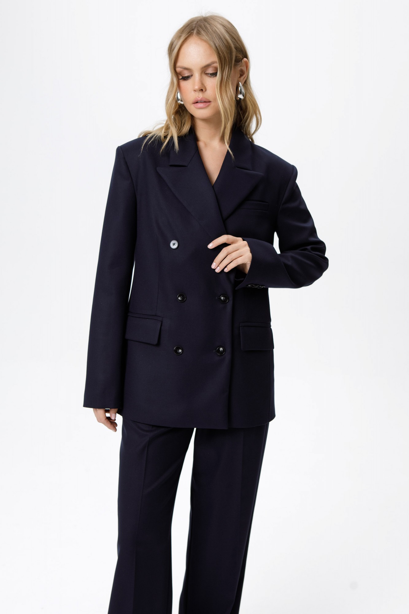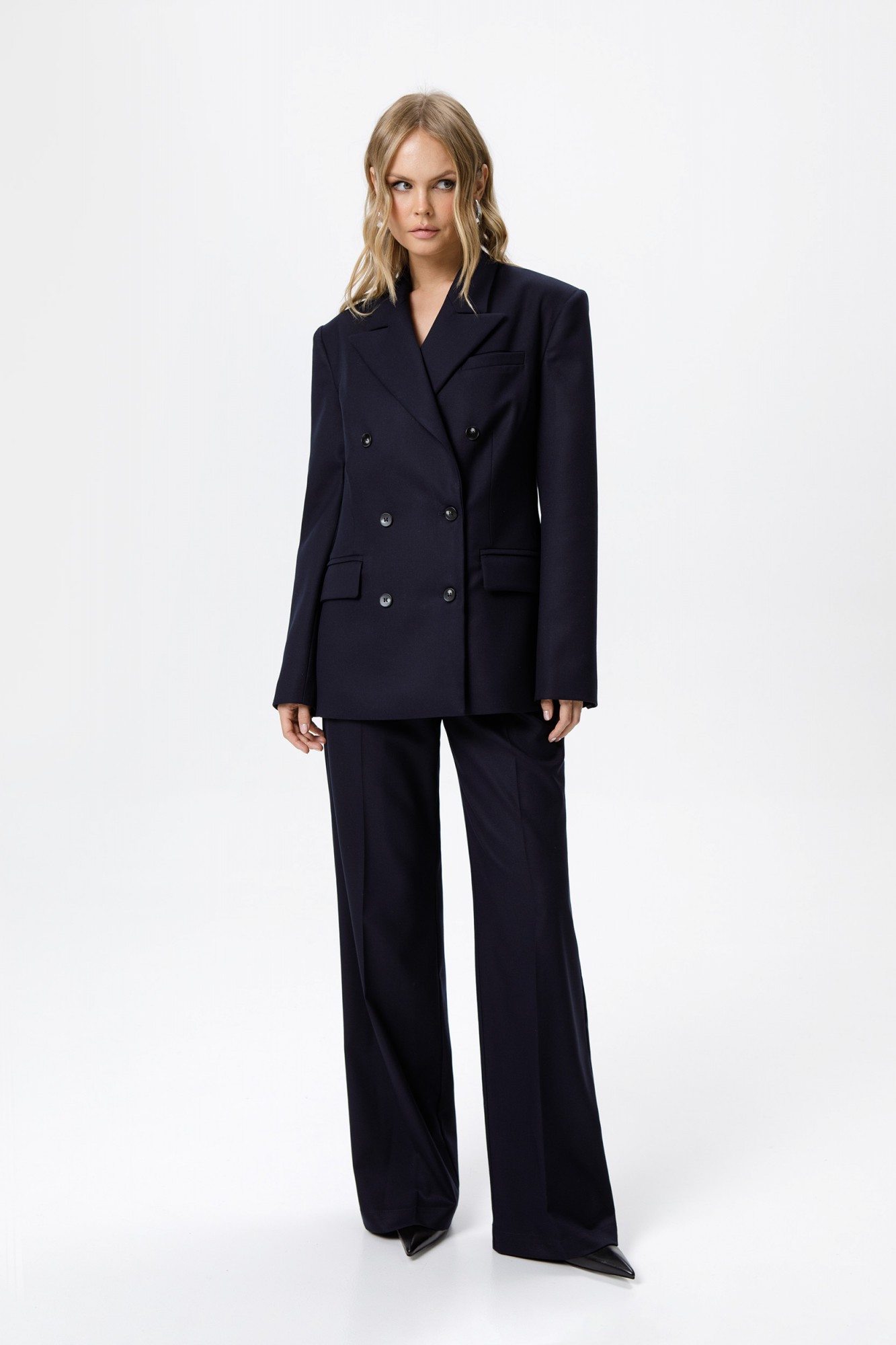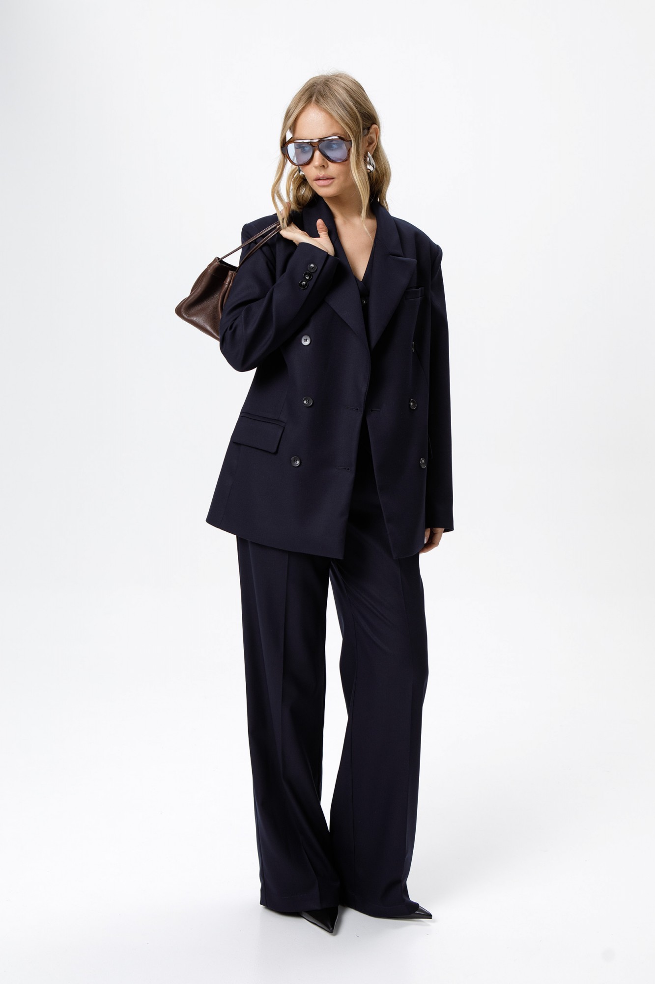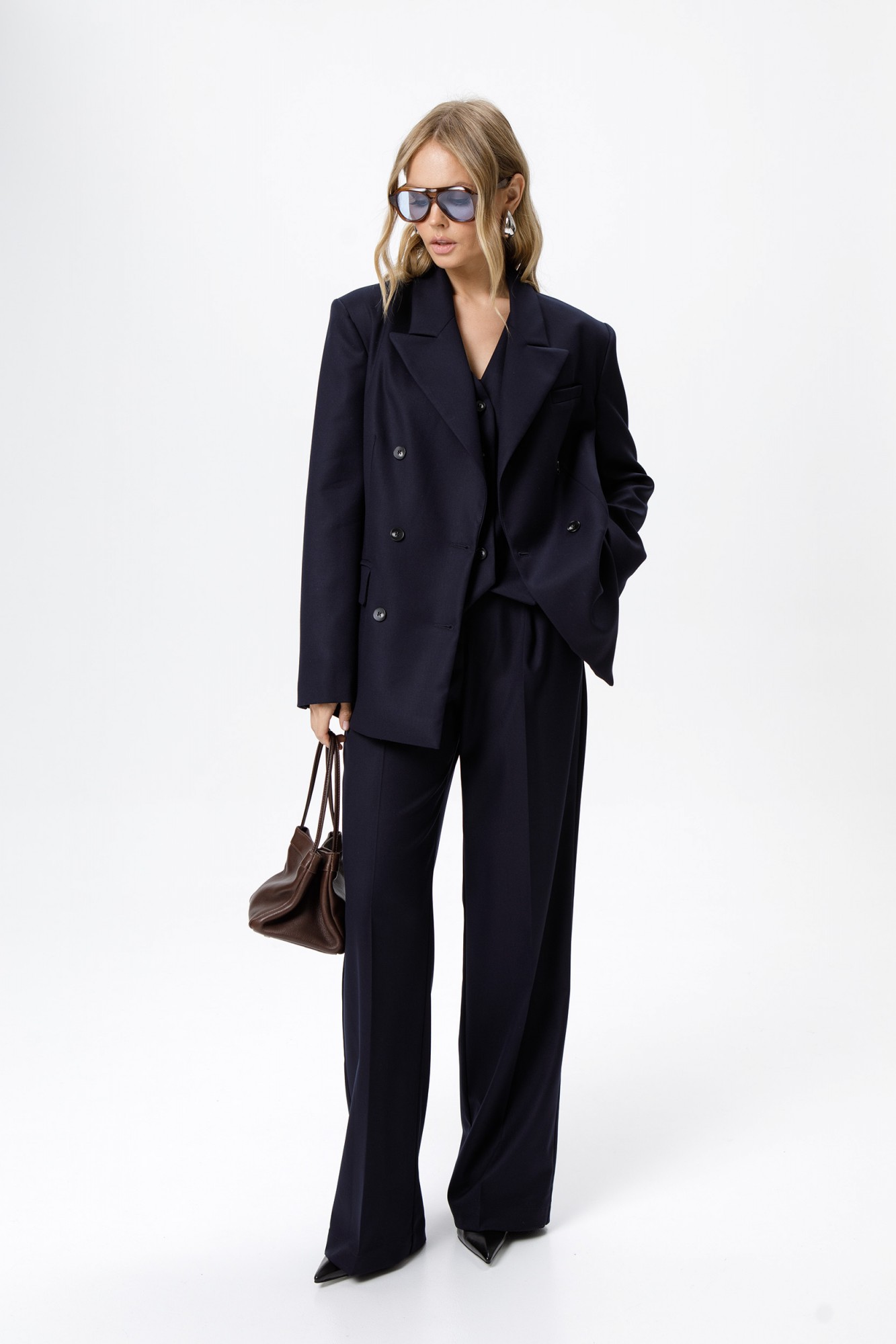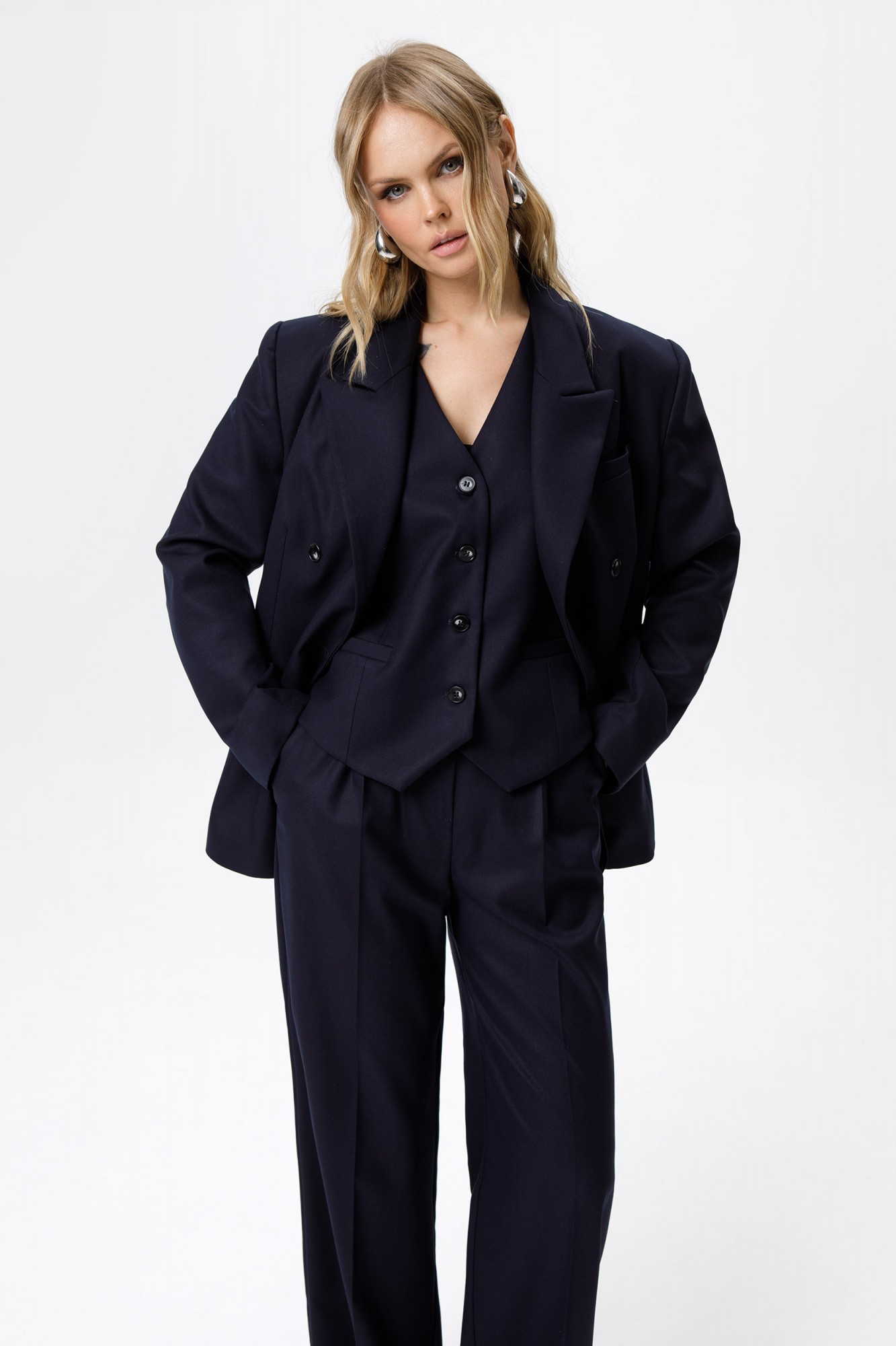 Текстильный костюм-тройка из свободного жакета, полуприлегающего жилета и прямых широких брюк со стрелками. Детали: жакет свободного покроя и полуприлегающего силуэта, двубортная застежка на петли и пуговицы, отрезные бочки, пиджачный воротник, функциональные карманы, жакет на подкладке. Жилет полуприлегающего силуэта, талиевые вытачки, застежка на петли и пуговицы, функциональные карманы, фигурный низ, на подкладке. Брюки с высокой посадкой, притачной пояс со шлевками, передние половины с небольшими застроченными мягкими складками и заутюженными стрелками, застежка на молнию и пуговицу, боковые карманы. Задние части брюк с вытачками и заутюженными стрелками. Пояс брюк прямой, без резинки.