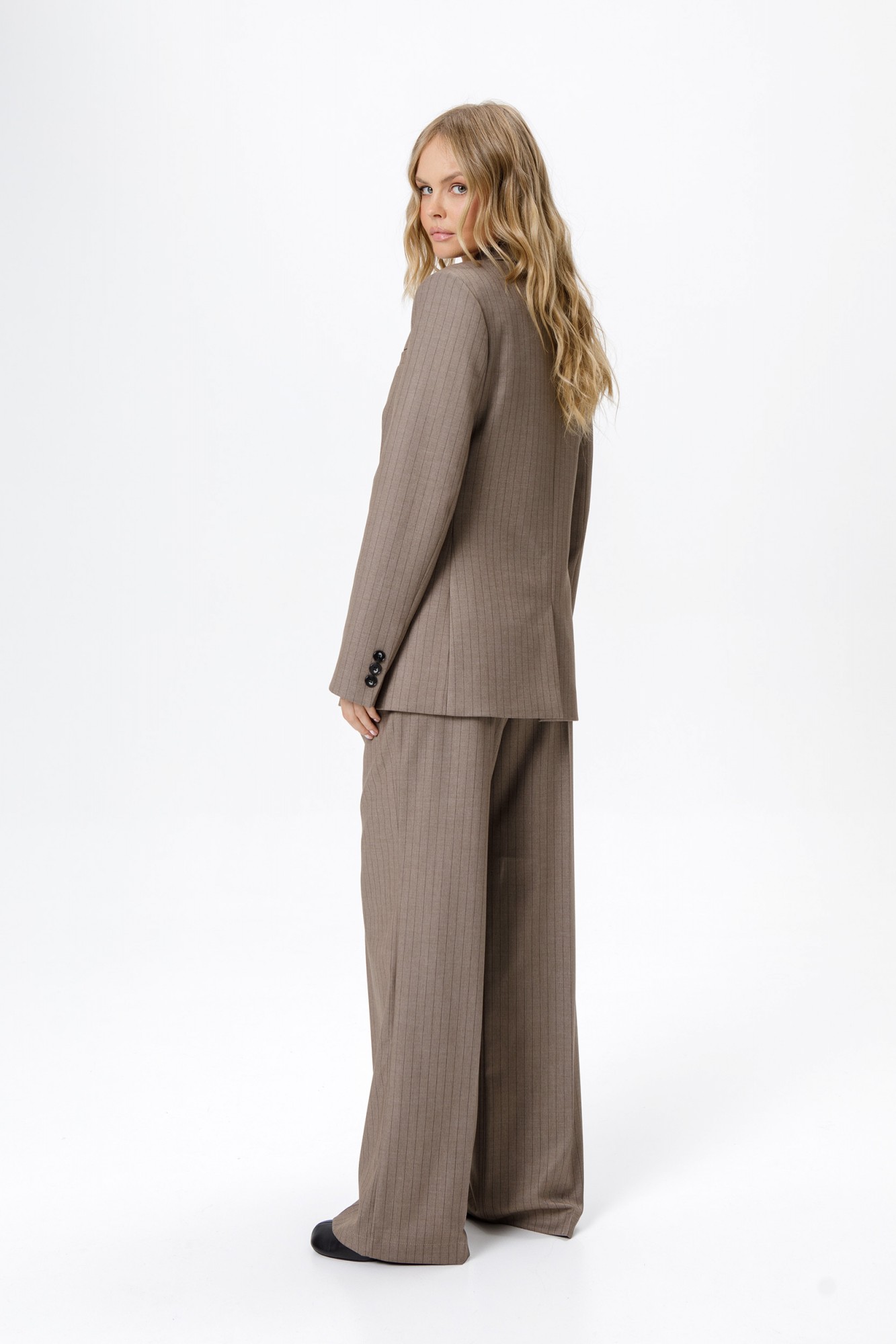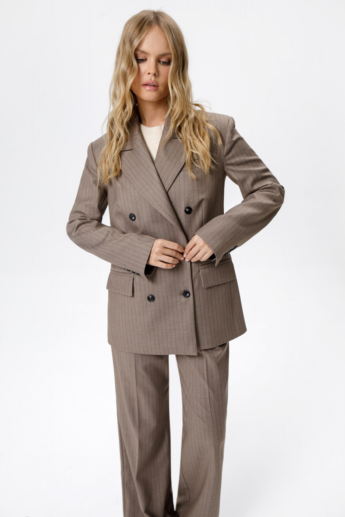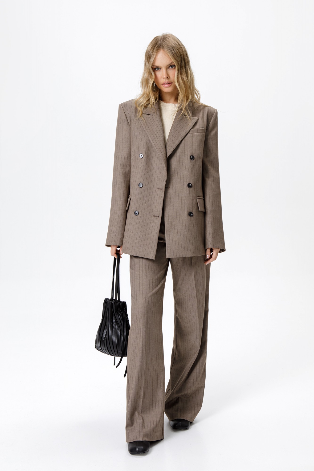 Текстильный костюм-двойка из свободного жакета и прямых широких брюк со стрелками. Детали: жакет свободного покроя и полуприлегающего силуэта, двубортная застежка на петли и пуговицы, отрезные бочки, пиджачный воротник, функциональные карманы, жакет на подкладке. Брюки с высокой посадкой, притачной пояс со шлевками, передние половины с небольшими застроченными мягкими складками и заутюженными стрелками, застежка на молнию и пуговицу, боковые карманы. Задние части брюк с вытачками и заутюженными стрелками. Пояс брюк прямой, без резинки.