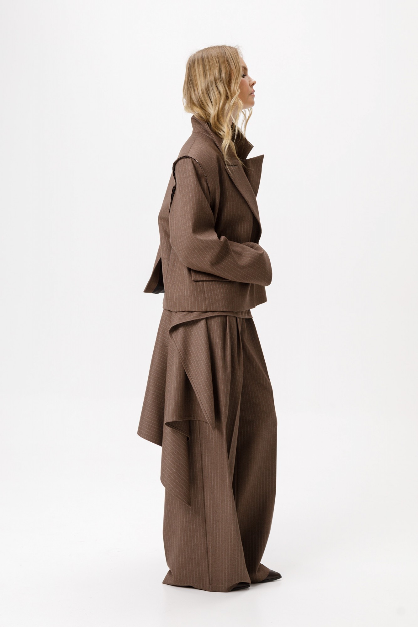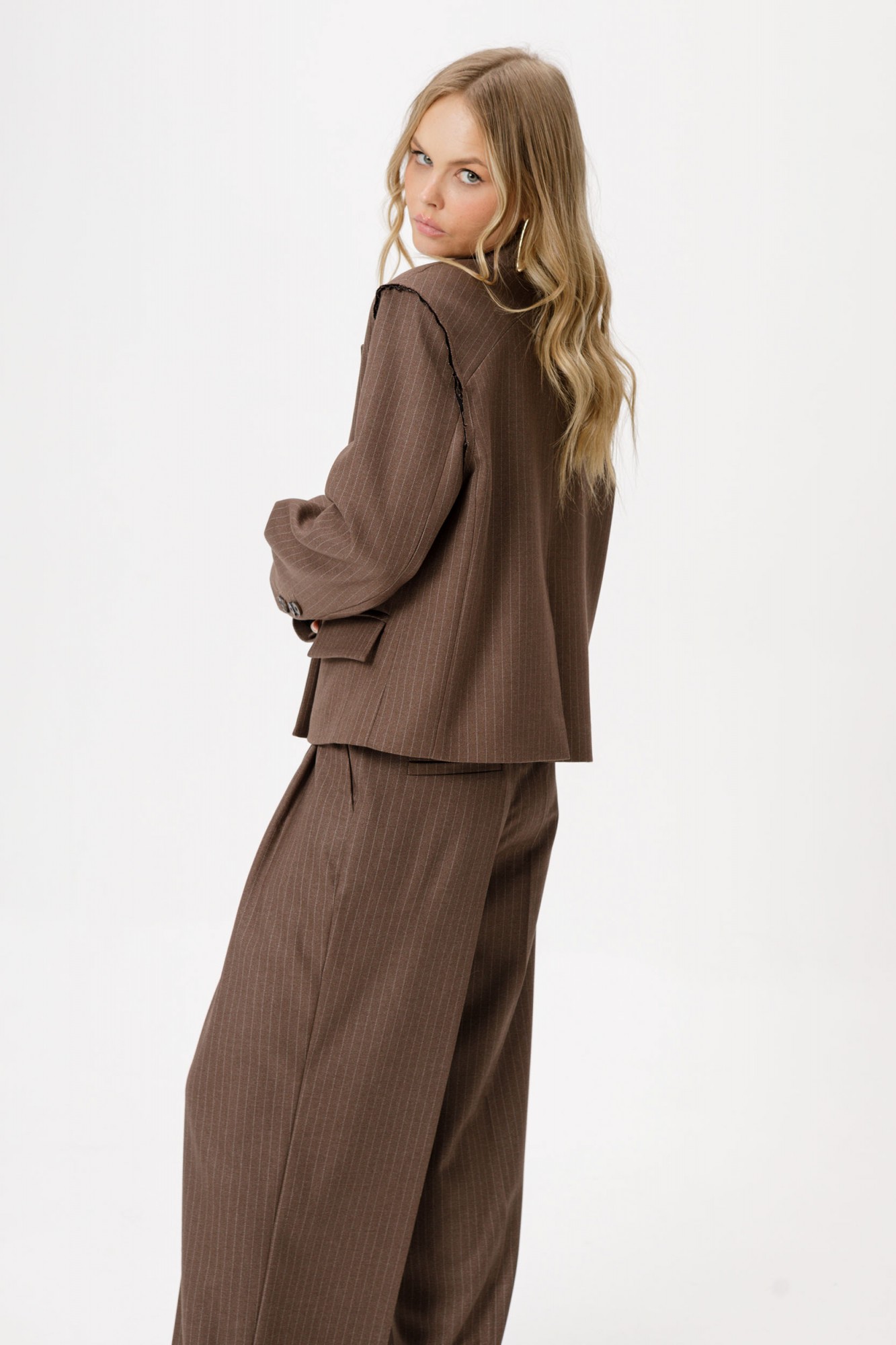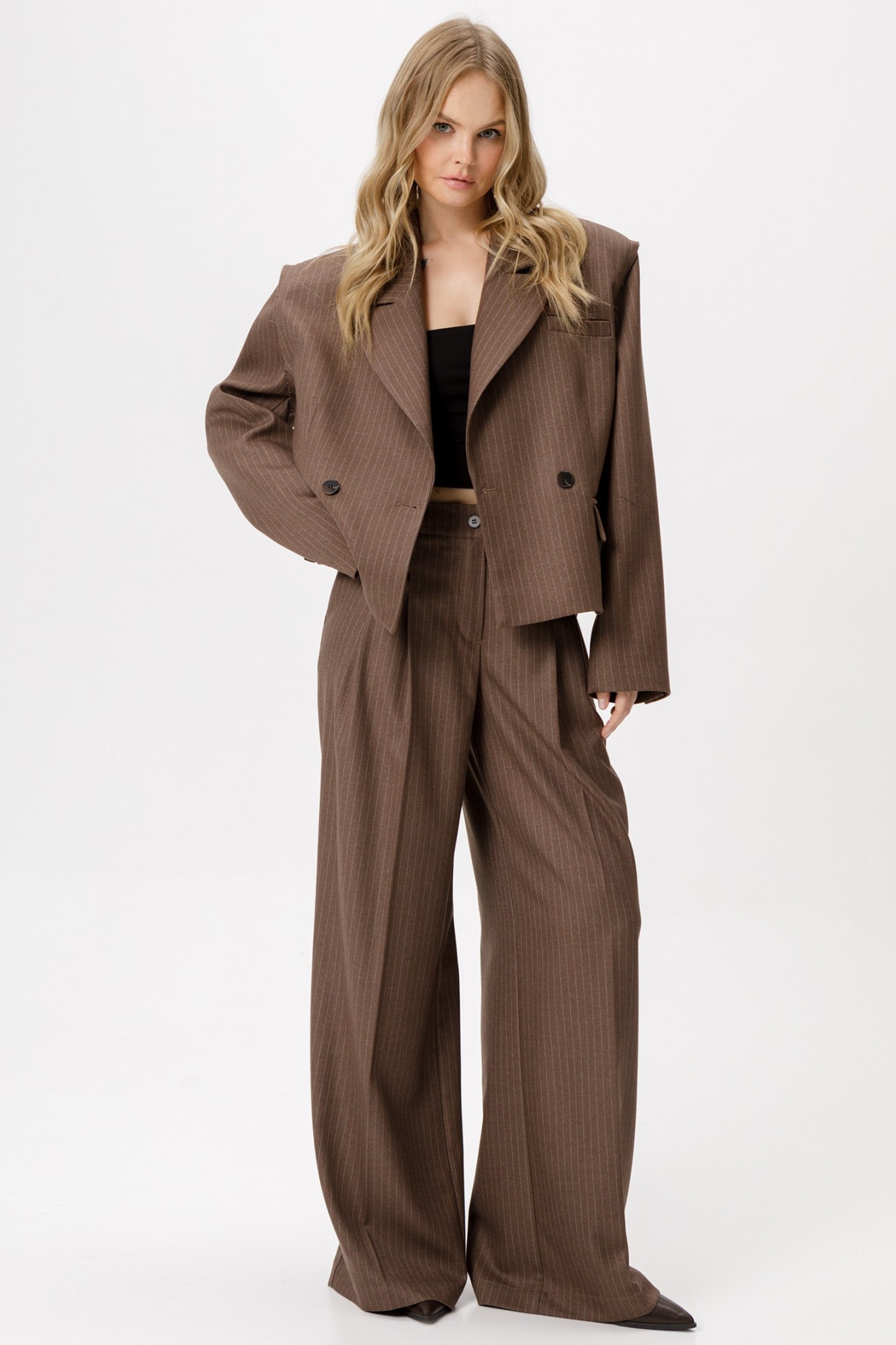 Костюм-двойка из укороченного оверсайз жакета с необработанным краем пройм и широких брюк-палаццо из текстильной ткани в полоску. Детали: жакет прямого силуэта, пиджачный воротник, двубортная застежка на две петли и пуговицы, функциональные карманы, спинка с фигурной кокеткой, рукава втачные, жакет на подкладке. Брюки с притачным поясом со шлевками, складки у пояса, застежка на молнию и пуговицу, боковые карманы, заутюженные стрелки. Задние части брюк с вытачками и имитацией карманов.