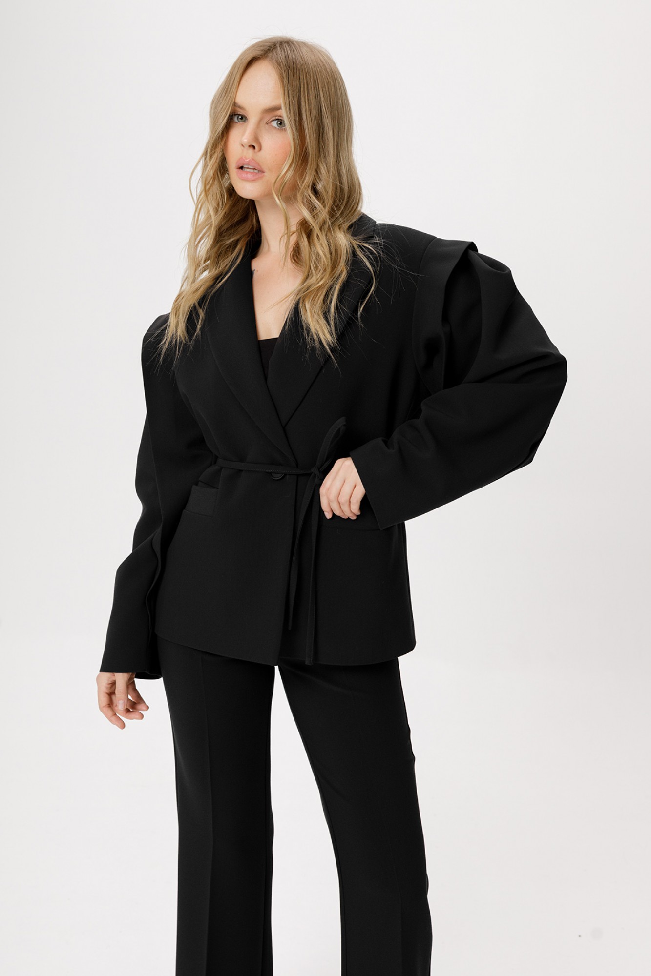 Костюм-двойка из оверсайз жакет со съёмным поясом и облегающих брюк-клёш со стрелками. Детали: жакет прямого силуэта, удлинённая линия плеча, втачной одношовный рукав с ассиметричными складками, функциональные карманы, центральная застёжка на петлю и пуговицу, жакет на подкладке. Брюки с притачным поясом со шлёвками, передние половинки с заутюженными стрелками, наклонные карманы, задние половинки с вытачками и заутюженными стрелками, застёжка на молнию и пуговицу с потайным крючком, пояс брюк прямой без резинки.