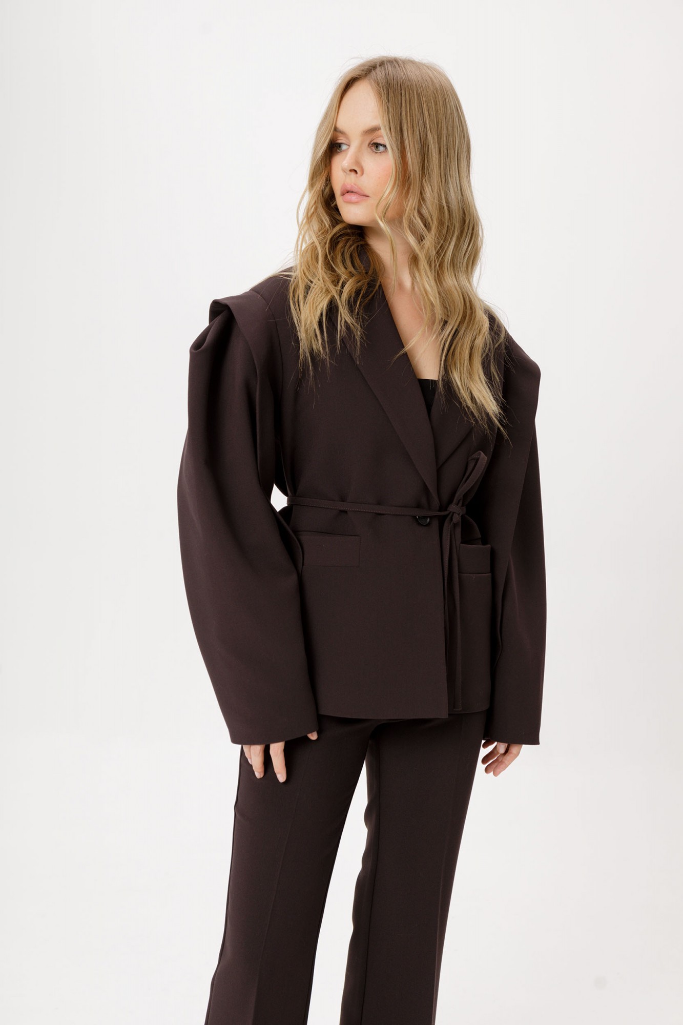 Костюм-двойка из оверсайз жакет со съёмным поясом и облегающих брюк-клёш со стрелками. Детали: жакет прямого силуэта, удлинённая линия плеча, втачной одношовный рукав с ассиметричными складками, функциональные карманы, центральная застёжка на петлю и пуговицу, жакет на подкладке. Брюки с притачным поясом со шлёвками, передние половинки с заутюженными стрелками, наклонные карманы, задние половинки с вытачками и заутюженными стрелками, застёжка на молнию и пуговицу с потайным крючком, пояс брюк прямой без резинки.