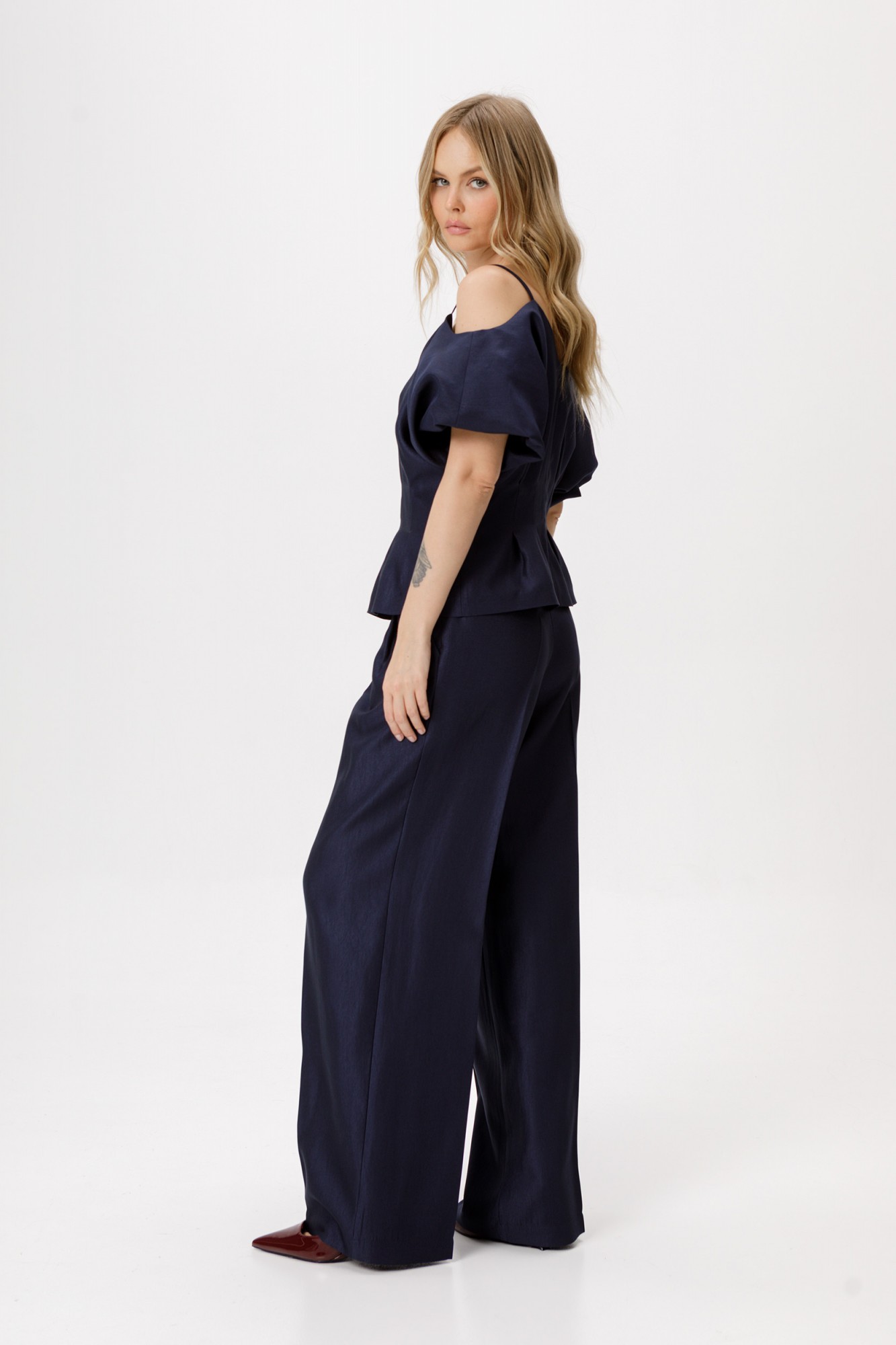 Костюм-двойка из приталенной блузы со складками и широких брюк-палаццо со стрелками. Детали: блуза приталенного силуэта с застроченными складками по линии талии, V-образный вырез переда и спинки, рукава короткие цельнокроеные с вырезом по плечу, застежка на потайную молнию по спинке, на подкладке. Брюки с притачным поясом со шлевками, складки у пояса, застежка на молнию и пуговицу, боковые карманы, заутюженные стрелки. Задние части брюк с вытачками и имитацией карманов.