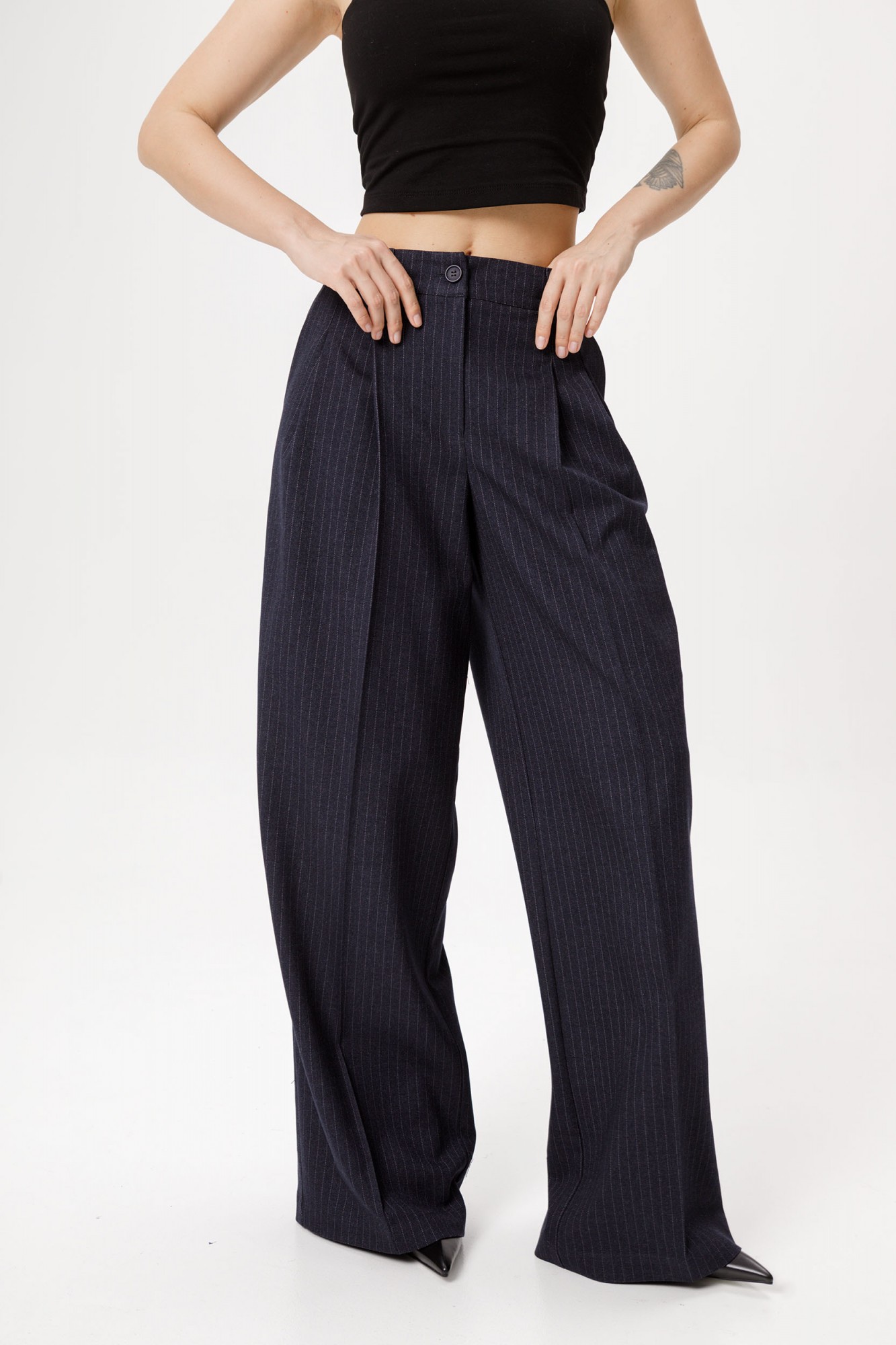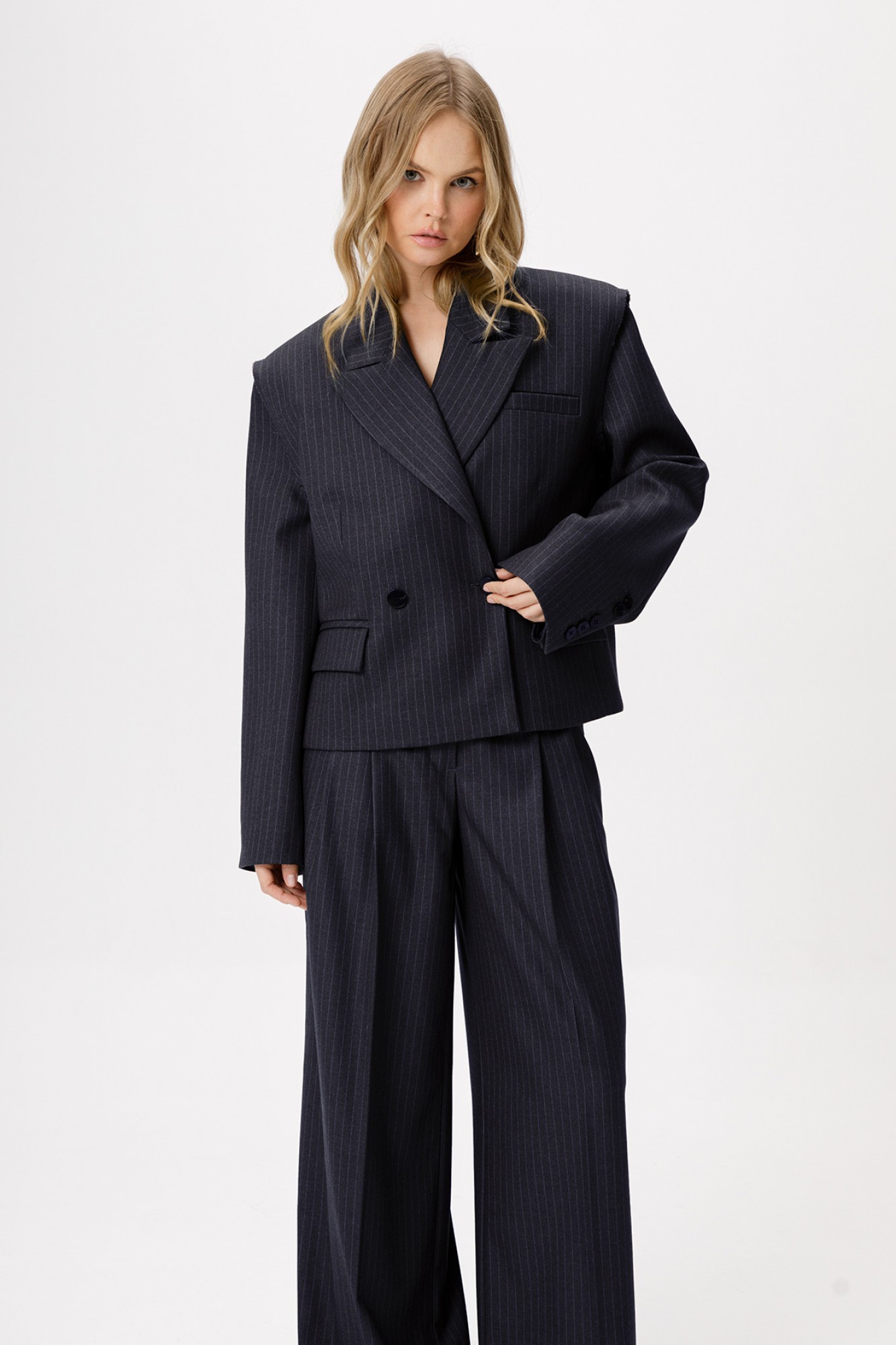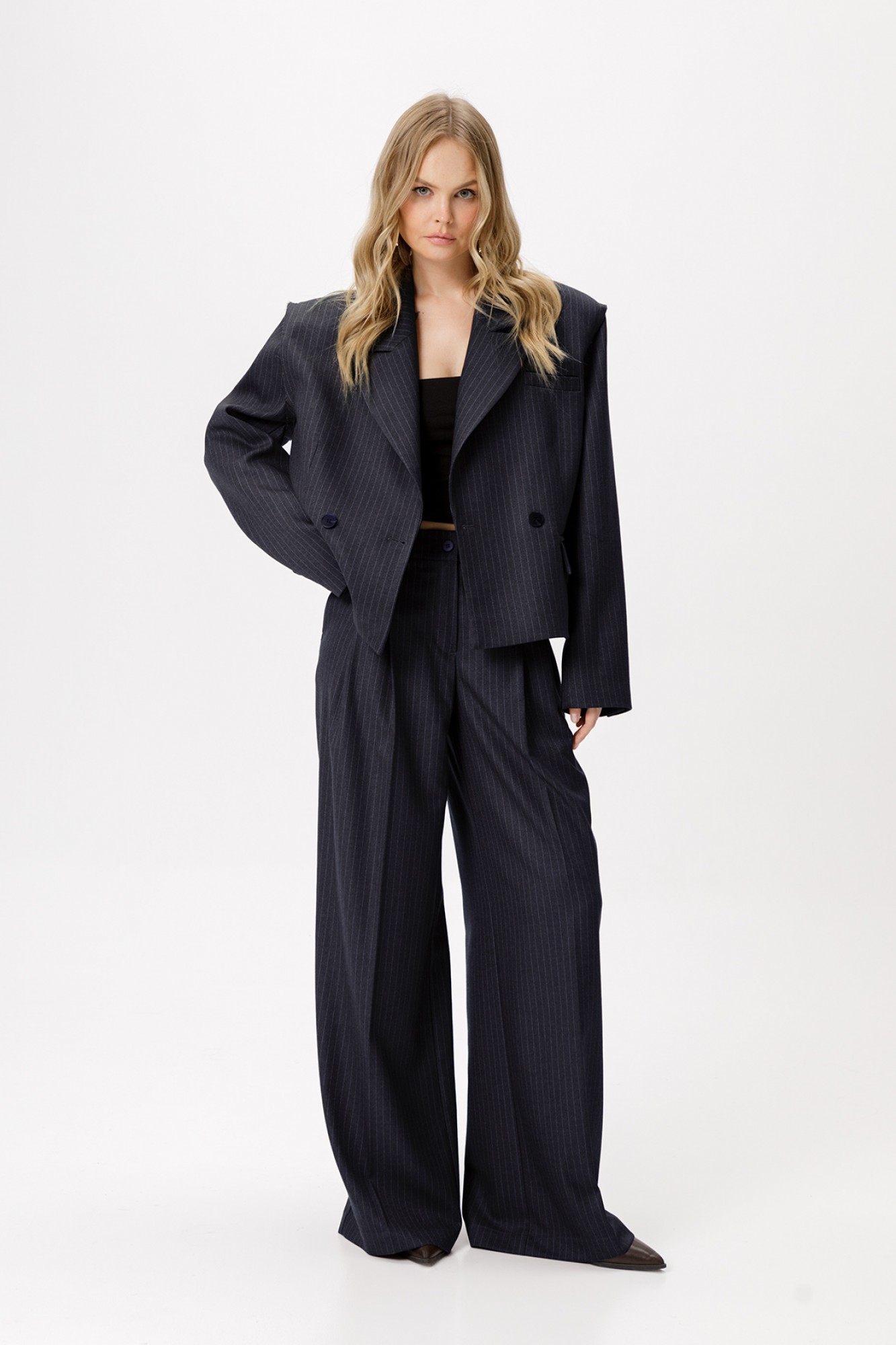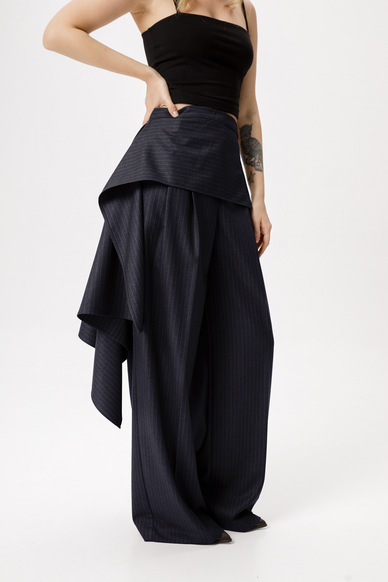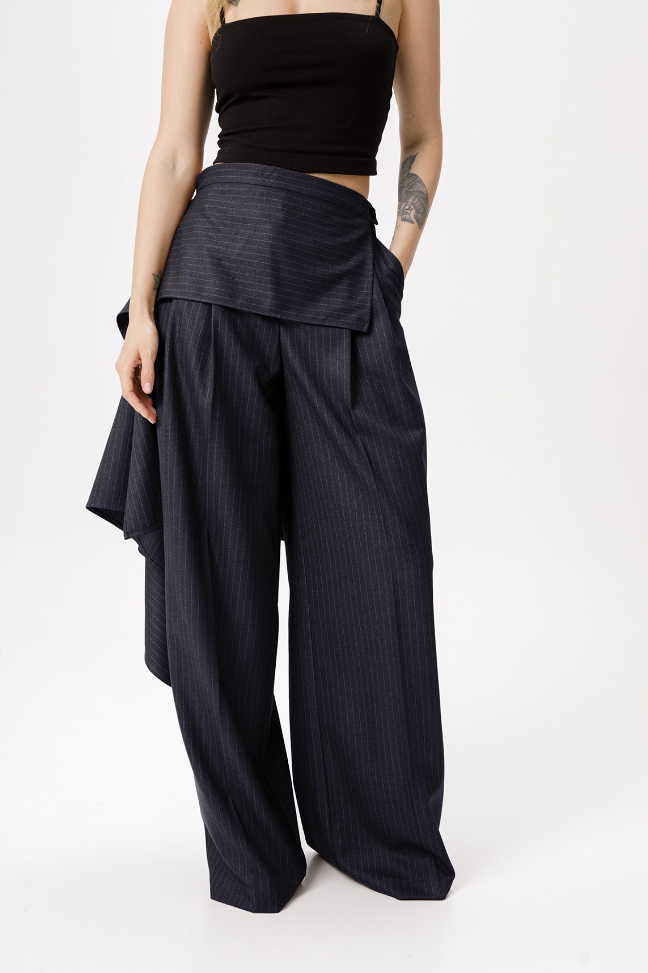 Костюм-тройка из укороченного оверсайз жакета с необработанными проймами, широких брюк-палаццо и съемной юбки-баски килт из текстильной ткани в полоску.