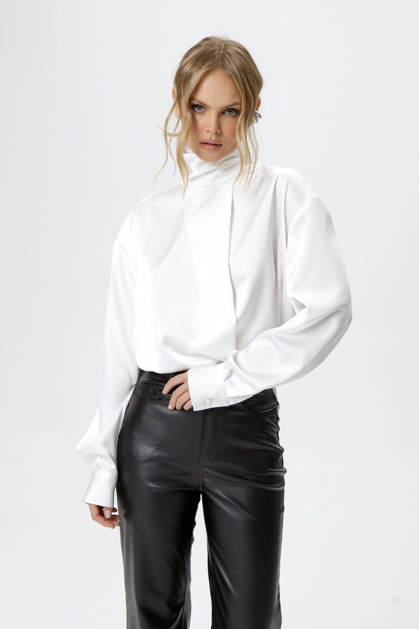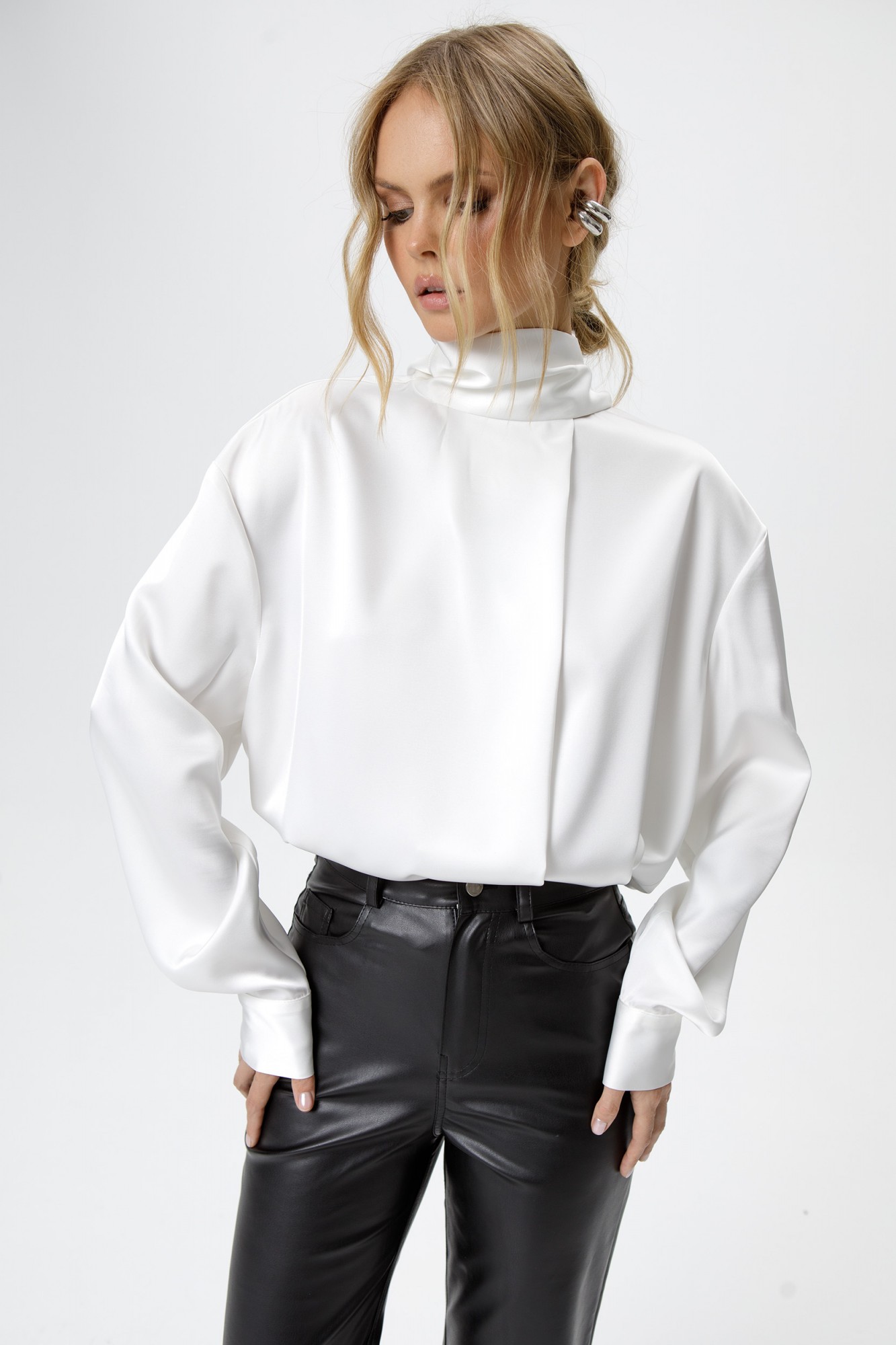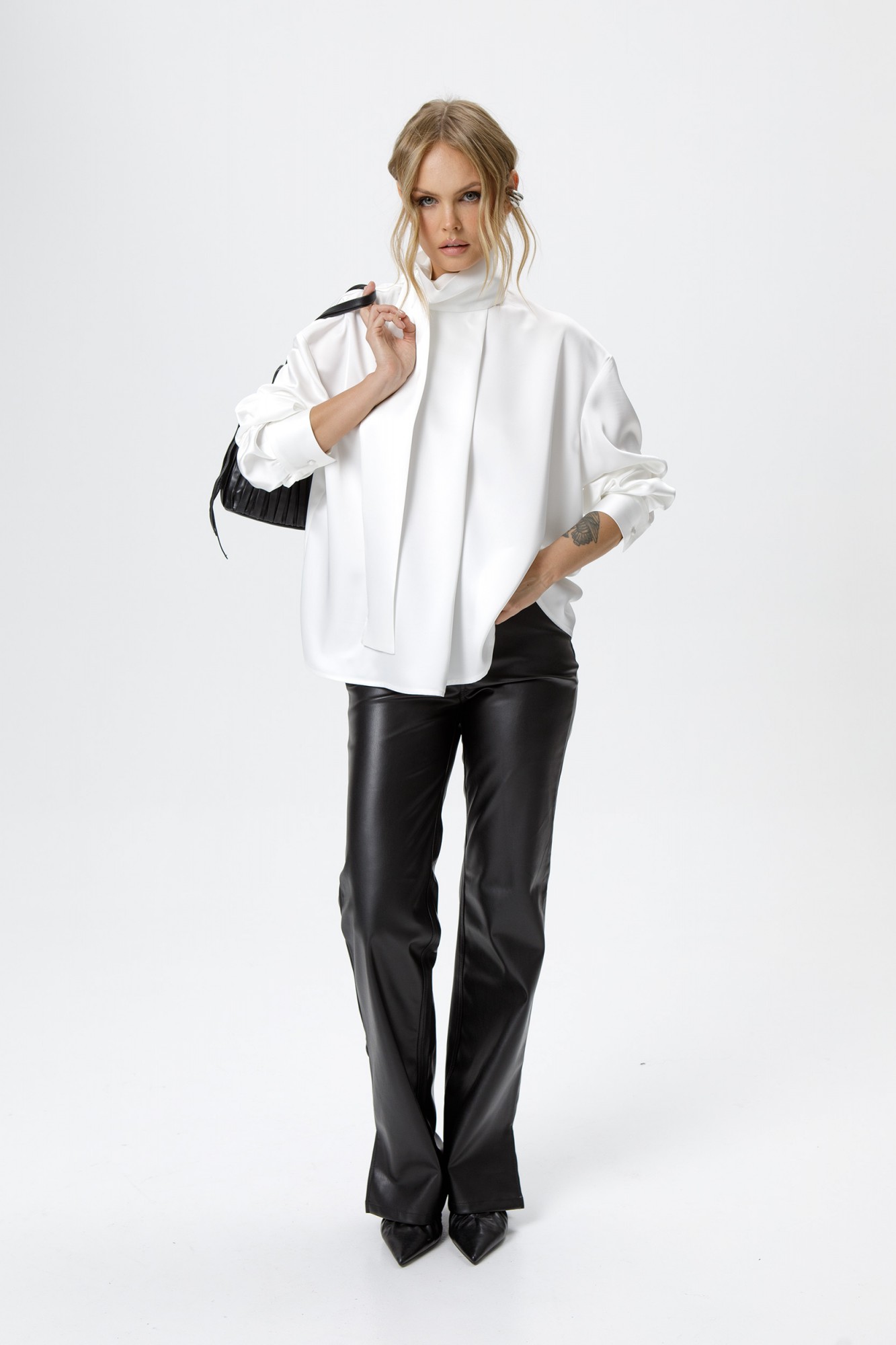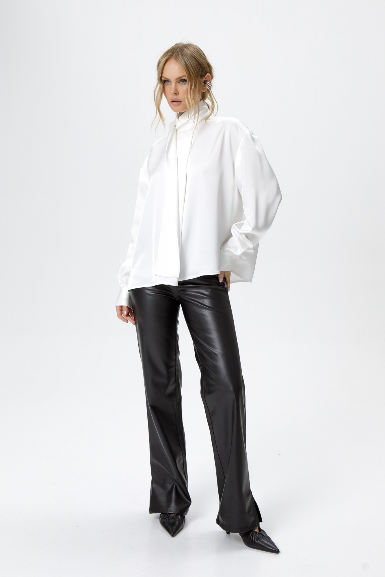 Комплект-двойка из свободной блузы со стойкой-бантом и прямых брюк из экокожи.