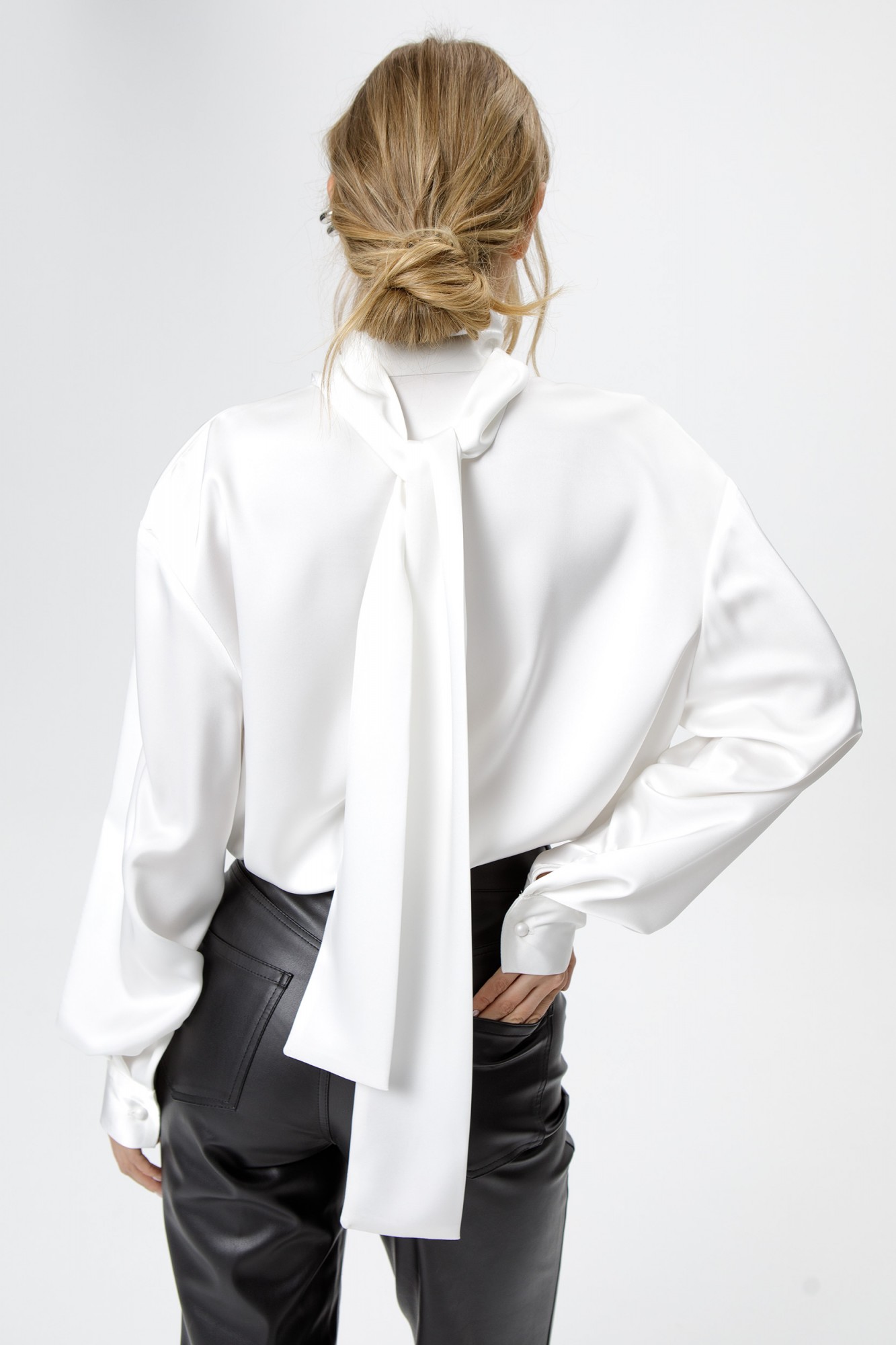 Детали: блуза прямого силуэта, высокий воротник стойка с широкими длинными завязками, блуза с глубокой складкой по переду, удлинённая линия плеча, рукава с притачными манжетами и застёжкой на пуговицу.