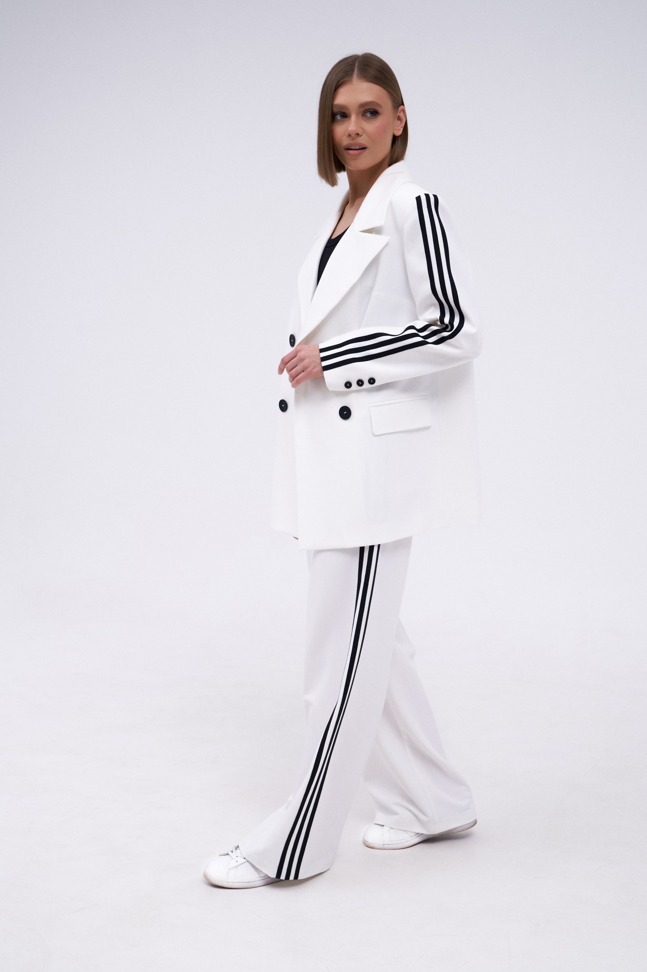 Брючный костюм - это всегда стильно! Элегантный дизайн комплекта с брюками от Pur Pur подарит комфорт и уверенность в себе. Основные особенности модели: двубортный жакет на подкладке, брюки широкие прямые, на притачном поясе на резинке, с карманами. Главная изюминка этого комплекта: декоративные полоски на рукавах и брюках, которые добавят больше стиля и акцент вашему образу. Такой костюм можно носить, сочетая с другими вещами гардероба, создавая новые образы, подойдет для офиса, для праздника, на каждый день, для прогулок, для вечеринки, для работы.