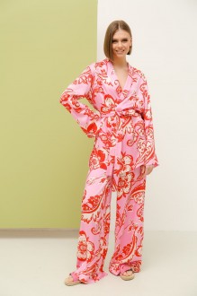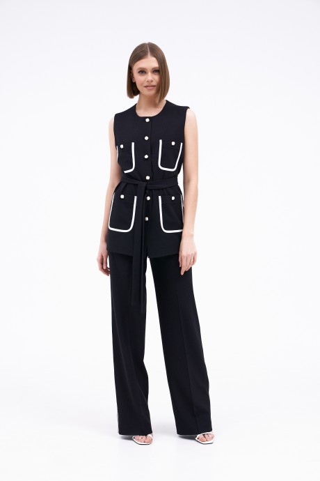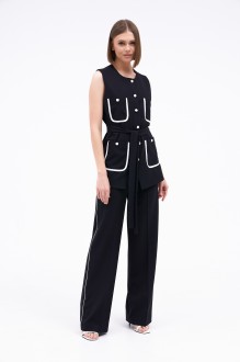 Элегантный 2-х предметный комплект, состоящий их жилета и брюк. Жилет полуприлегающего силуэта с центральной застежкой на петли и пуговицы. Спереди обработаны накладные карманы по линии груди и в области бедер с контрастной окантовкой. Жилет дополнен поясом. Срез обтачки спинки и подборта окантован, без подкладки. Брюки с посадкой на талии, прямого силуэта. В боковых швах контрастный кант. По центру задних половинок застежка на потайную молнию.
