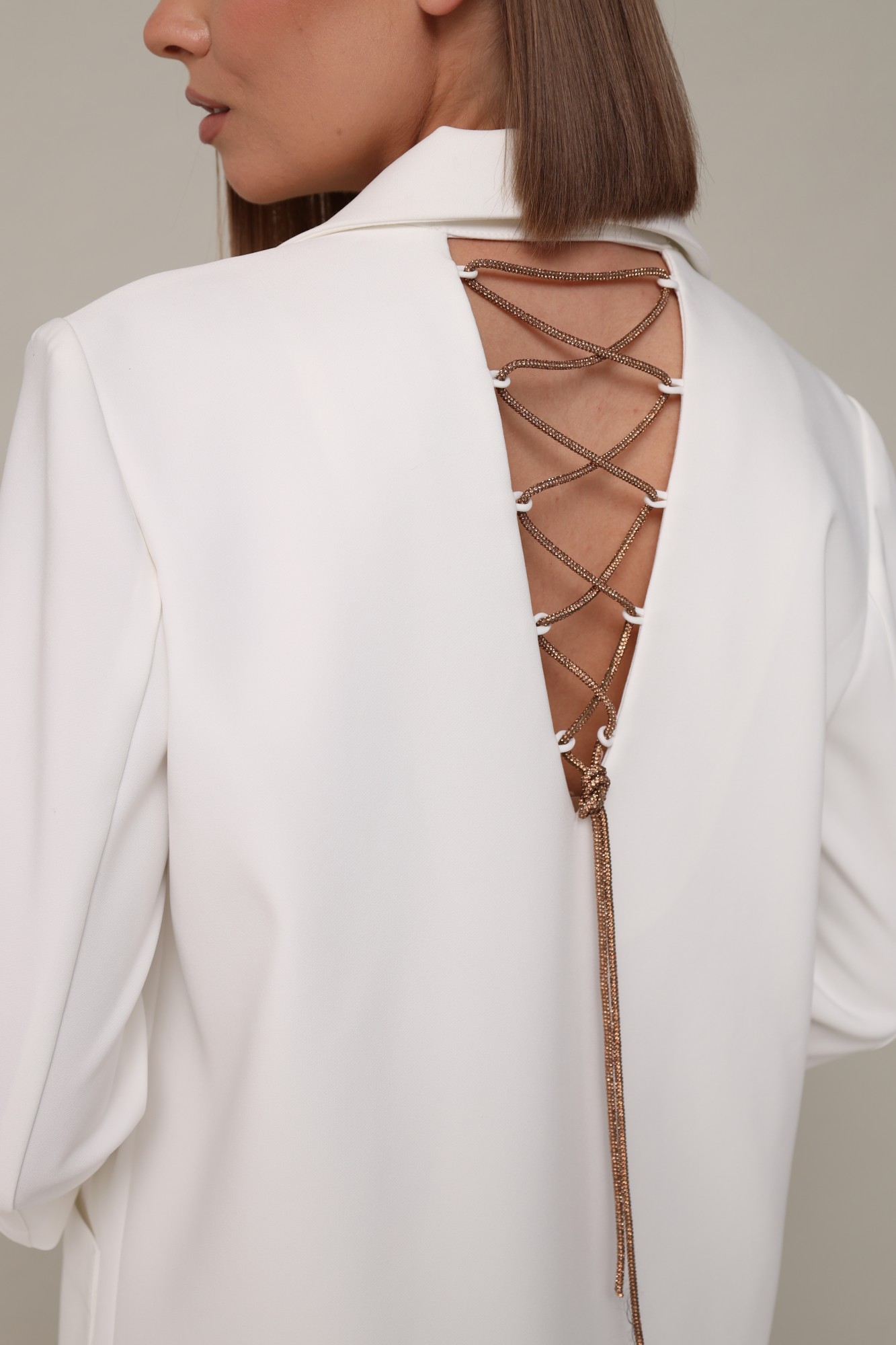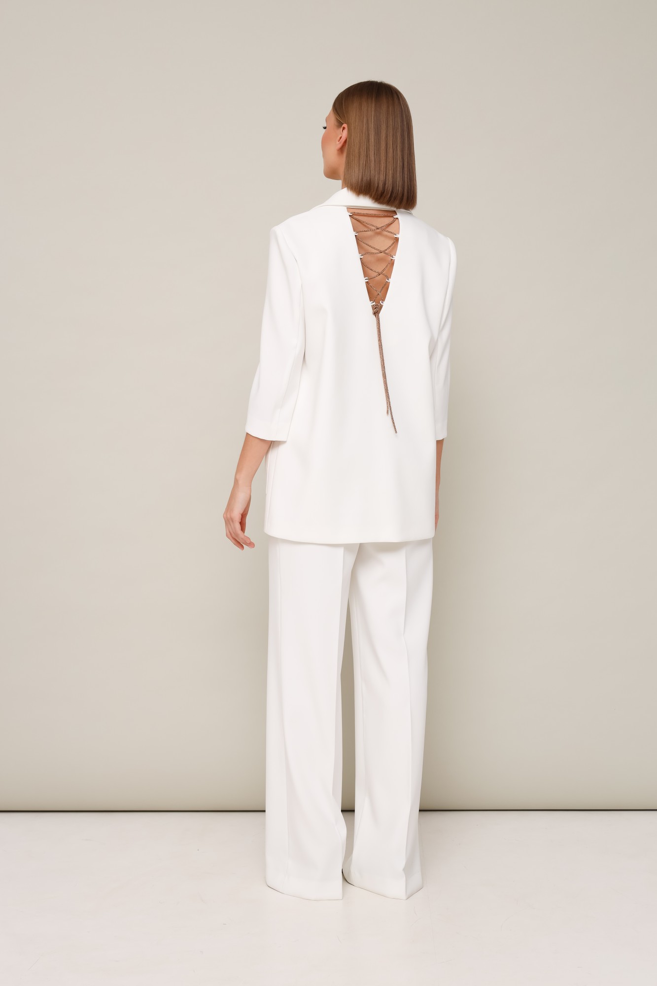 Стильный комплект, состоящий из жакета и брюк. Жакет современного прямого силуэта из костюмной ткани с центральной застёжкой на петли и пуговицы. Воротник пиджачного типа с отложными лацканами. Спереди обработаны накладные карманы. Спинка с V-образным вырезом, который зашнурован акцентной декоративной тесьмой. Рукава втачные, длина 3/4. Изделие на х/б подкладке. Брюки прямого силуэта из костюмной ткани с заутюженными стрелками. Пояс притачной с застежкой на пуговицу и тесьму-молнию, сзади на резинке.