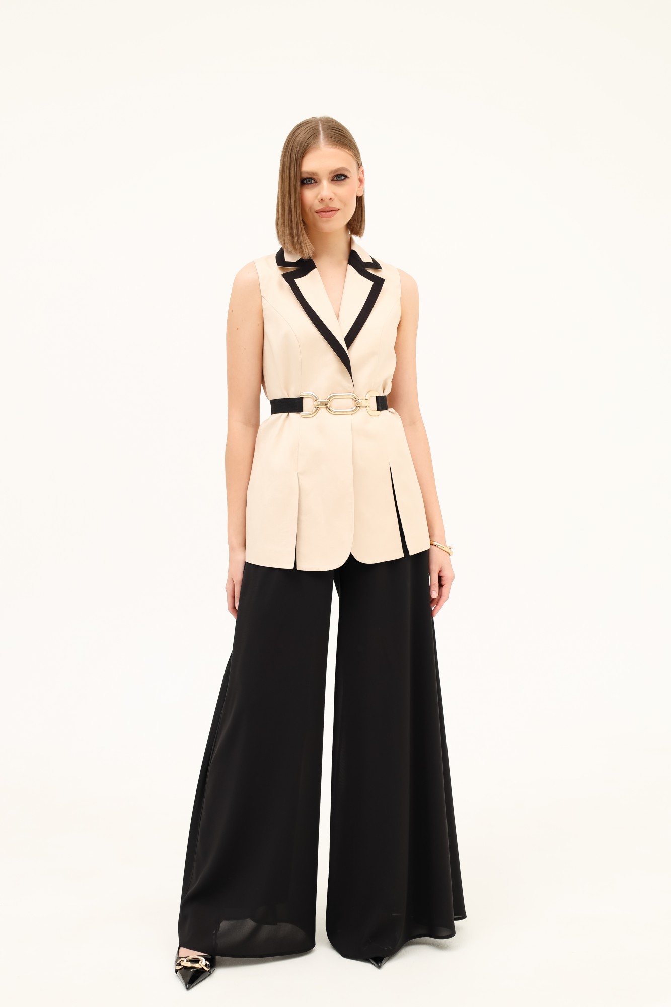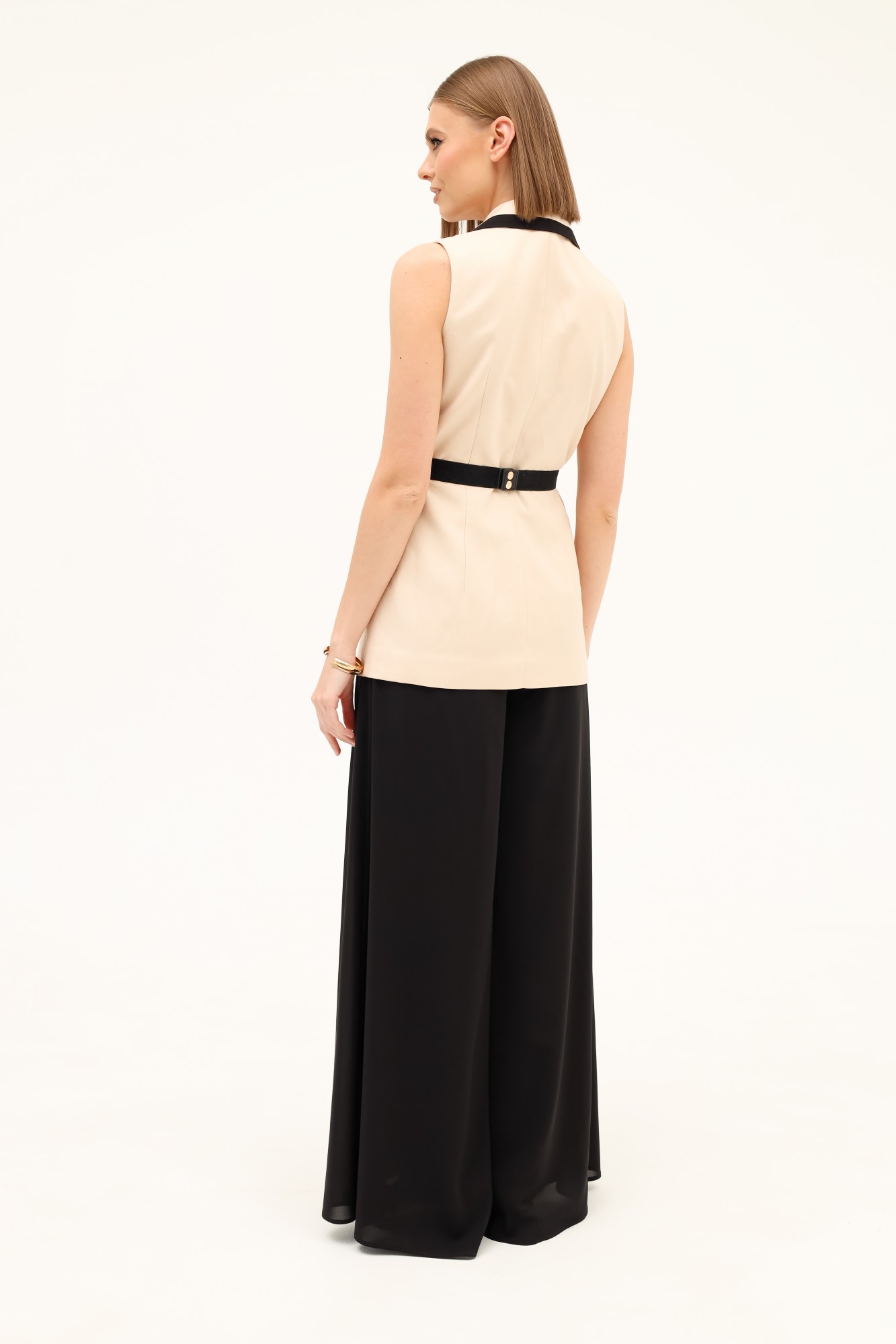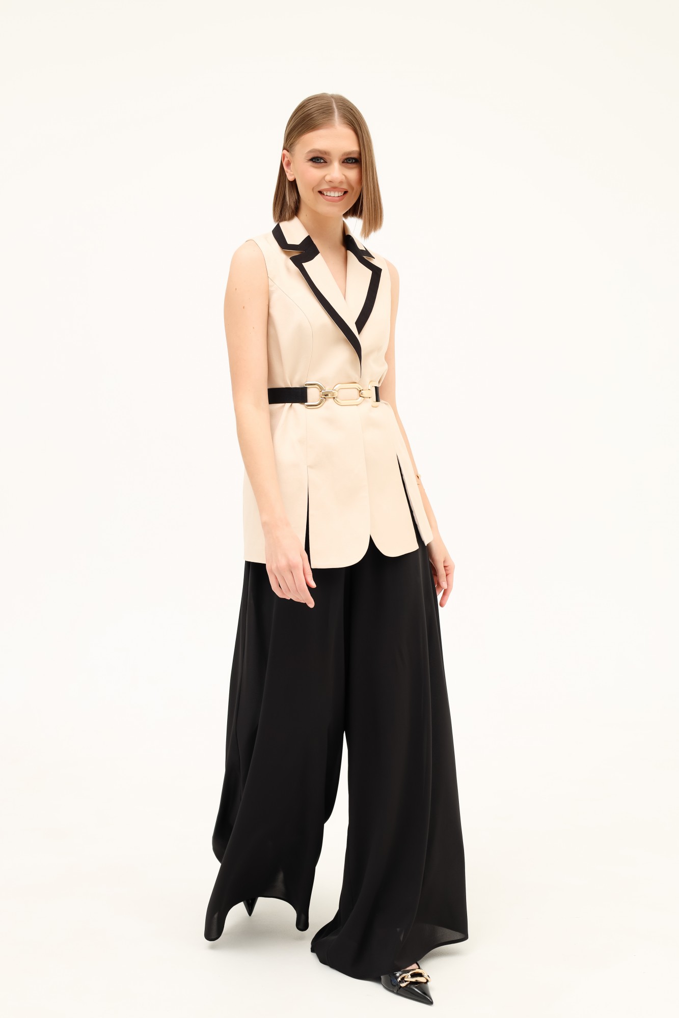 Элегантный комплект, состоящий из жилета и брюк-палаццо. Жилет полуприлегающего силуэта на х/б подкладке с воротником пиджачного типа с контрастной окантовкой. Центральная застежка на потайные кнопки. Перед с рельефами, переходящими в разрезы в нижней части жилета. Струящиеся брюки-палаццо свободного силуэта с расклешением от бедра, на притачном поясе, с застёжкой на потайную молнию в боковом шве. Брюки на частичной подкладке. В комплекте прилагается акцентный пояс на резинке с застежкой на кнопки.